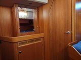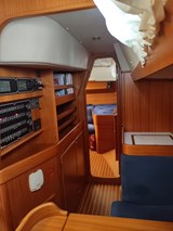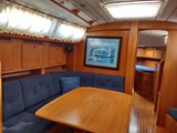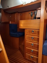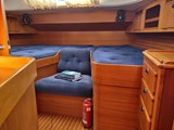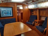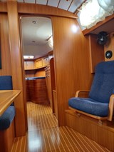 On the port side a 7’ long L-Sofa that has hinged backrests with utilized space behind for storage. On starboard side has comfortable easy chairs for reading, that Hallberg Rassy is famous for. Storage beneath both chairs. Headroom in saloon 1.97 m