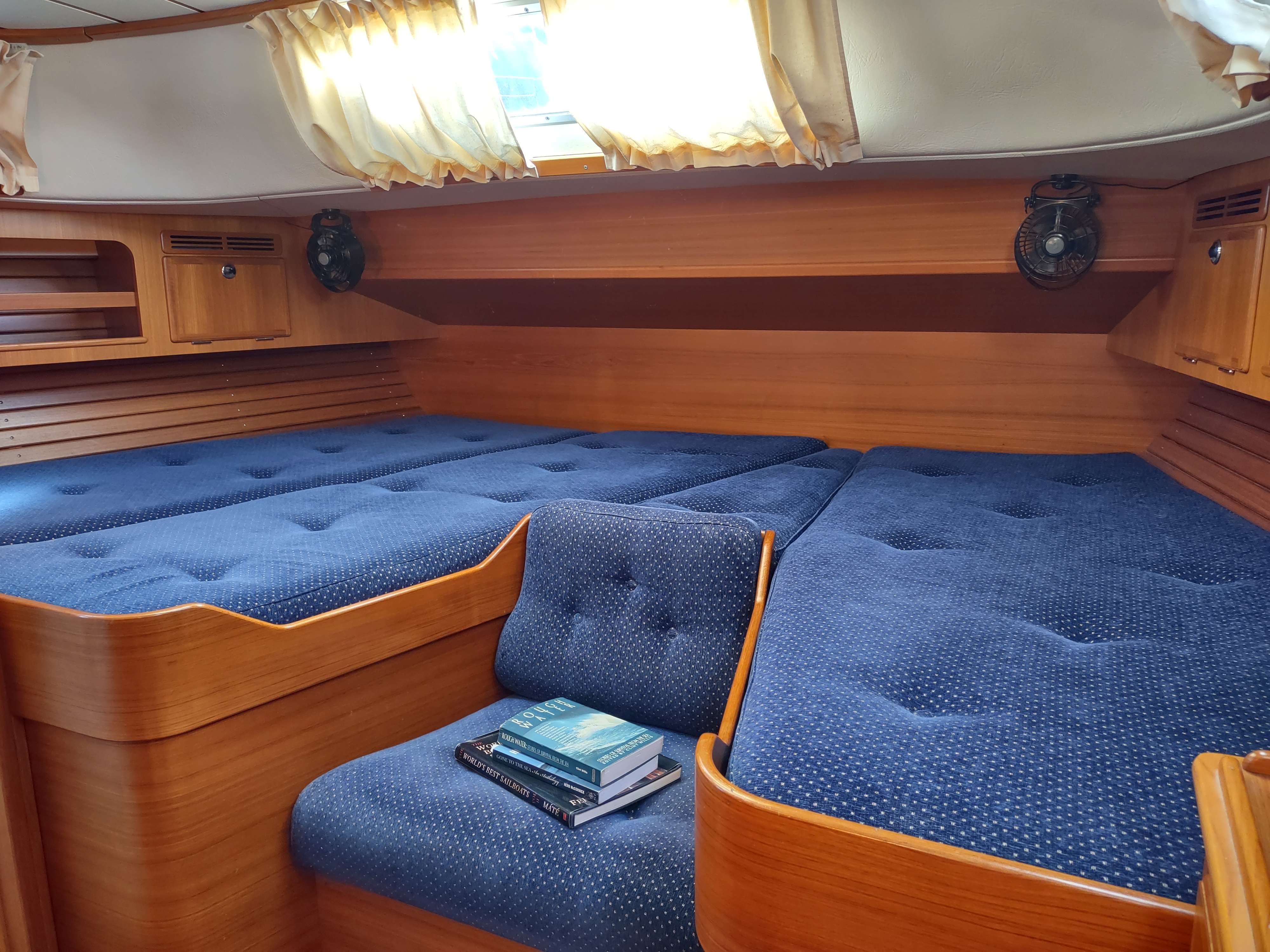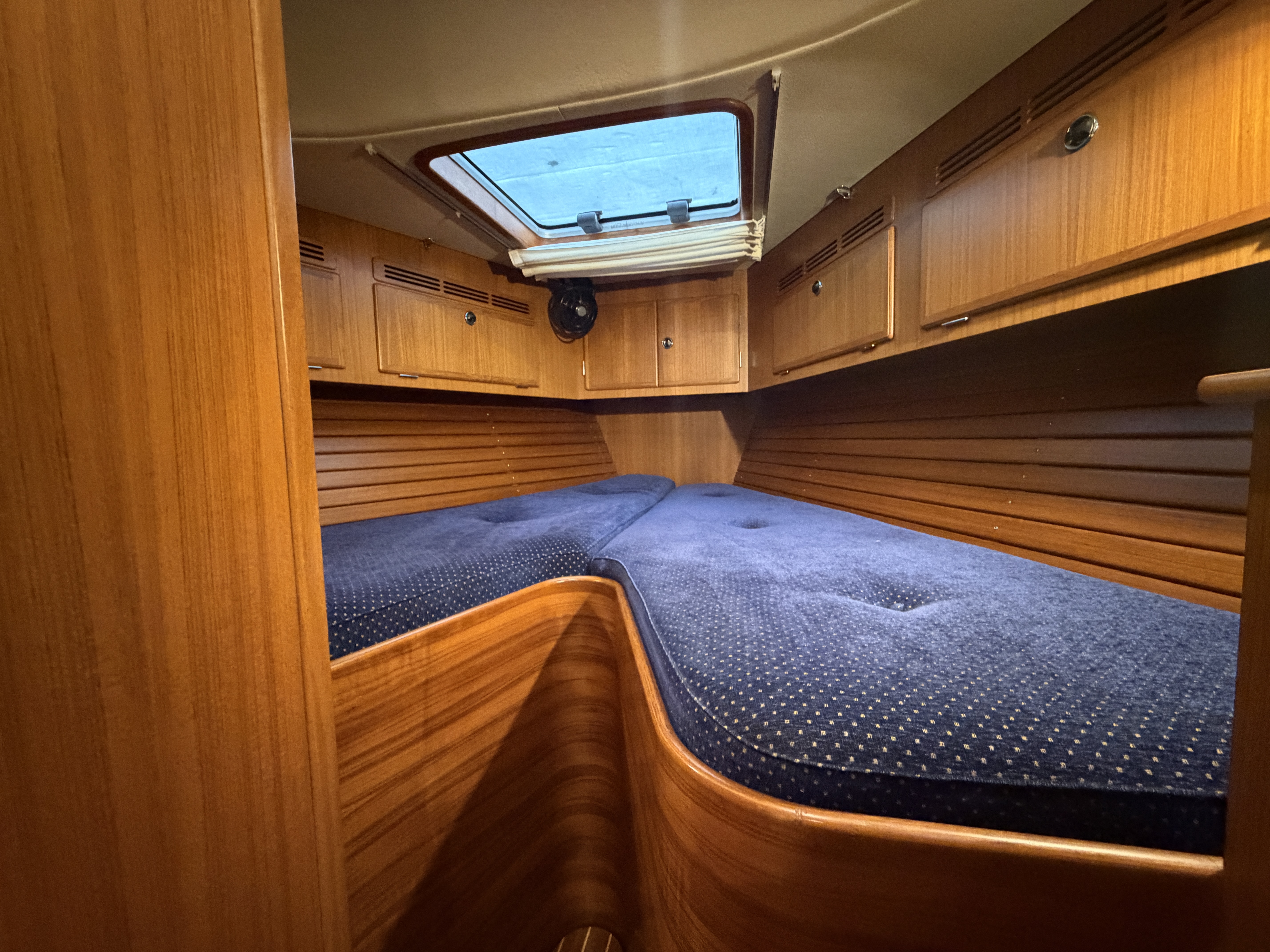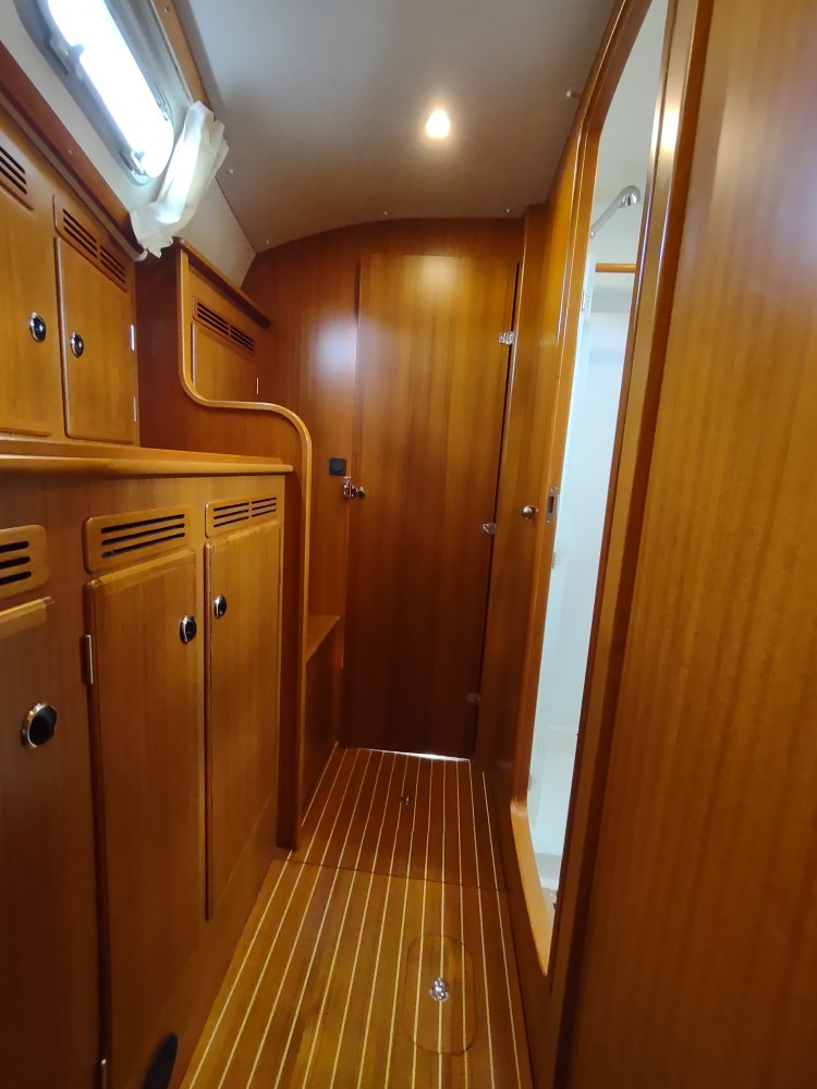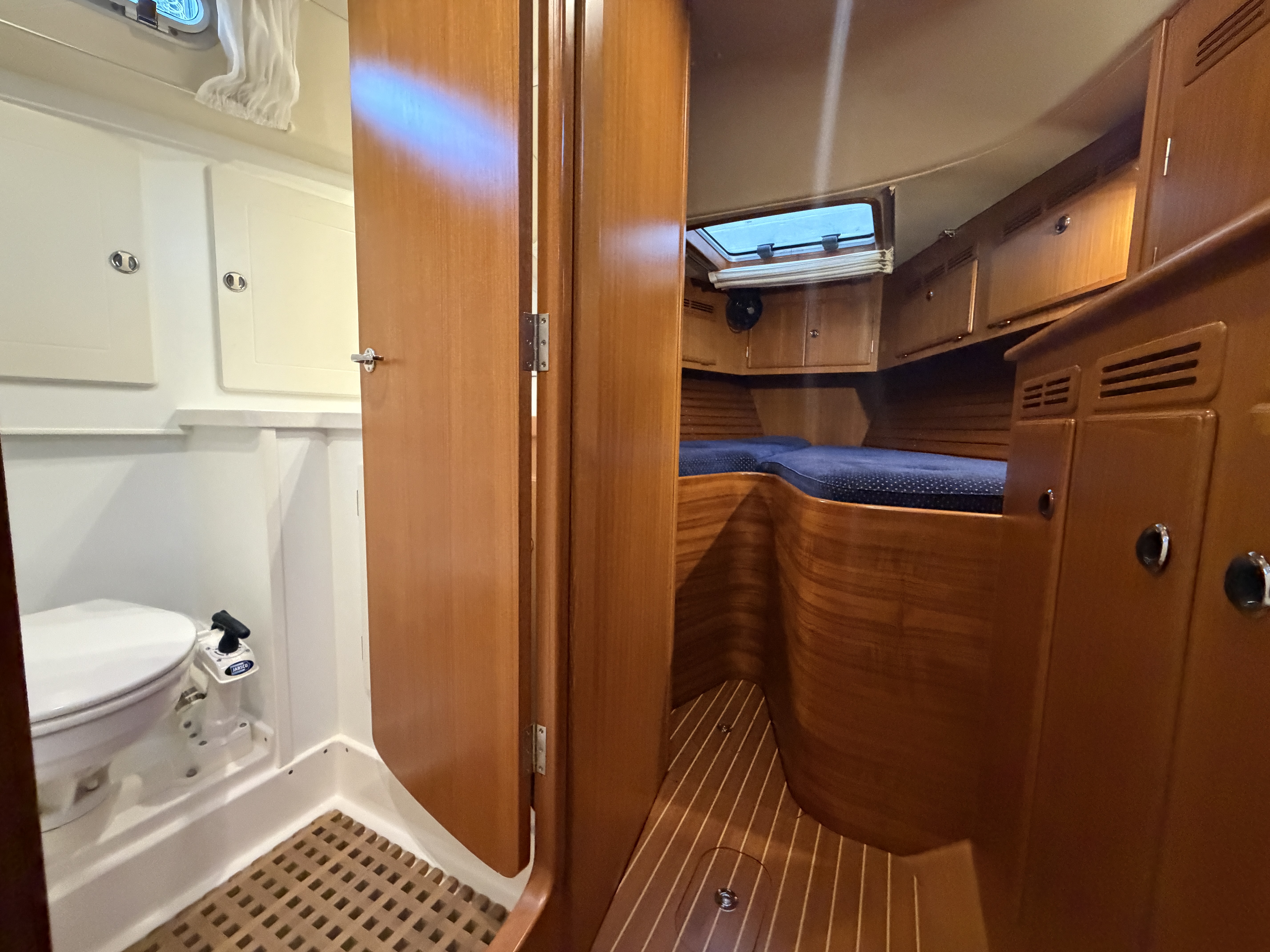 There are two armchairs in the salon, with settee and fixed teak table. All interior woodwork in warm satin finished teak; a rare, significant upgrade, that can’t be duplicated as teak boats are no longer produced by Hallberg Rassy. Flat locker doors with ventilation openings and the teak grain running continuous thru the wall panels. Floor is varnished teak with inlaid holly strips. Cushions on all berths 5 inch thick and resting on unvarnished, well-ventilated boards to avoid condensation. Aft cabin berths have additional memory foam mattress toppers. Two private cabins, each with 3 pc heads. Customized one floor living plan. Hand holds are in all the right positions. All portholes open and are fitted with curtains. Curtains also under the hatches.