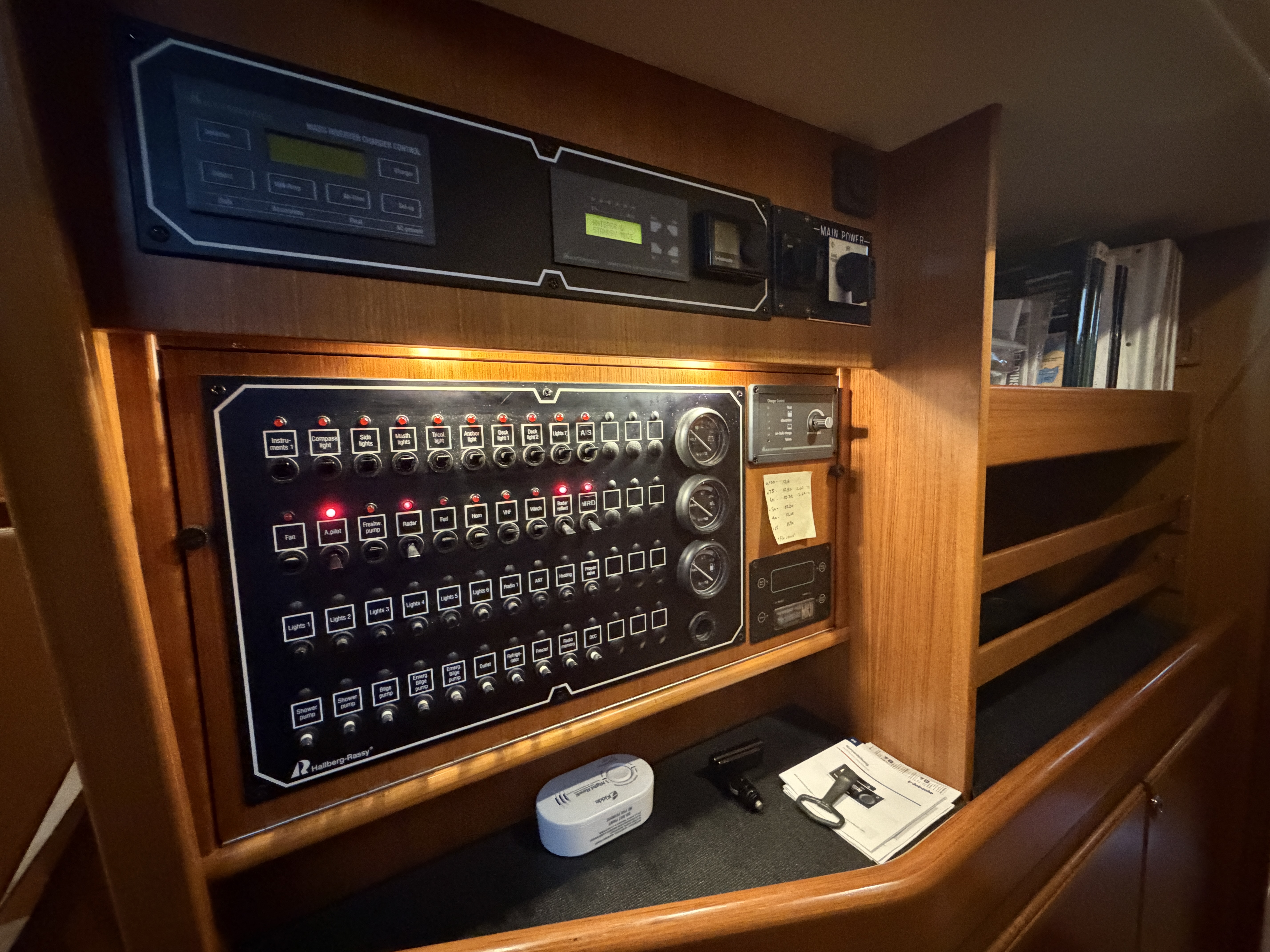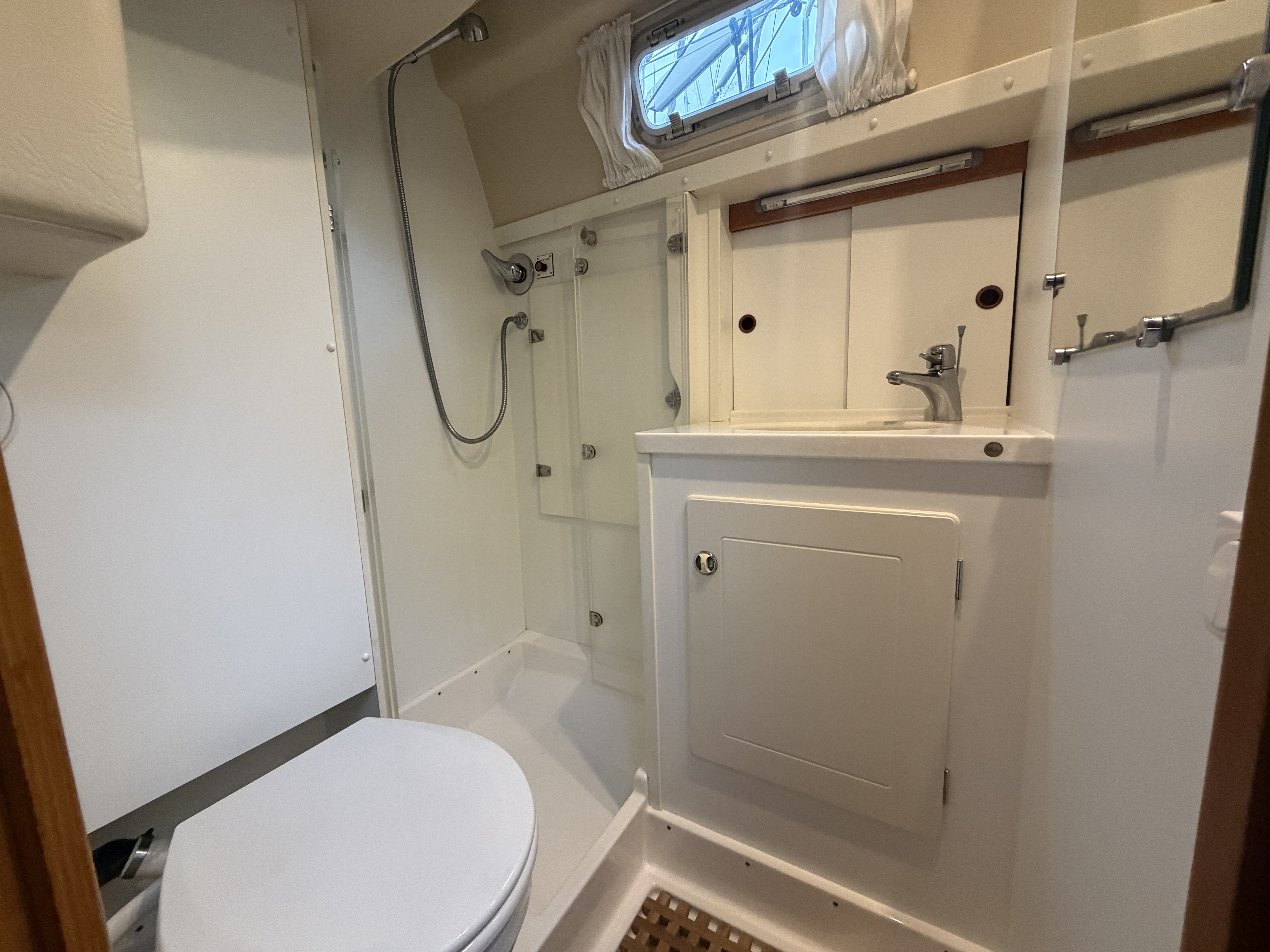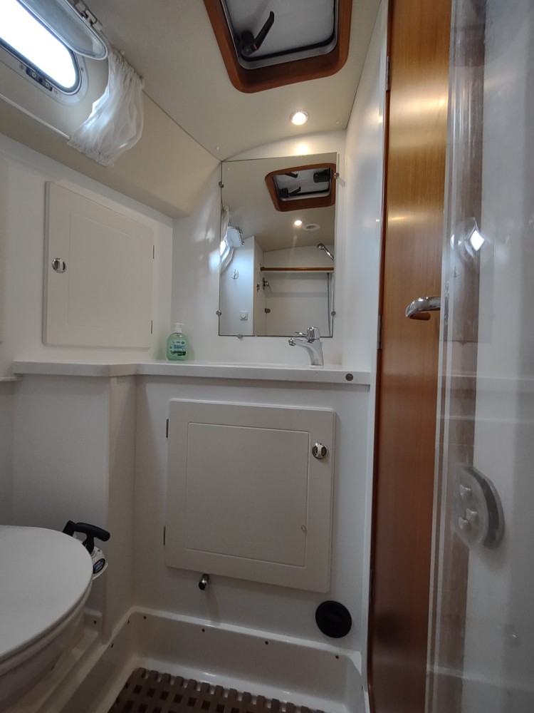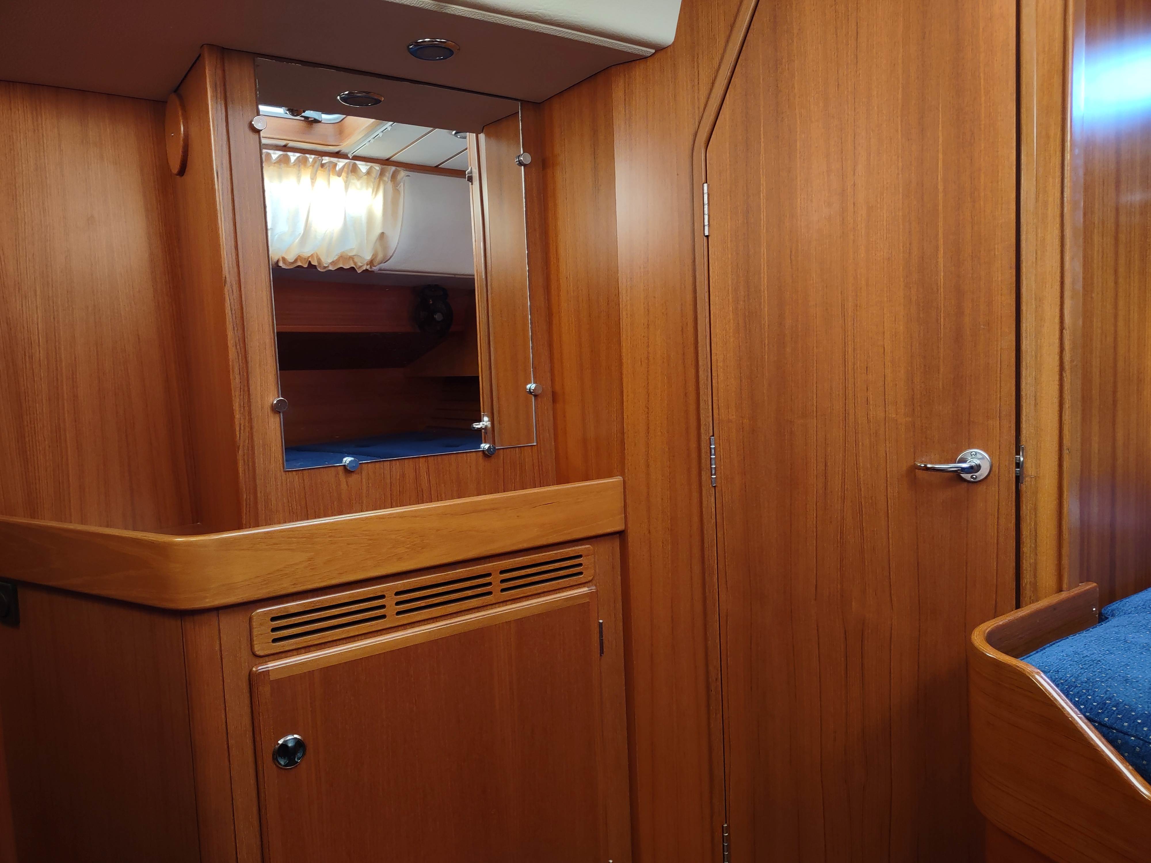 There are two armchairs in the salon, with settee and fixed teak table. All interior woodwork in warm satin finished teak; a rare, significant upgrade, that can’t be duplicated as teak boats are no longer produced by Hallberg Rassy. Flat locker doors with ventilation openings and the teak grain running continuous thru the wall panels. Floor is varnished teak with inlaid holly strips. Cushions on all berths 5 inch thick and resting on unvarnished, well-ventilated boards to avoid condensation. Aft cabin berths have additional memory foam mattress toppers. Two private cabins, each with 3 pc heads. Customized one floor living plan. Hand holds are in all the right positions. All portholes open and are fitted with curtains. Curtains also under the hatches.