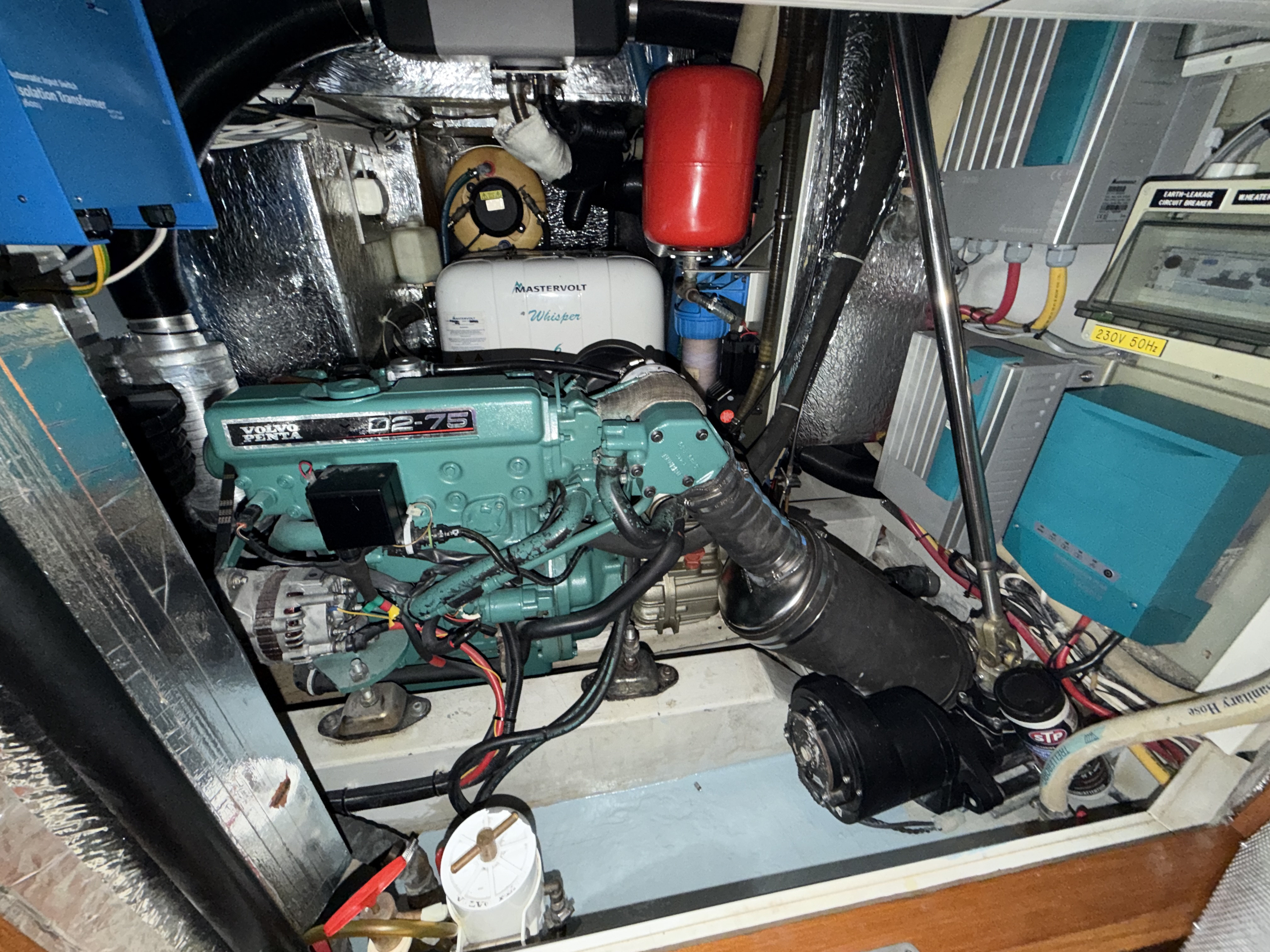 Engine Volvo Penta D2-75, 55KW/75 HP 4-cylinder 2.2 Liters cylinder volume. Mounted with four rubber feet on strong foundations to avoid vibration and noise. Hydraulic transmission. Water-cooled rubber exhaust pipe. Freshwater cooled engine. The hot freshwater circuit is let into a well insulated hot water tank The engine is served by a separate 12V battery. There is a large filter for colling water. The bilge pump has been installed in a position where it can be cleaned even in extremely bad weather conditions. Currently 2450 engine hours Turbo replaced 2012. Exhaust elbow replaced 2012 and 2023 plus all regular maintenance
