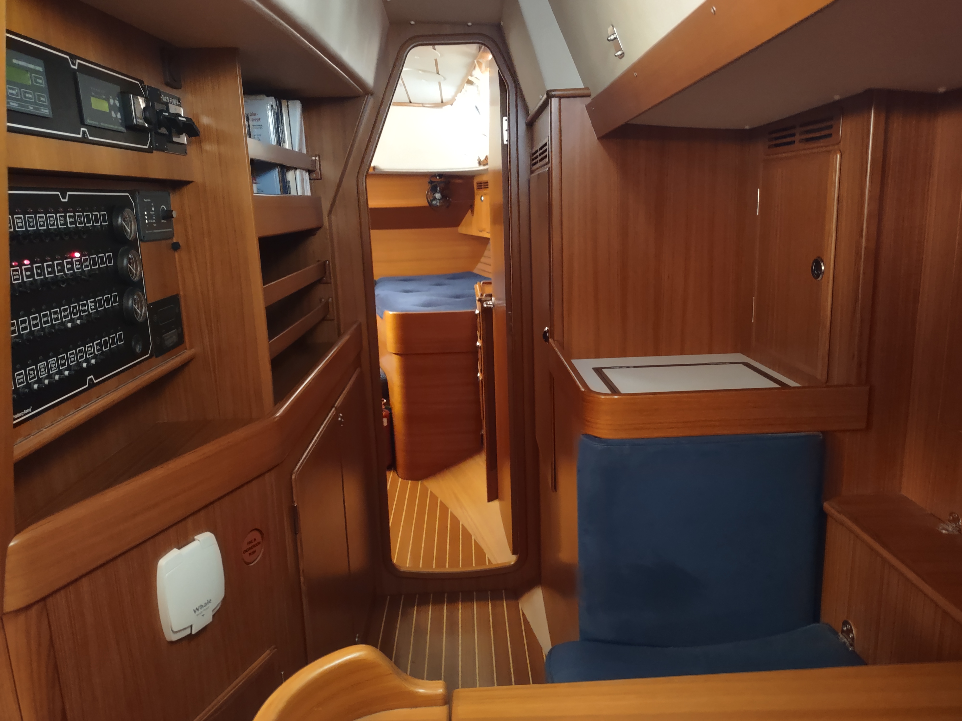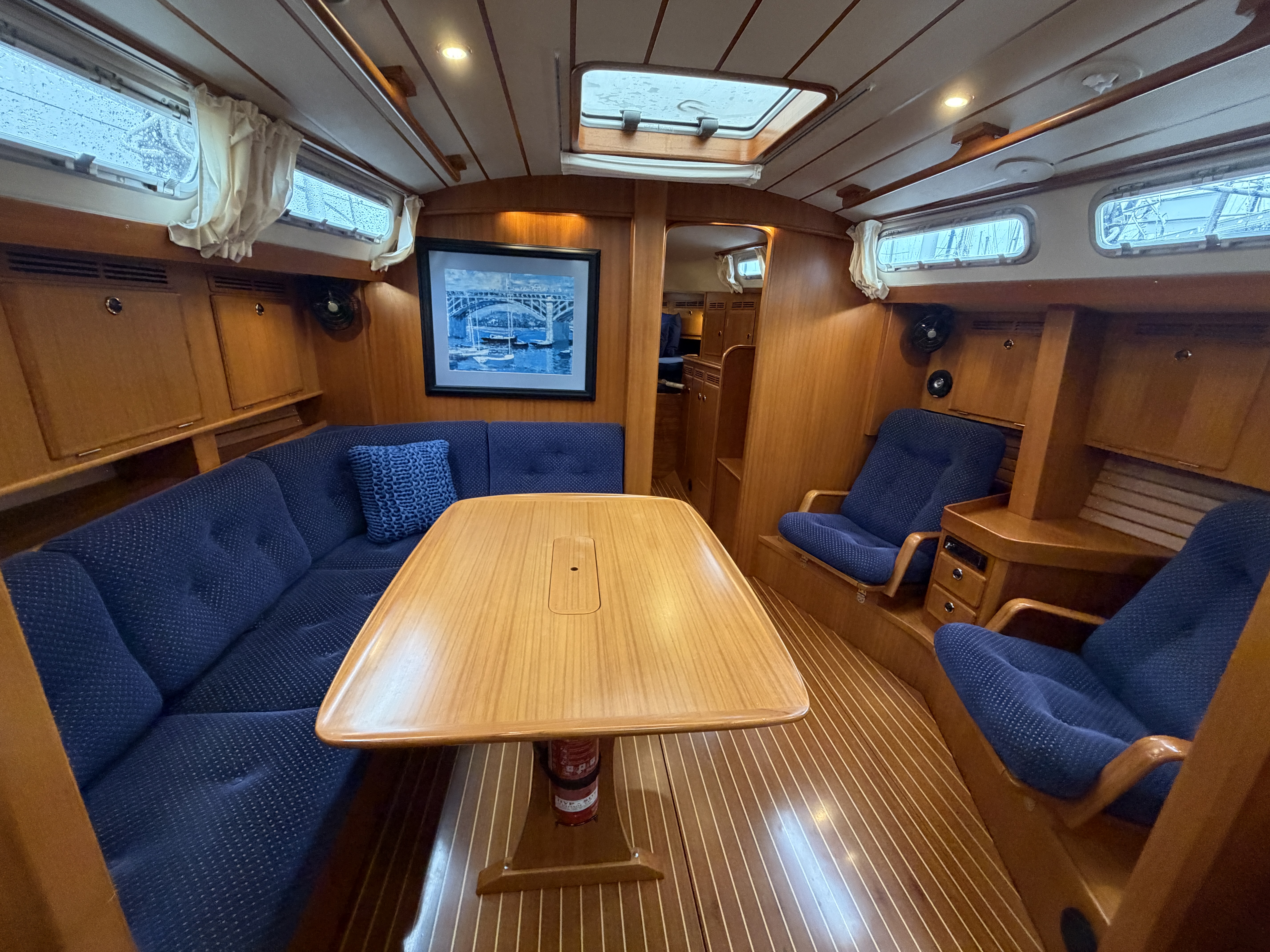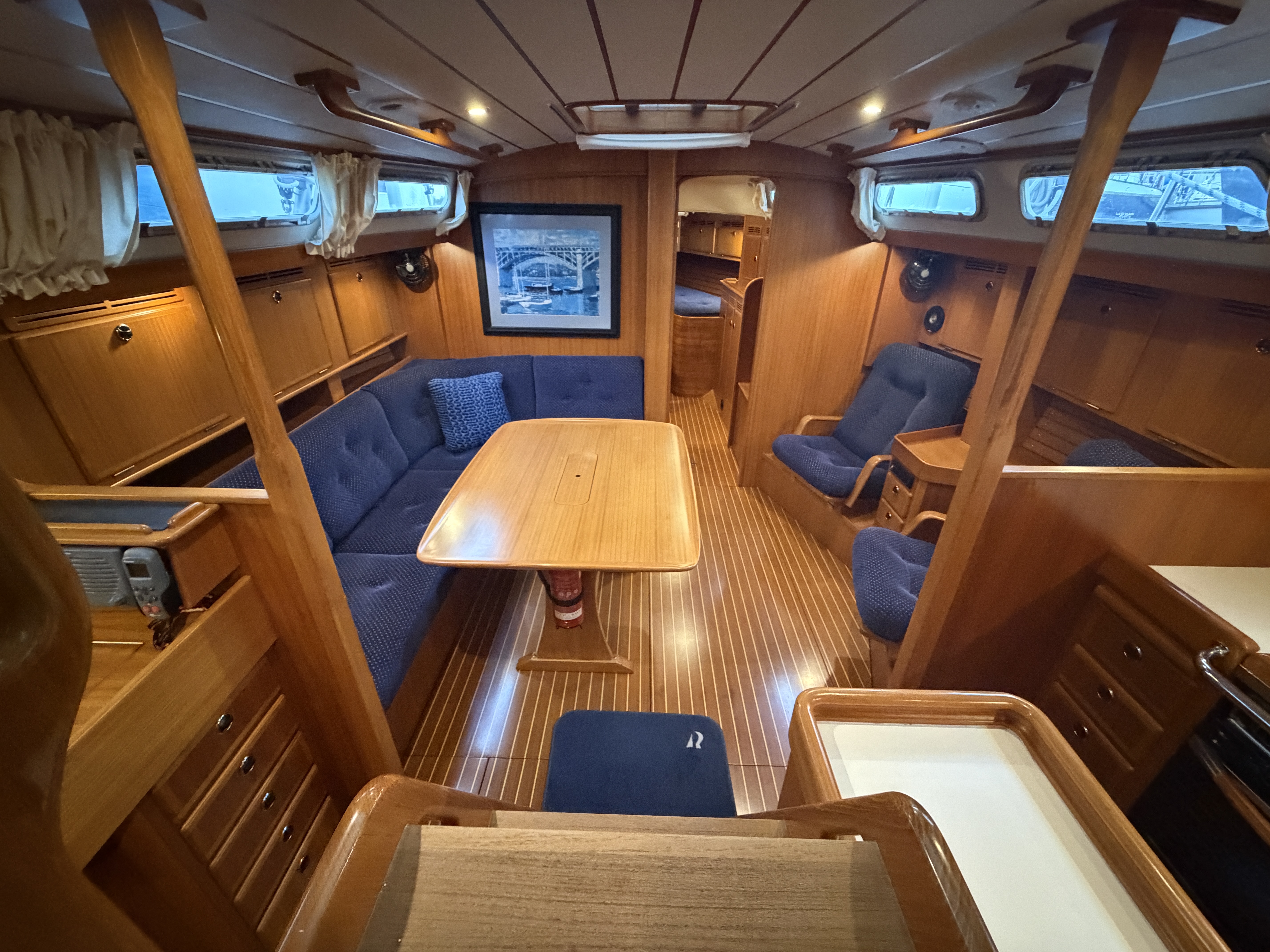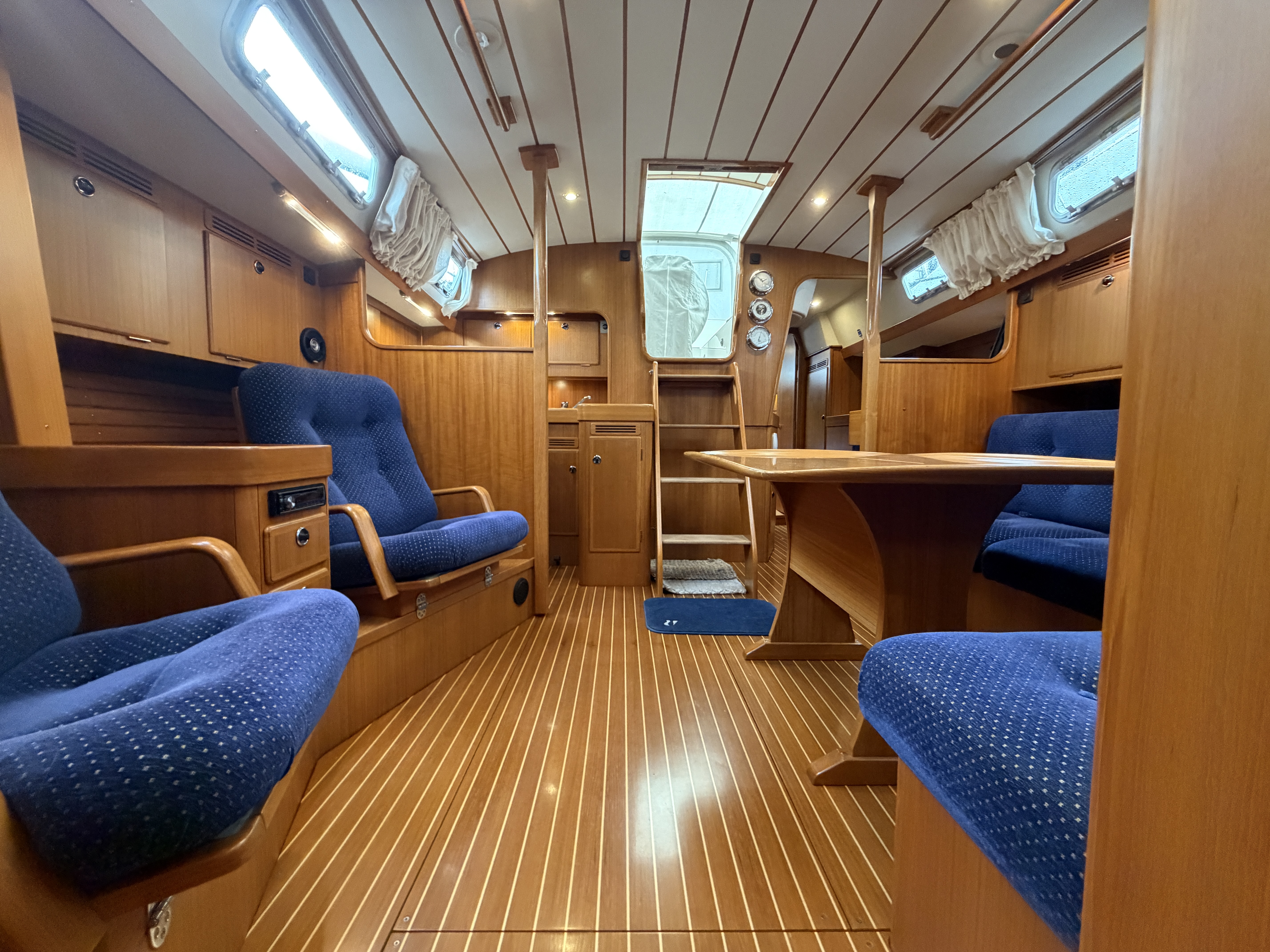 On the port side a 7’ long L-Sofa that has hinged backrests with utilized space behind for storage. On starboard side has comfortable easy chairs for reading, that Hallberg Rassy is famous for. Storage beneath both chairs. Headroom in saloon 1.97 m