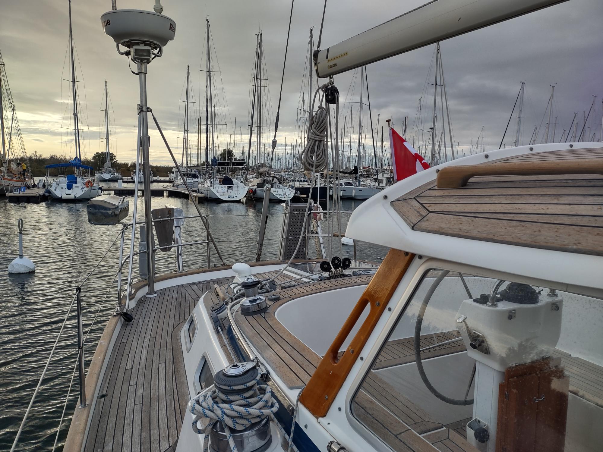 For sale Hallberg Rassy 43 MKI, Launched in September 2009. Stored inside from delivery in August 2006 for over three years due to health issues of the first Owner. This luxurious Hallberg Rassy boasts a stunning teak interior and signature easy chairs. Hydraulic furlers on all three sails and electric winches enhance the ease and pleasure of sailing. This provides “Push Button Sailing” from the comfort and safety of the helm position protected by the hard top dodger. Redundant electronics for safety and reliability on your passage.