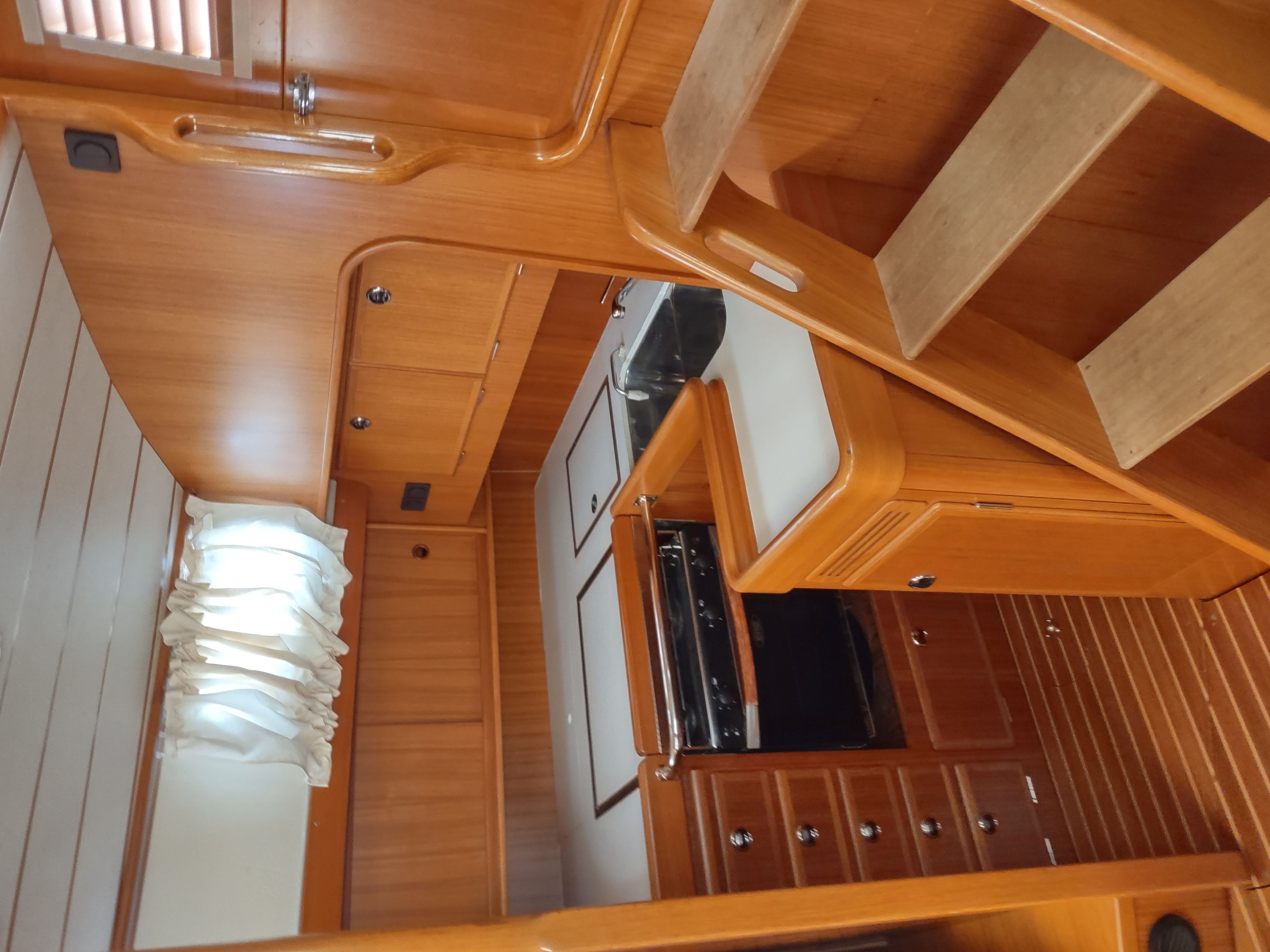 Working surface in white laminate with strong, all-round teak fiddle rail. Well insulated deep fridge with water cooled electric compressor for chilling. Additional deep freezer behind Nav Station can be a fridge or freezer. Extra deep, double stainless-steel sink. Two burner gas stove with oven, well gimballed with fiddle rails and locking device for oven door. Electric gas switch and safety solenoid. Solenoid and gas piping in gas locker changed new May /2025. Two aluminum propane tanks in locker with filling adaptors for travel. Crockery locker and cutlery drawer. Teak Bread Board.