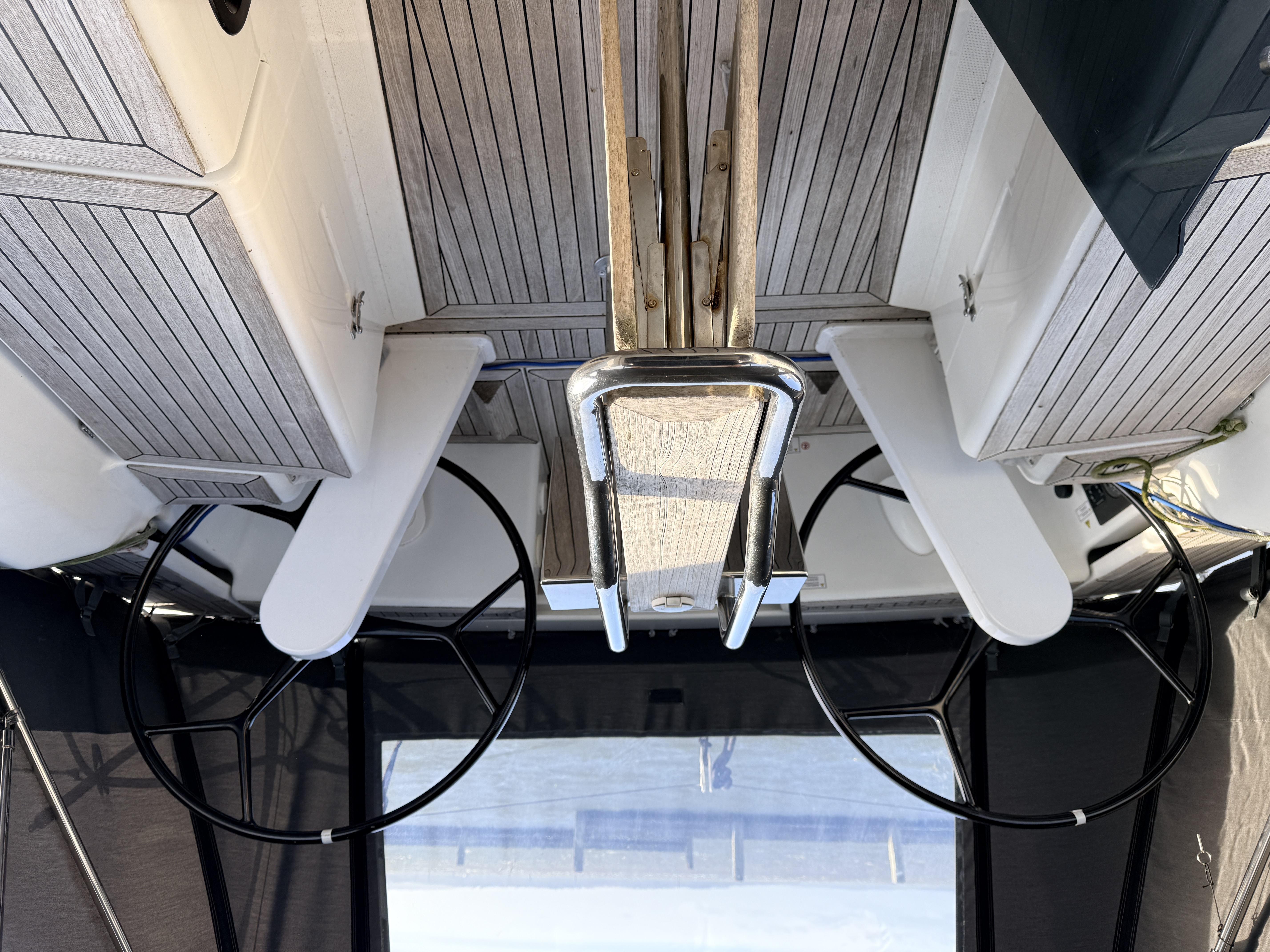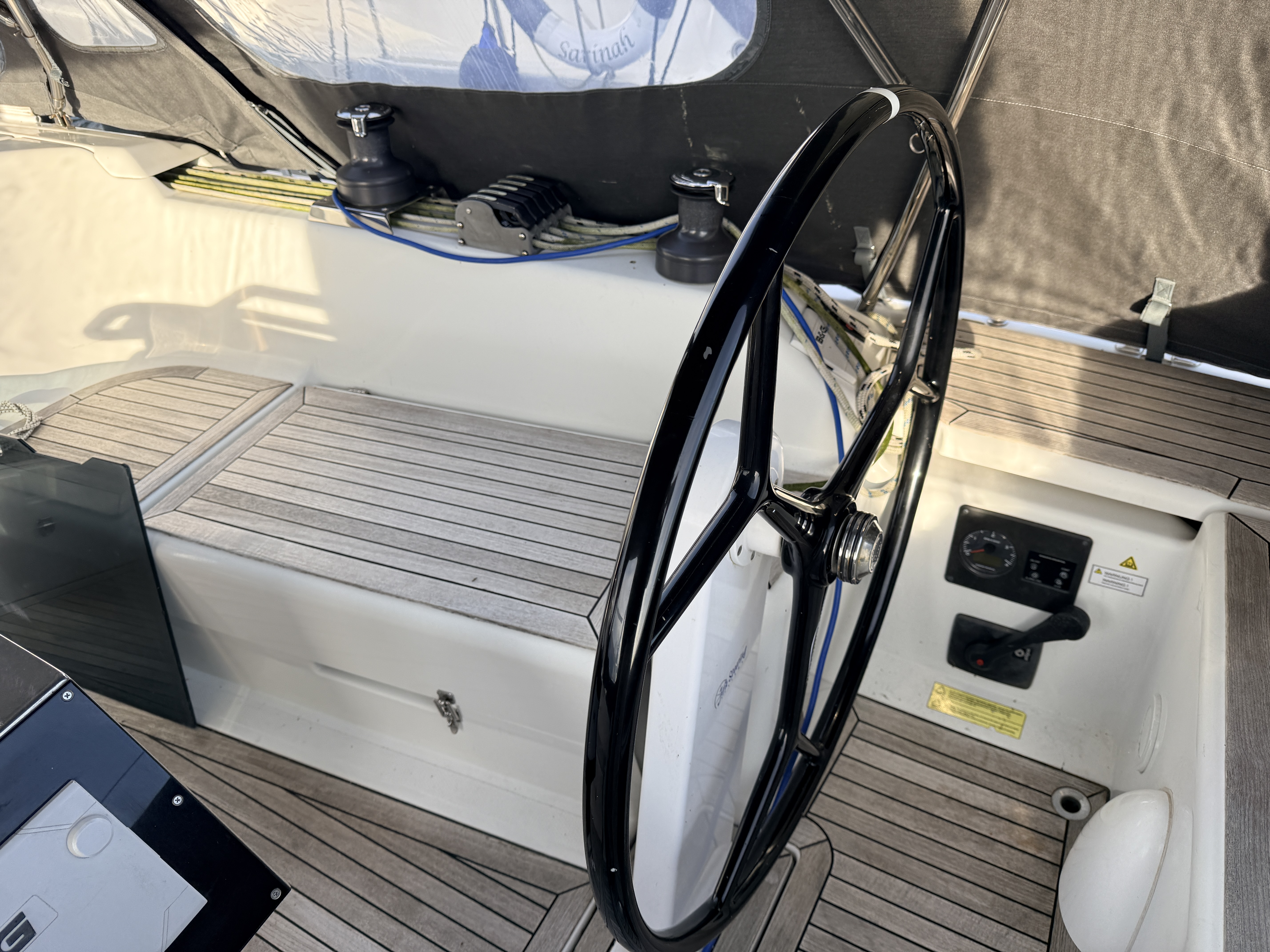 GRP deck with moulded non slip on the deck. Teak in lay to the