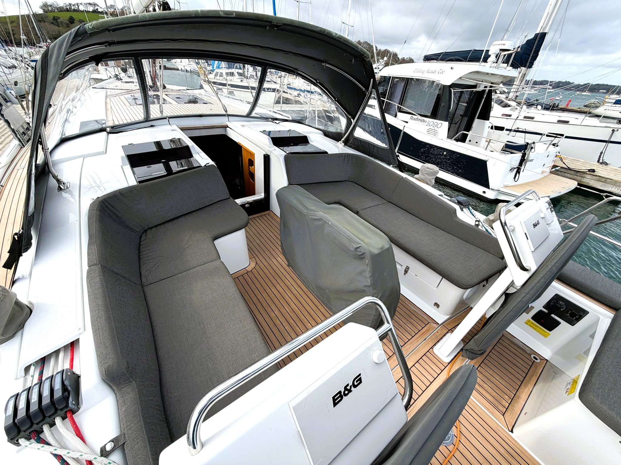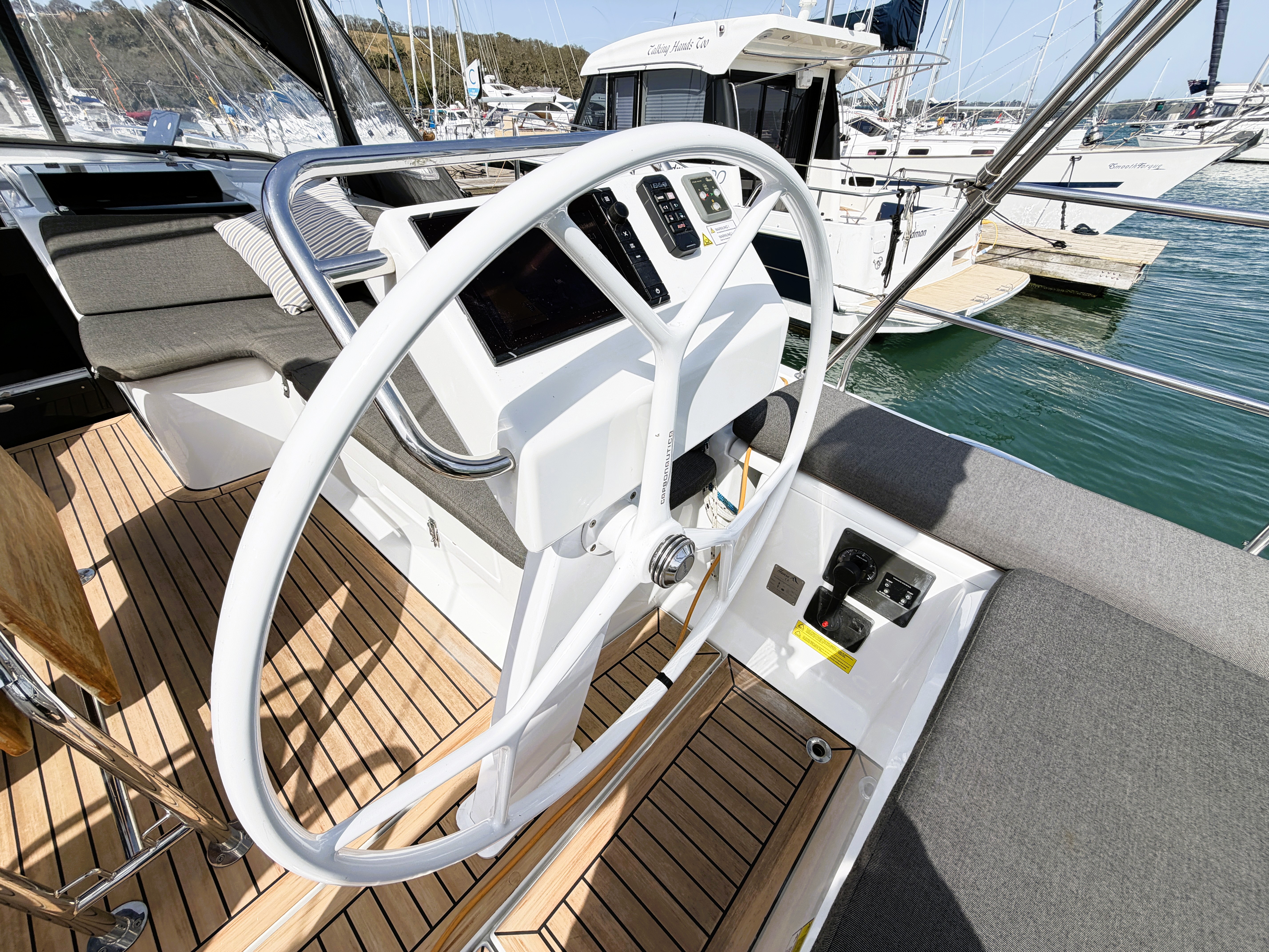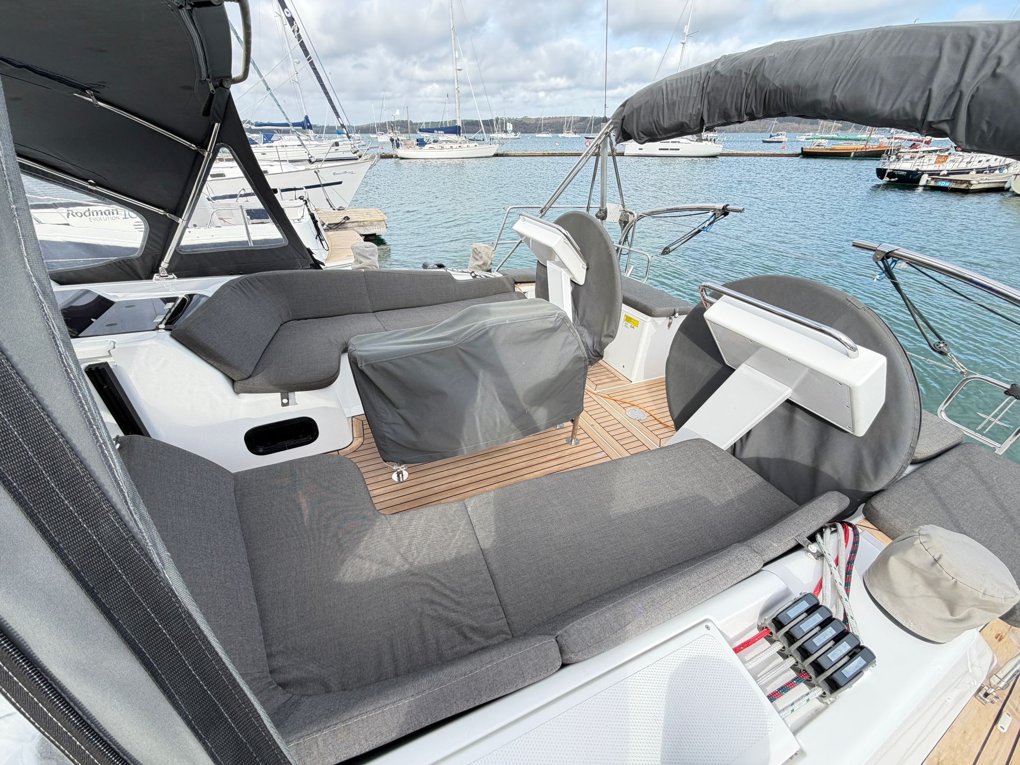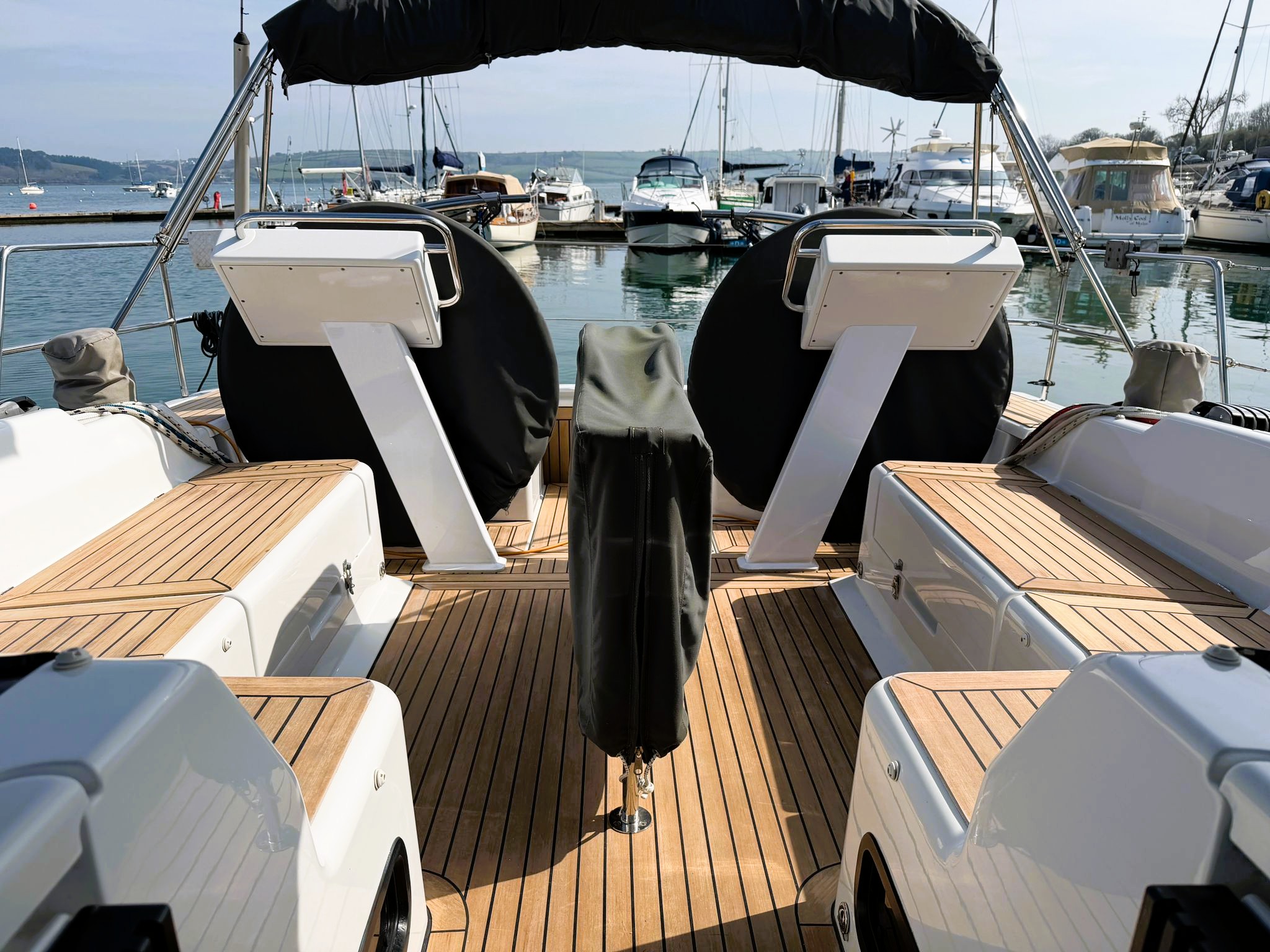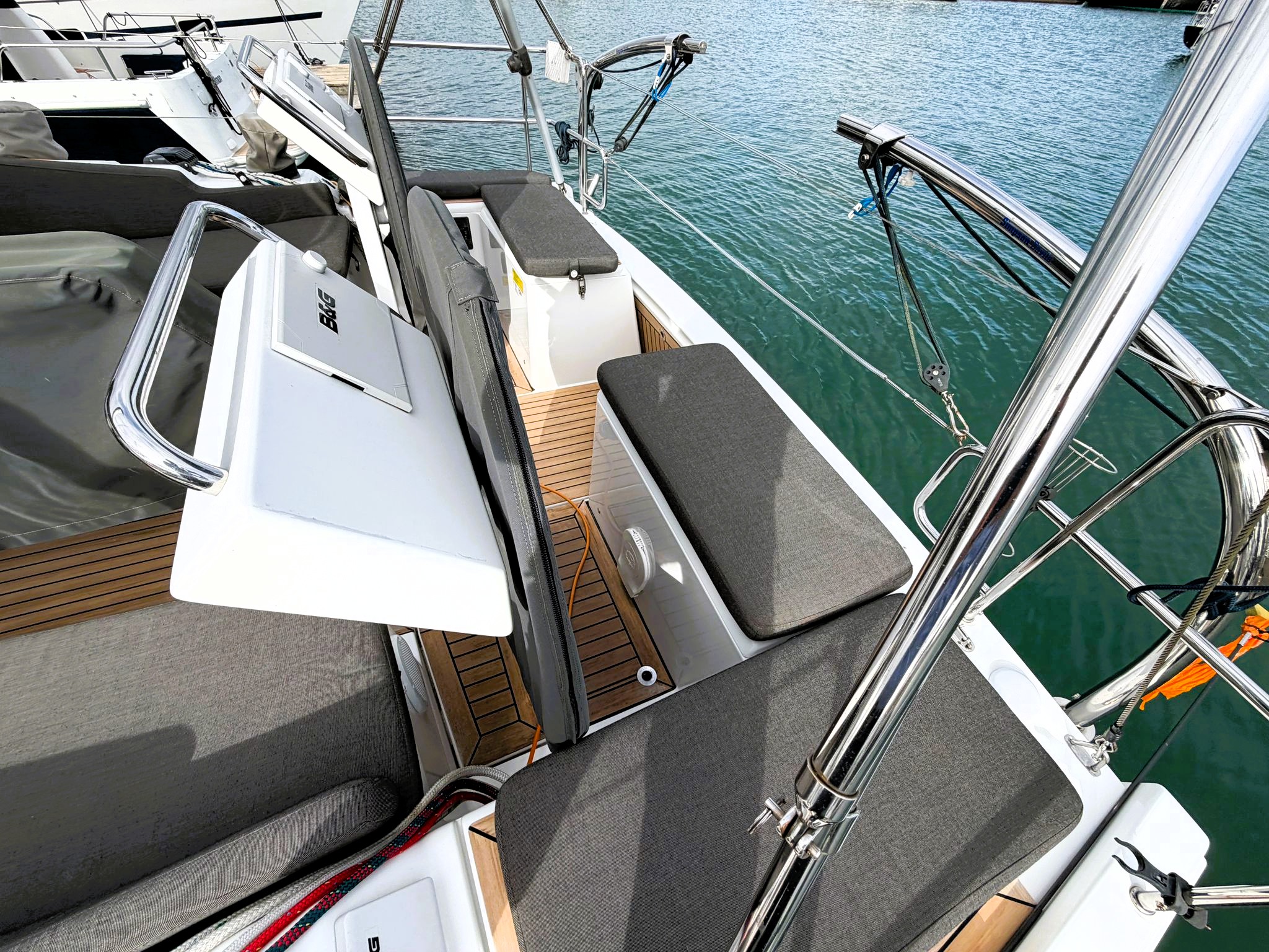 Twin helm cockpit built for control, comfort, and social sailing