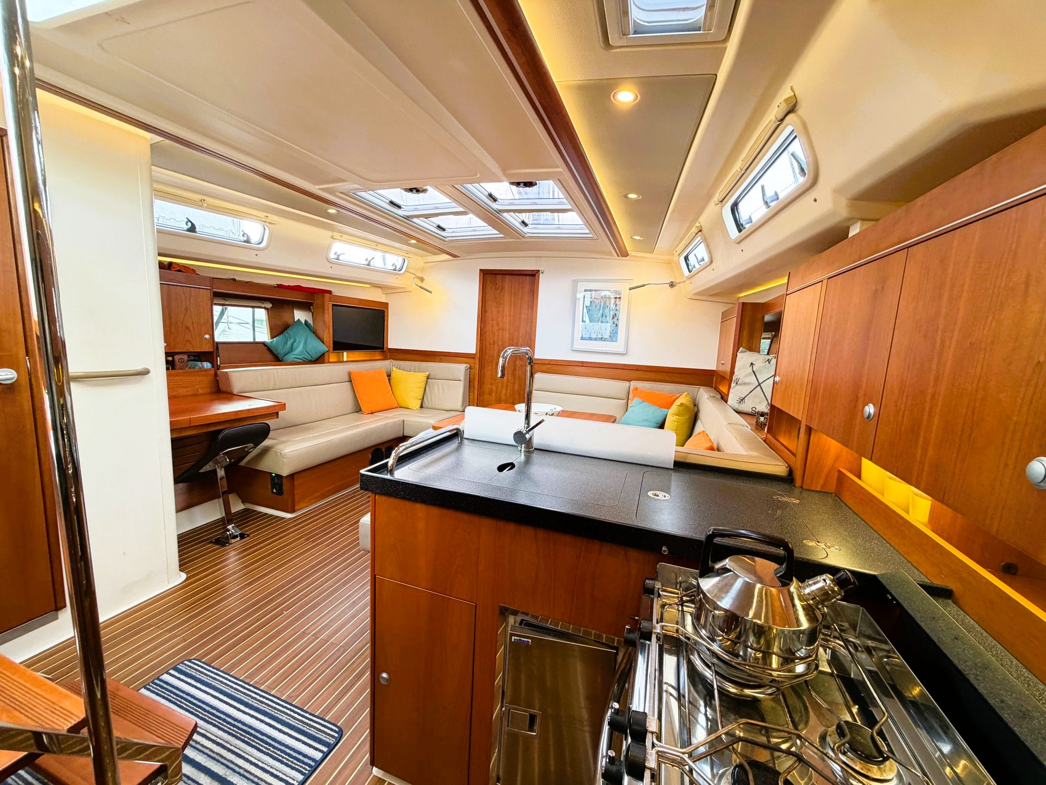 Her spacious and bright interior provides ample accommodation with a large owners cabin and ensuite heads and shower forward making extended stays aboard a pleasure.