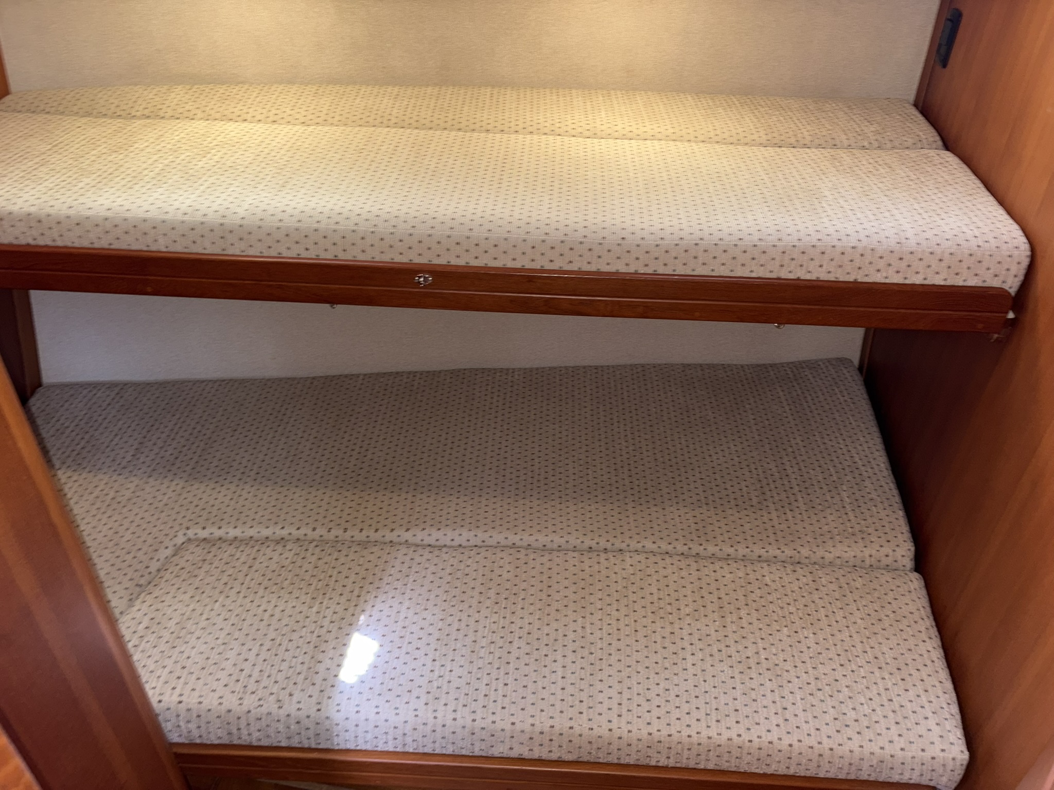 Upper and lower berths and cupboard and shelve (lower berth extends to make a double). Opening hatch and two opening ports.