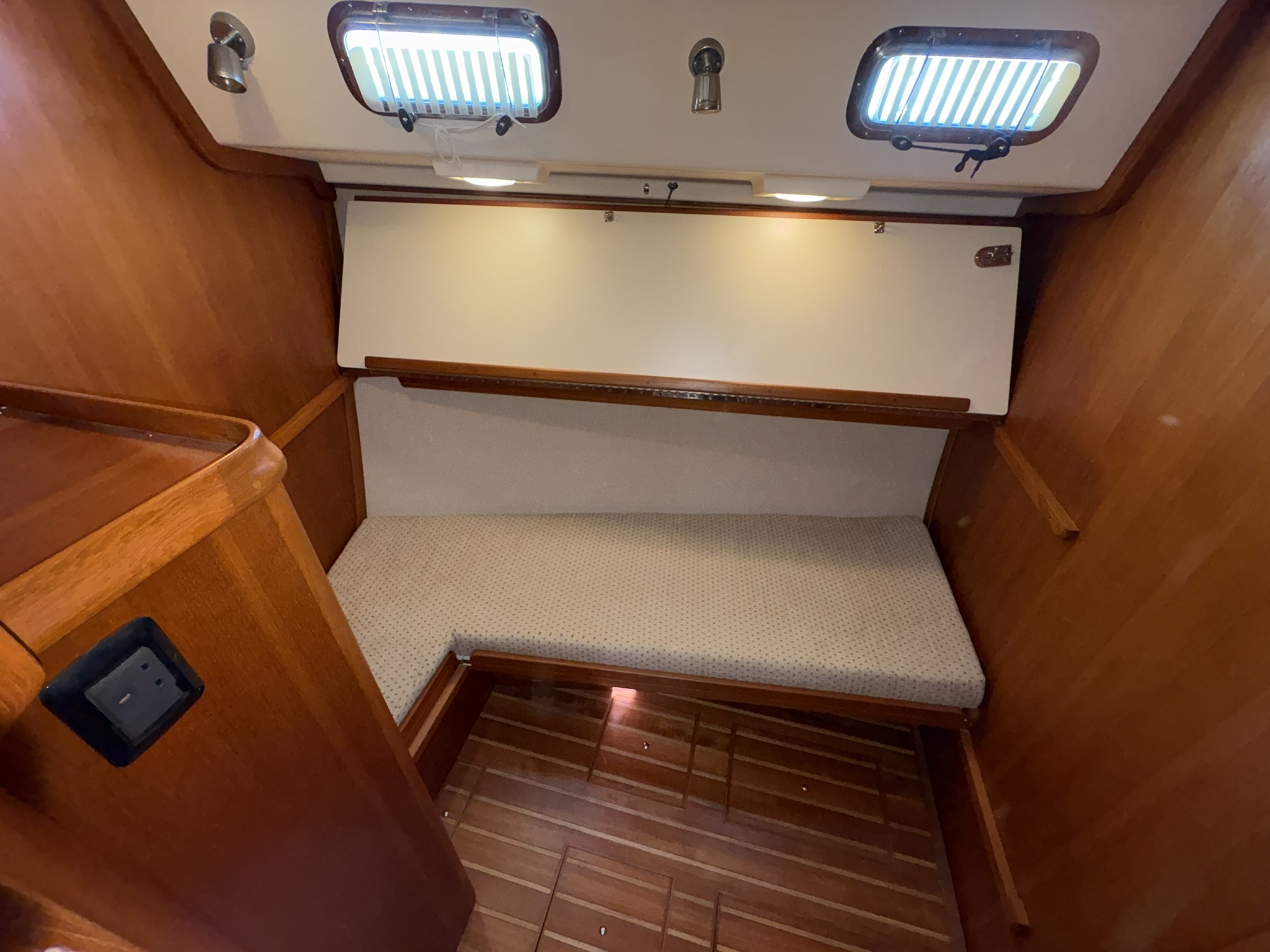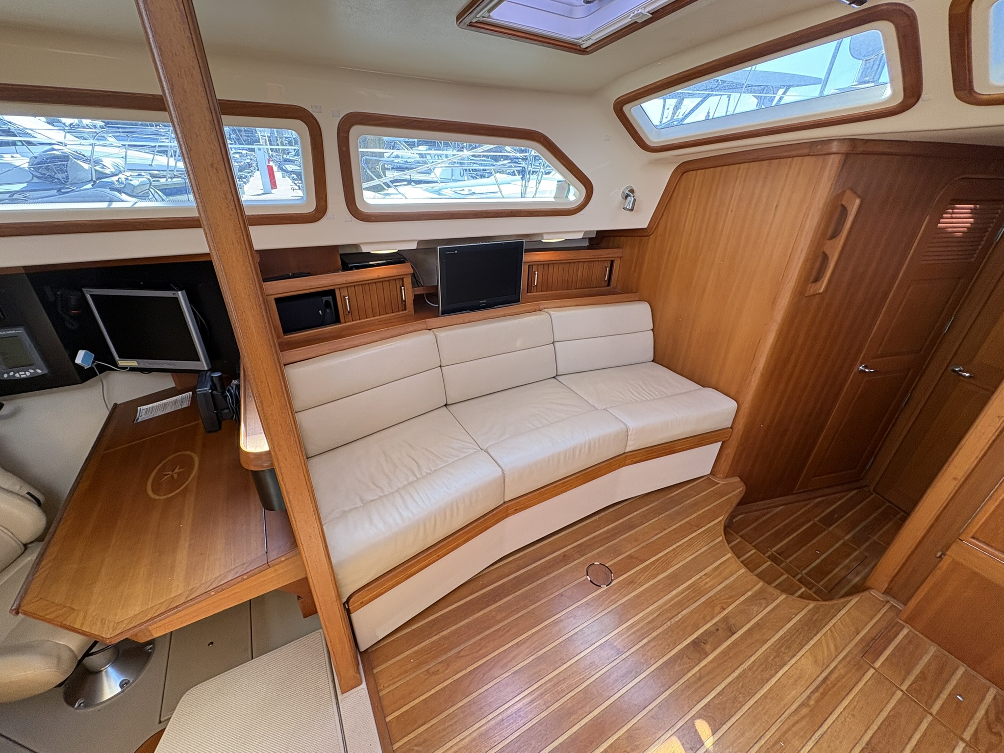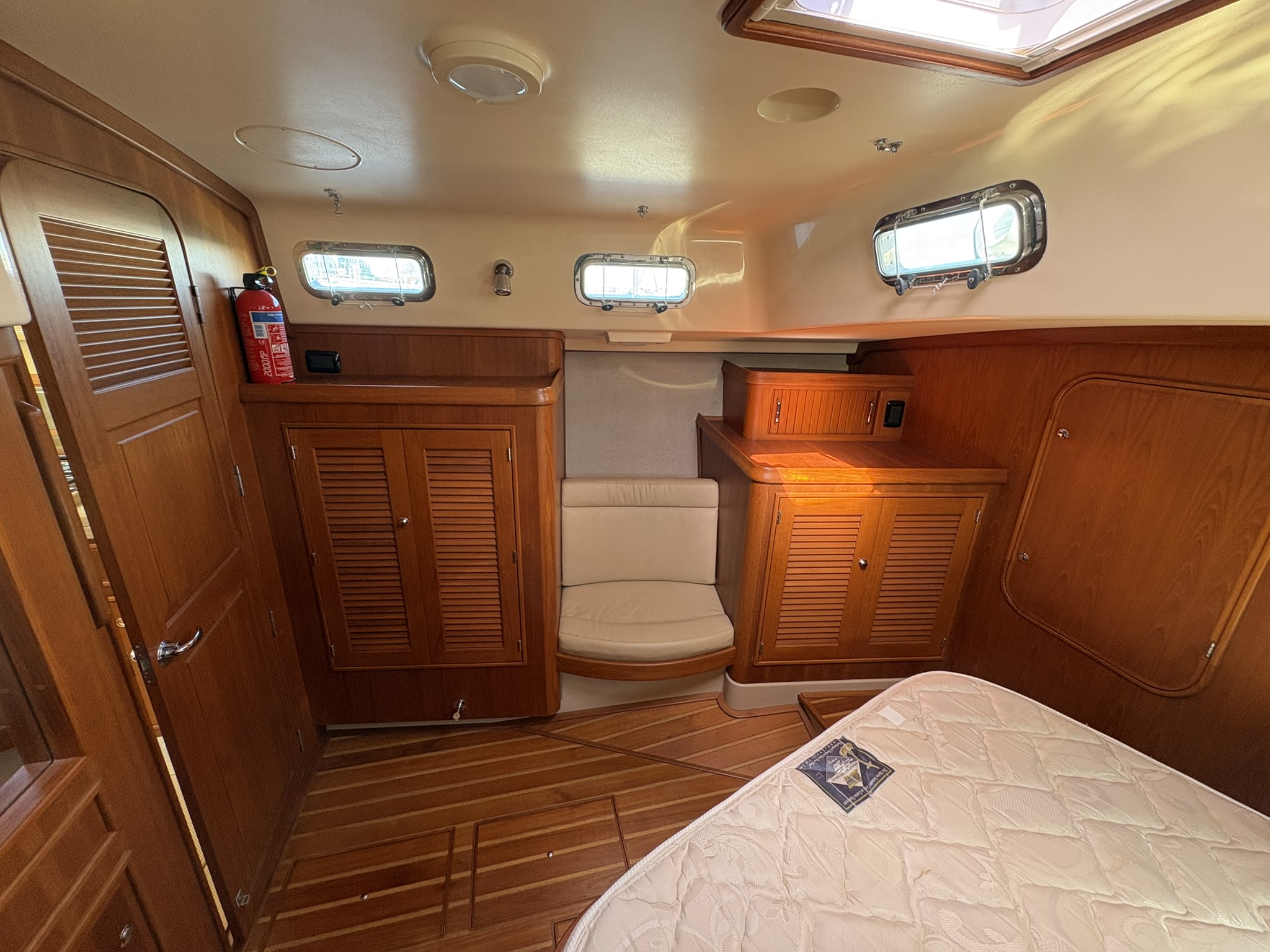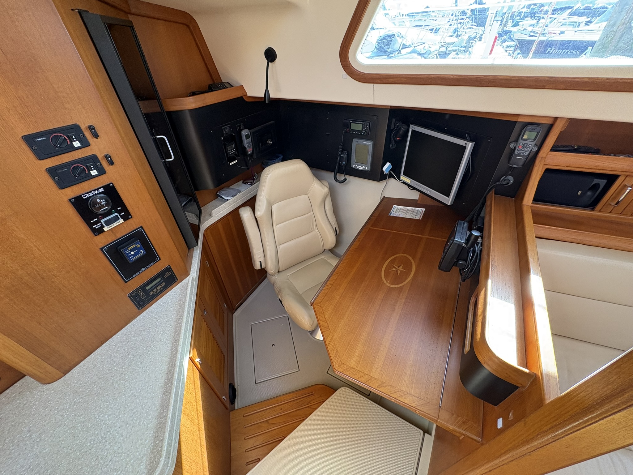 To port with forward-facing chart table and bookshelf and office chair, Chart locker, Ample storage lockers. We locker. Instruments. 12v/240v panels.