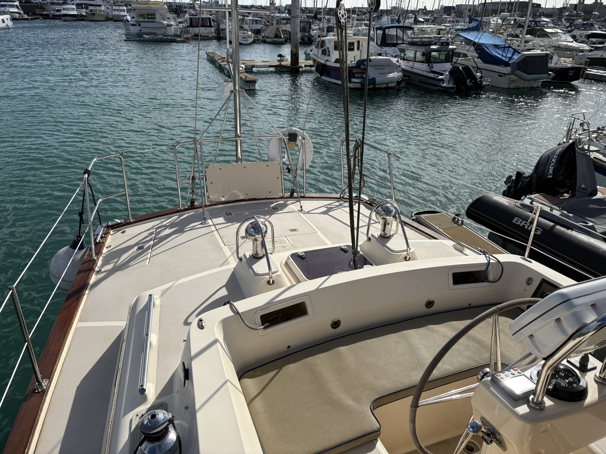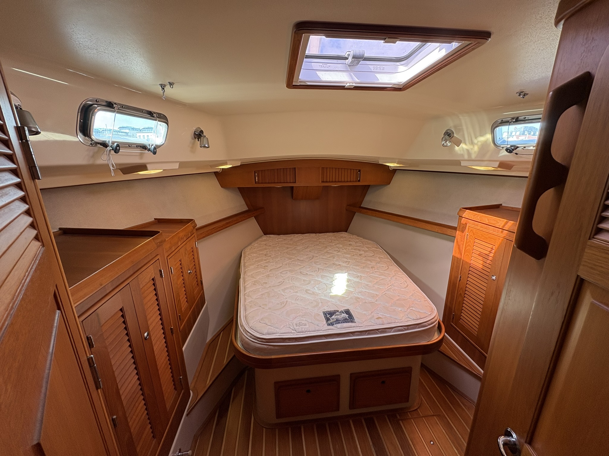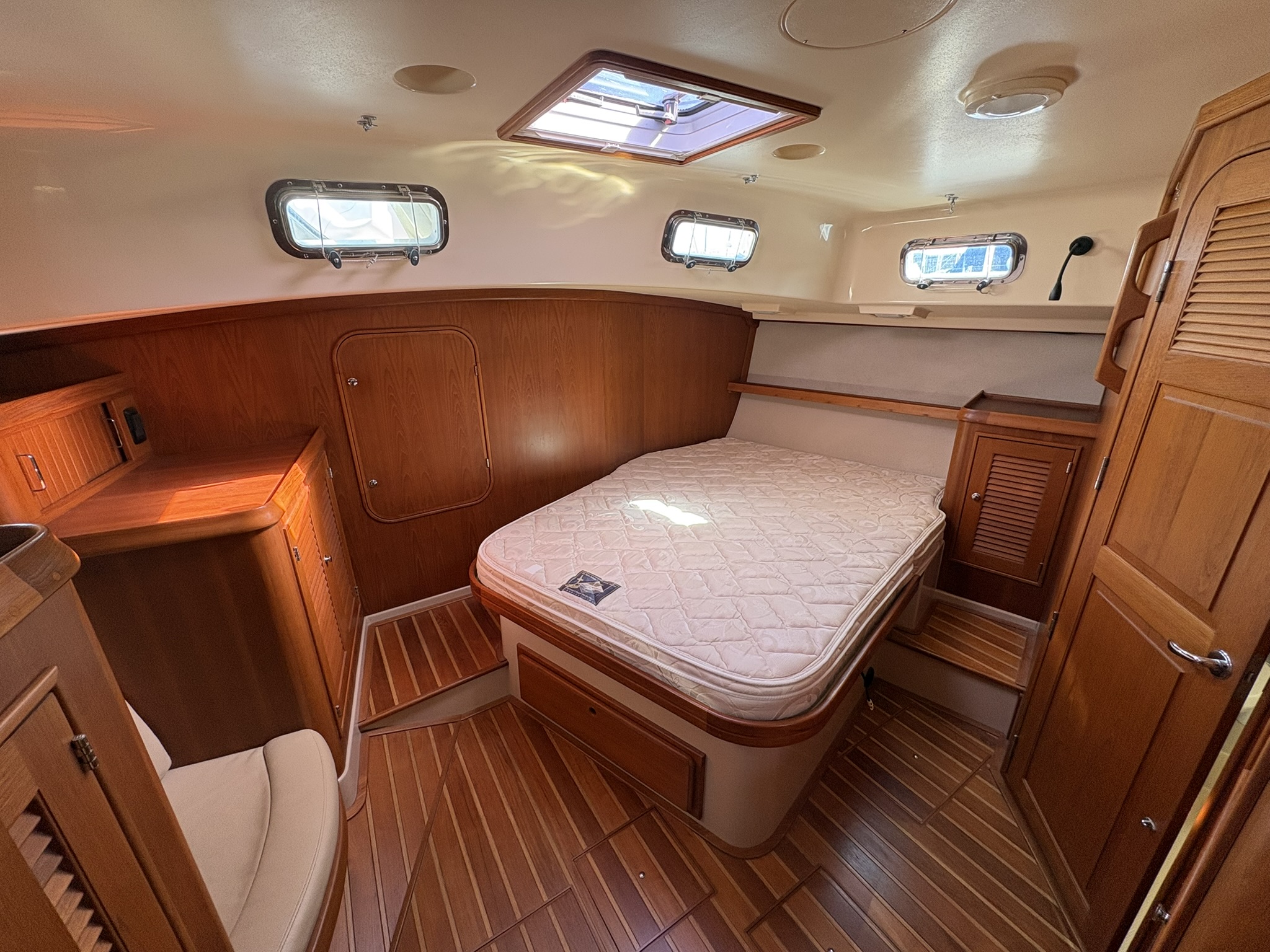 Large double berth, (hydraulic strut to under bed storage) offset from the centreline and upholstered seat. Large hanging locker with abundant drawer space and locker space, chair Door to lazarette. Opening hatch and five opening. Door to En suite Heads.