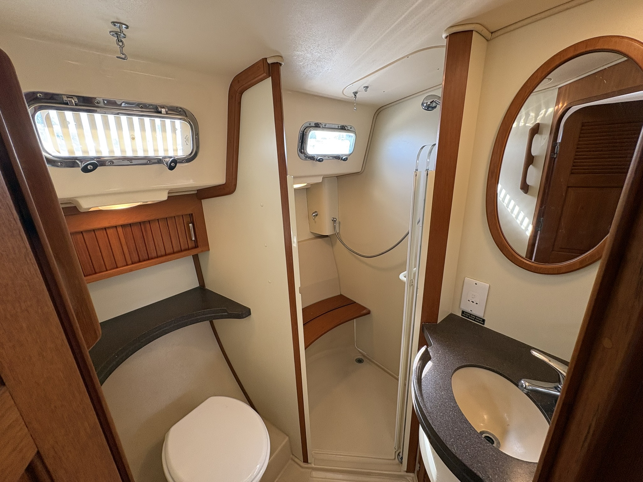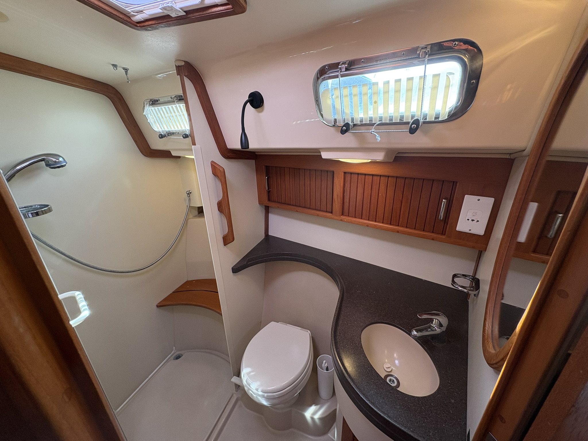En suite access from Forward Stateroom and access from forward passageway. Dometic Sealand wc. Washbasin with hot & cold mixer tap. Hot & cold shower in a separate compartment. Shaver point. Cupboards. Mirror. Opening hatch and two opening ports.