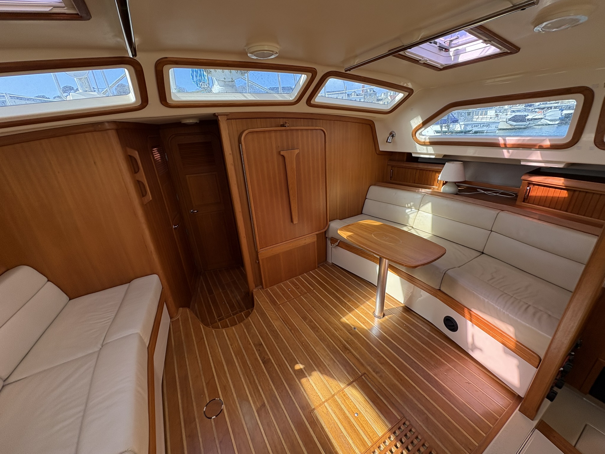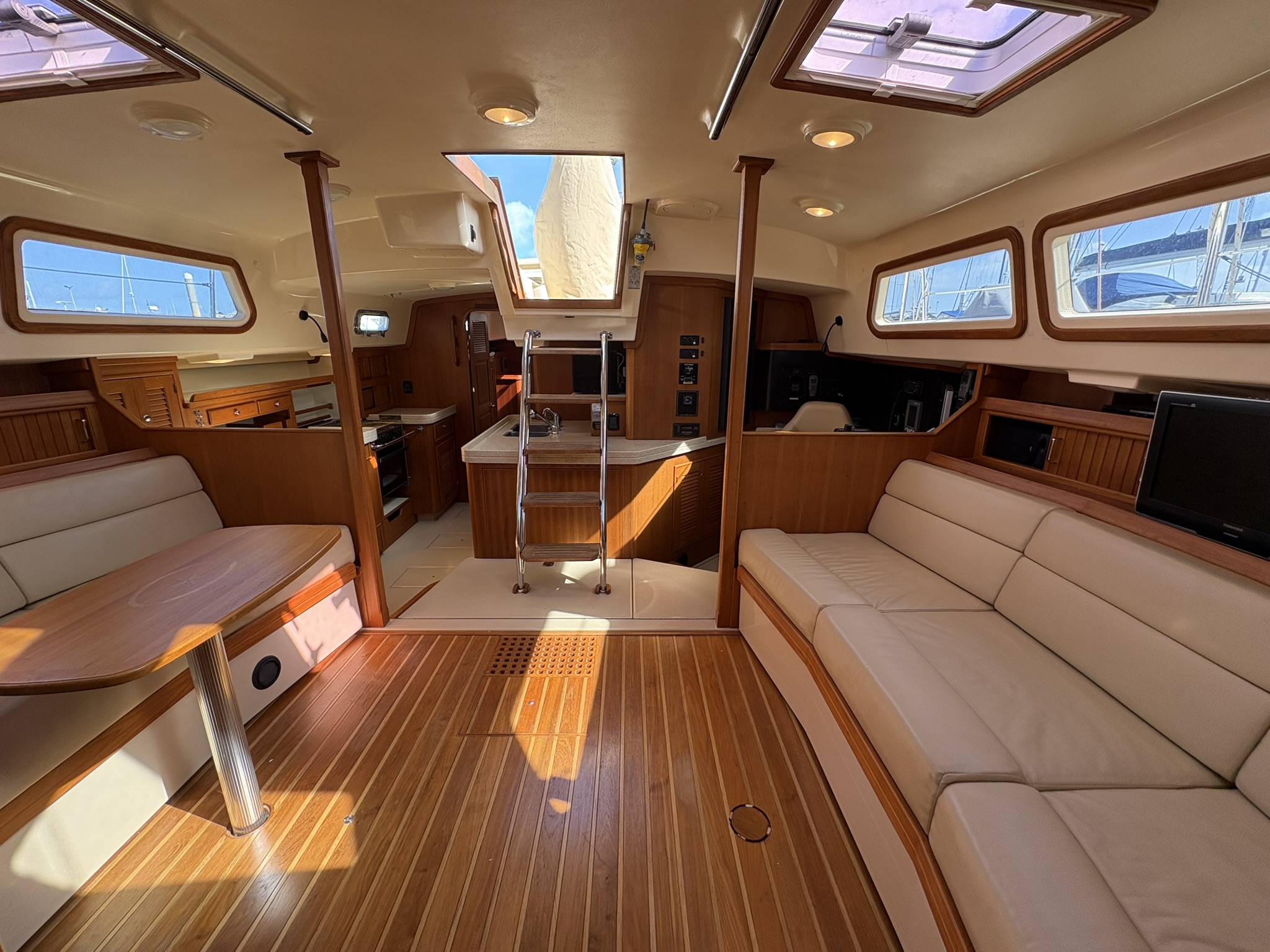 Settee port and starboard surrounding a folding table, Coffee table. Bookcase and cupboards, large stowage under settees. Three forward facing windows and four side windows. Two opening hatches.