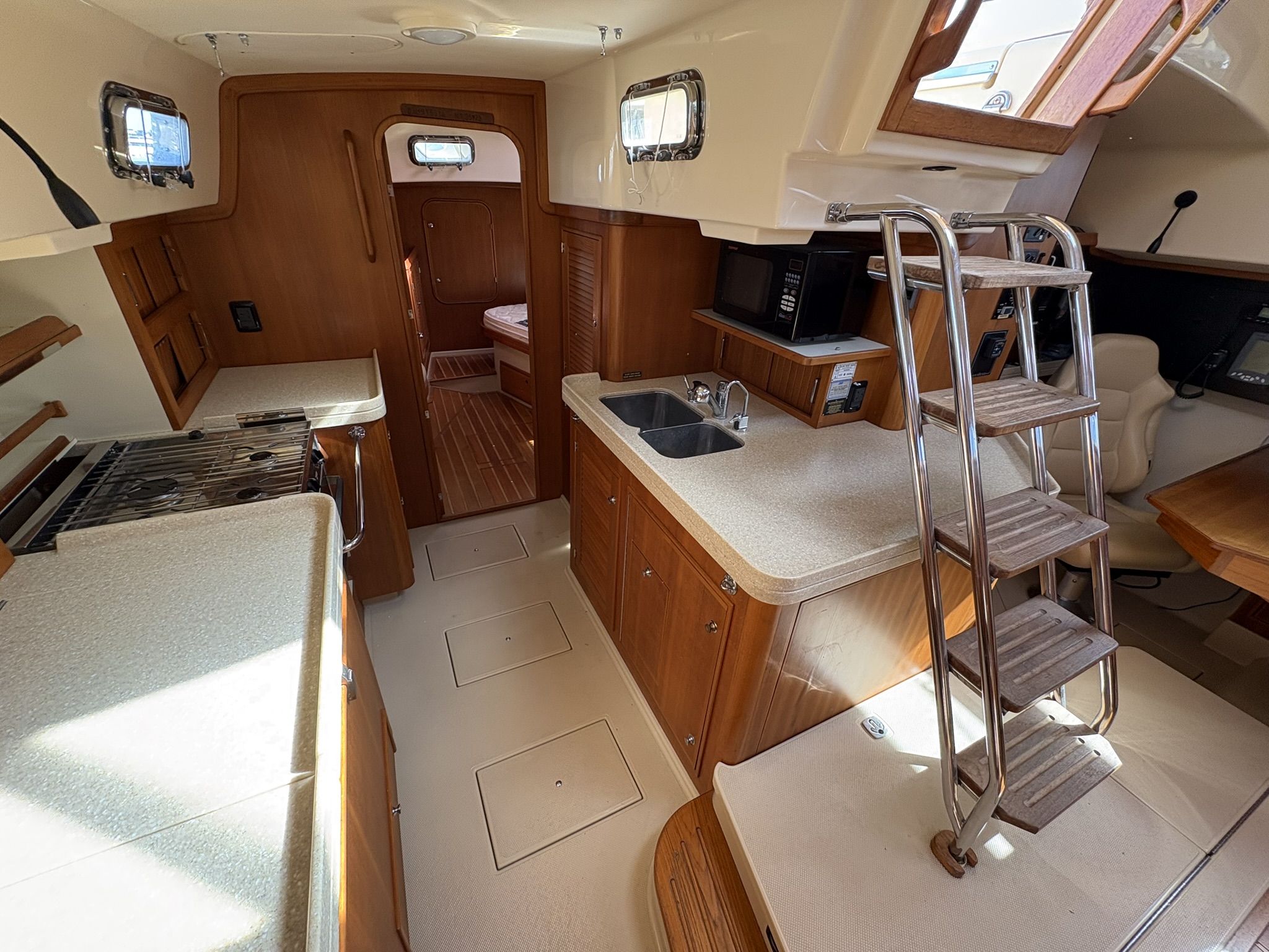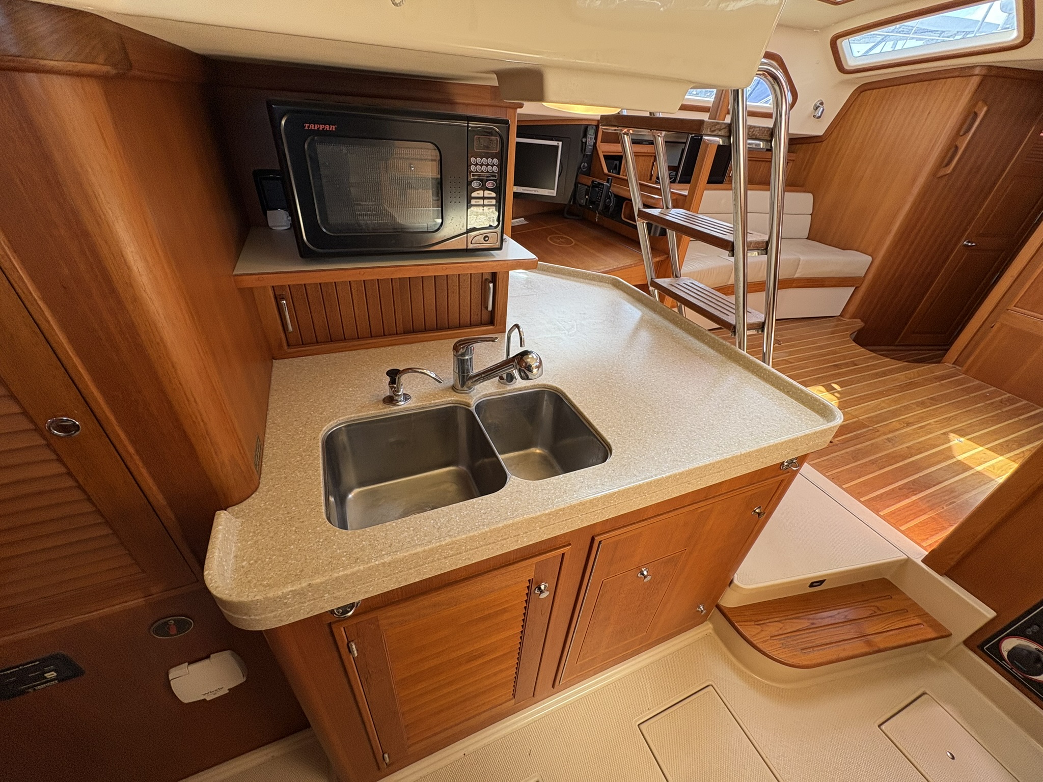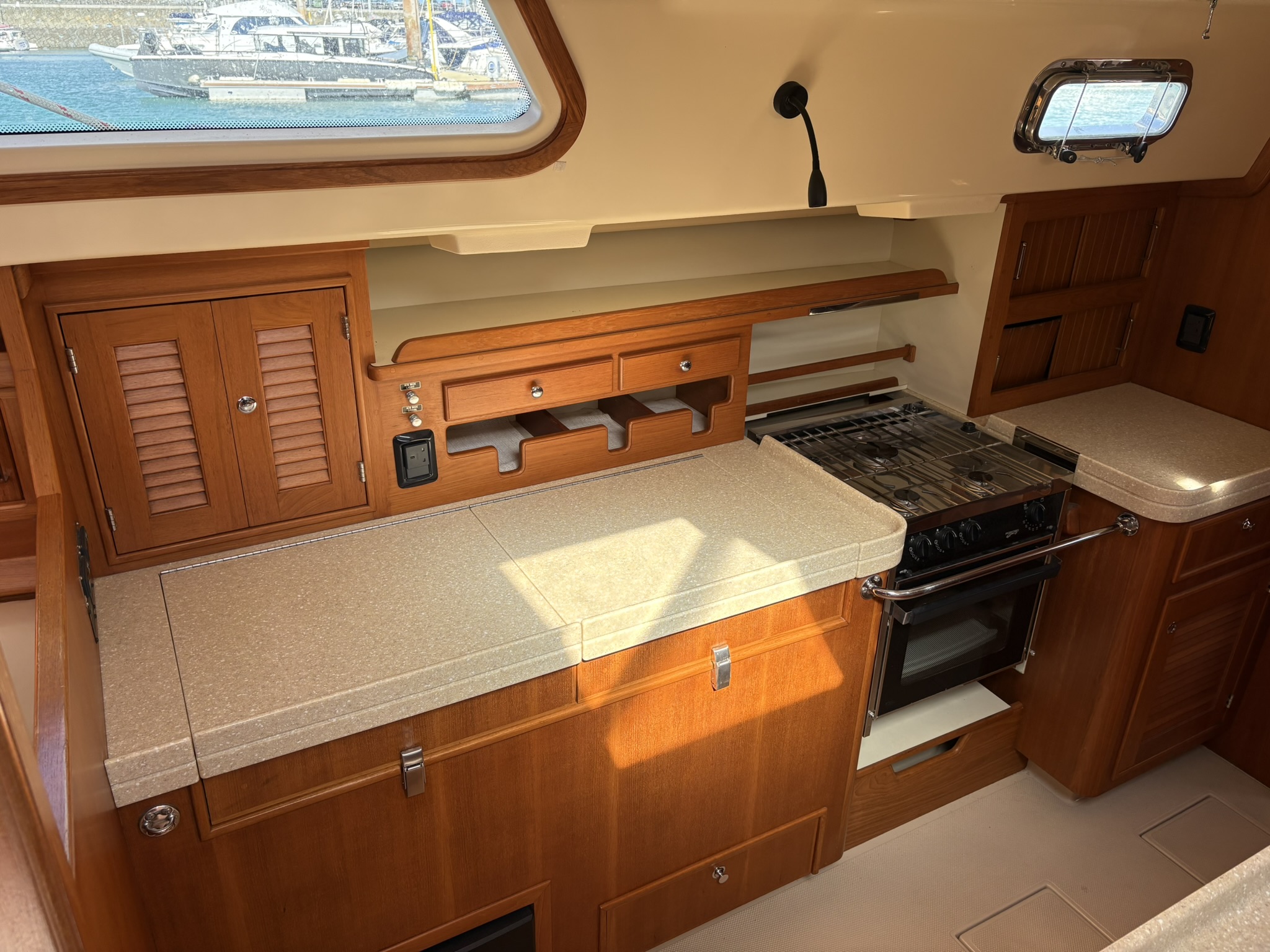 Force 10 3 burner gas with grill and oven, 2 x top opening refrigerators plus cool drawer. Tappan microwave oven, large Corian work surfaces, Double sink with hot & cold mixer tap. Opening port. Access to Owners Aft Stateroom.