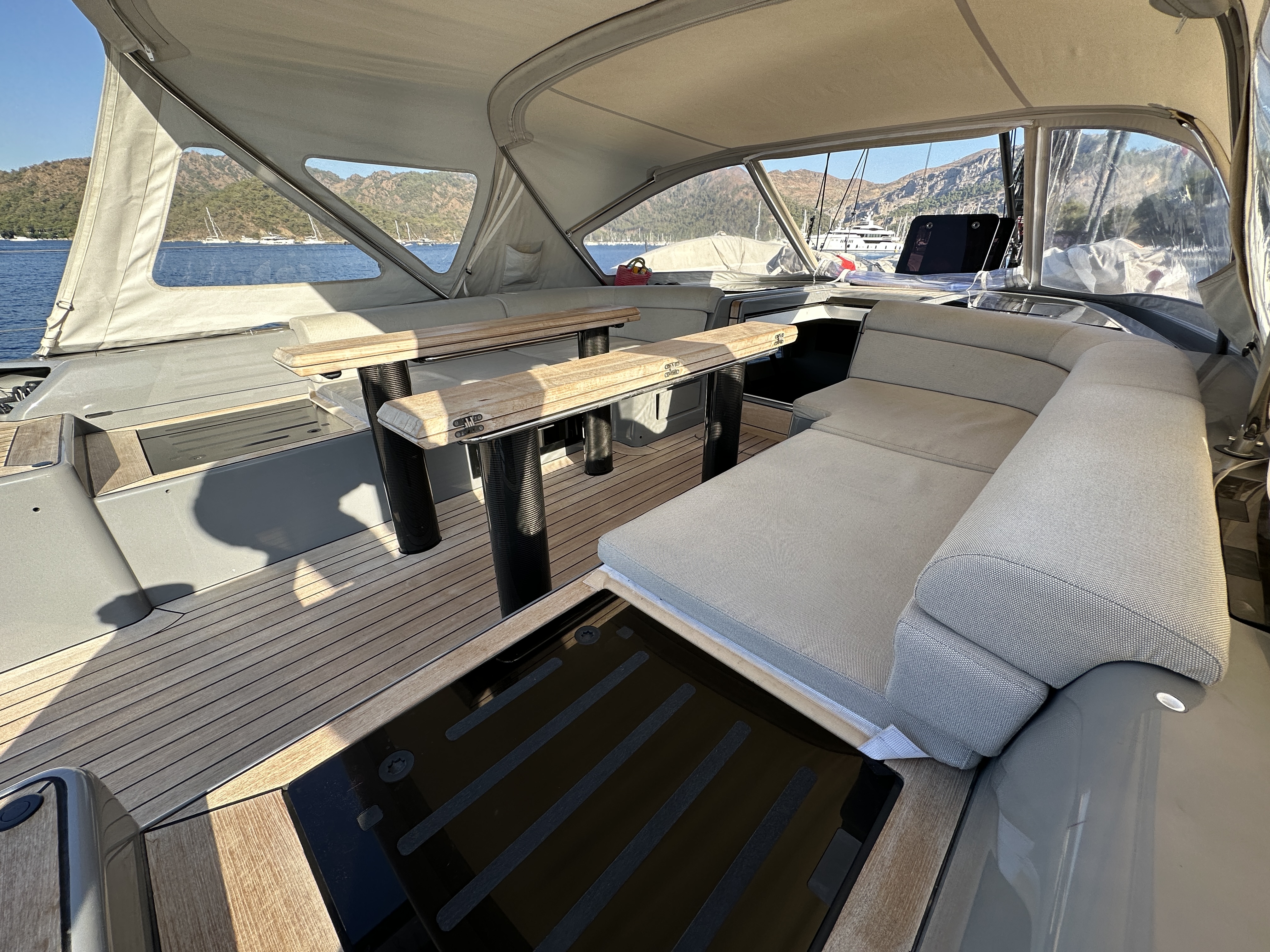 Guest Cockpit in front with 2x folding Cockpit Tables in Carbon/Teak
