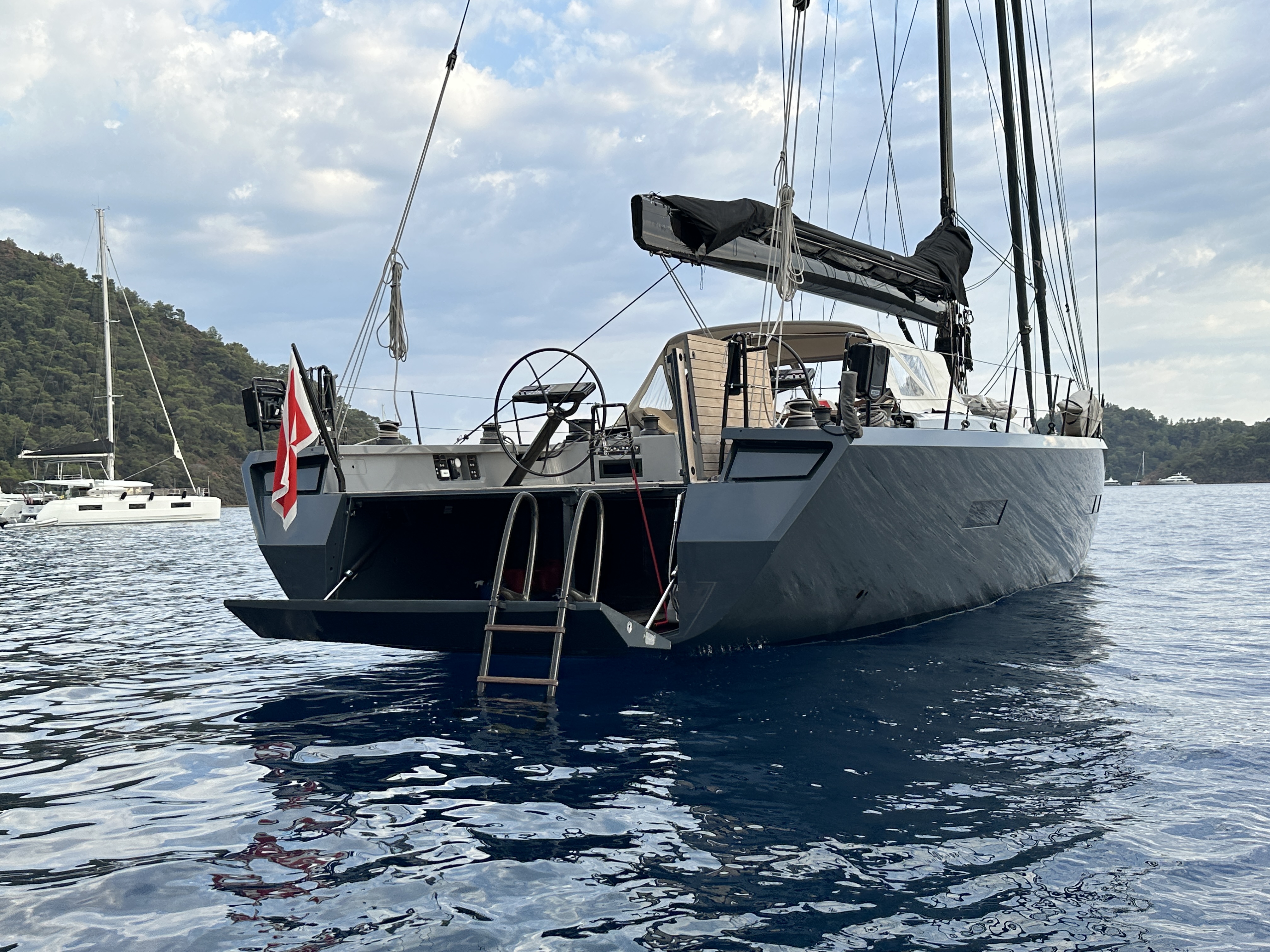 The ergonomic cockpit is designed for crewed racing or extended cruising. Below deck NYUMBA offers 3 spacious cabins with en-suite heads. The large Dinghy garage fits a 4,20 m Tender.