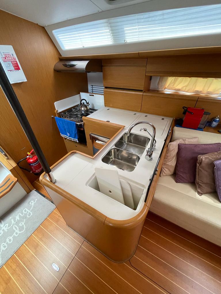 Aft of the lounge is the 'L' shaped galley, with a double stainless steel sink and chrome mixer tap, a 3 burner Eno gas hob with oven and grill, plus an extractor fan. The Sharp microwave is tucked away in a cupboard and soft close draws give extra storage. The 200 litre fridge has top access and front access through a stainless steel door and the 100 litre top loading freezer