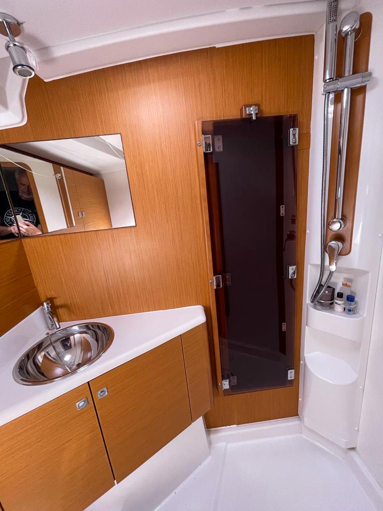 The en-suite heads has a separate showering area behind a plexiglass door. There is a Quiet Flush electric marine toilet and washbasin with LED lighting overhead