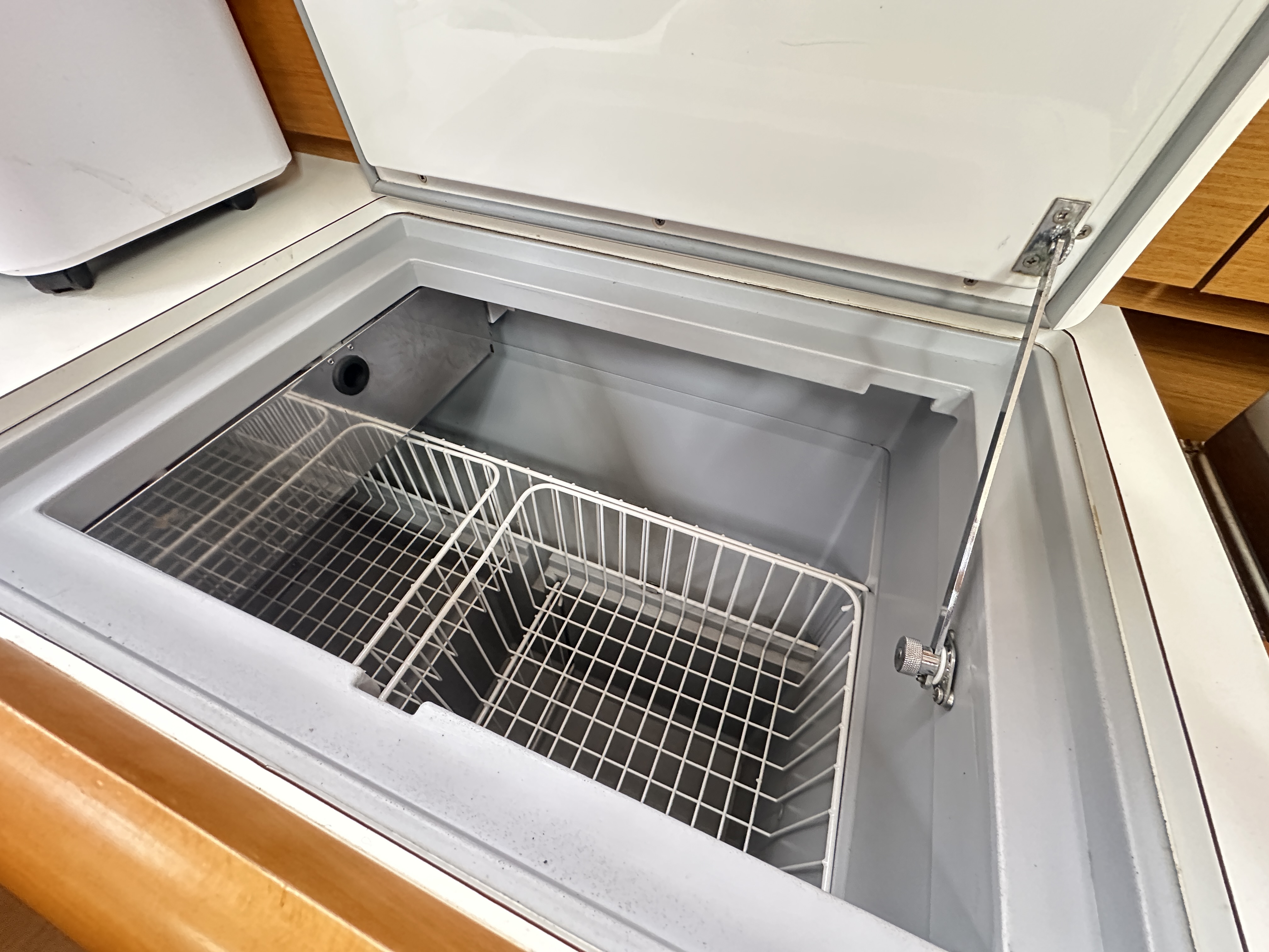 L shaped Galley to starboard with twin stainless steel sinks (hot and cold pressurised fresh water system, 40 litre hot water tank and tank gauge)