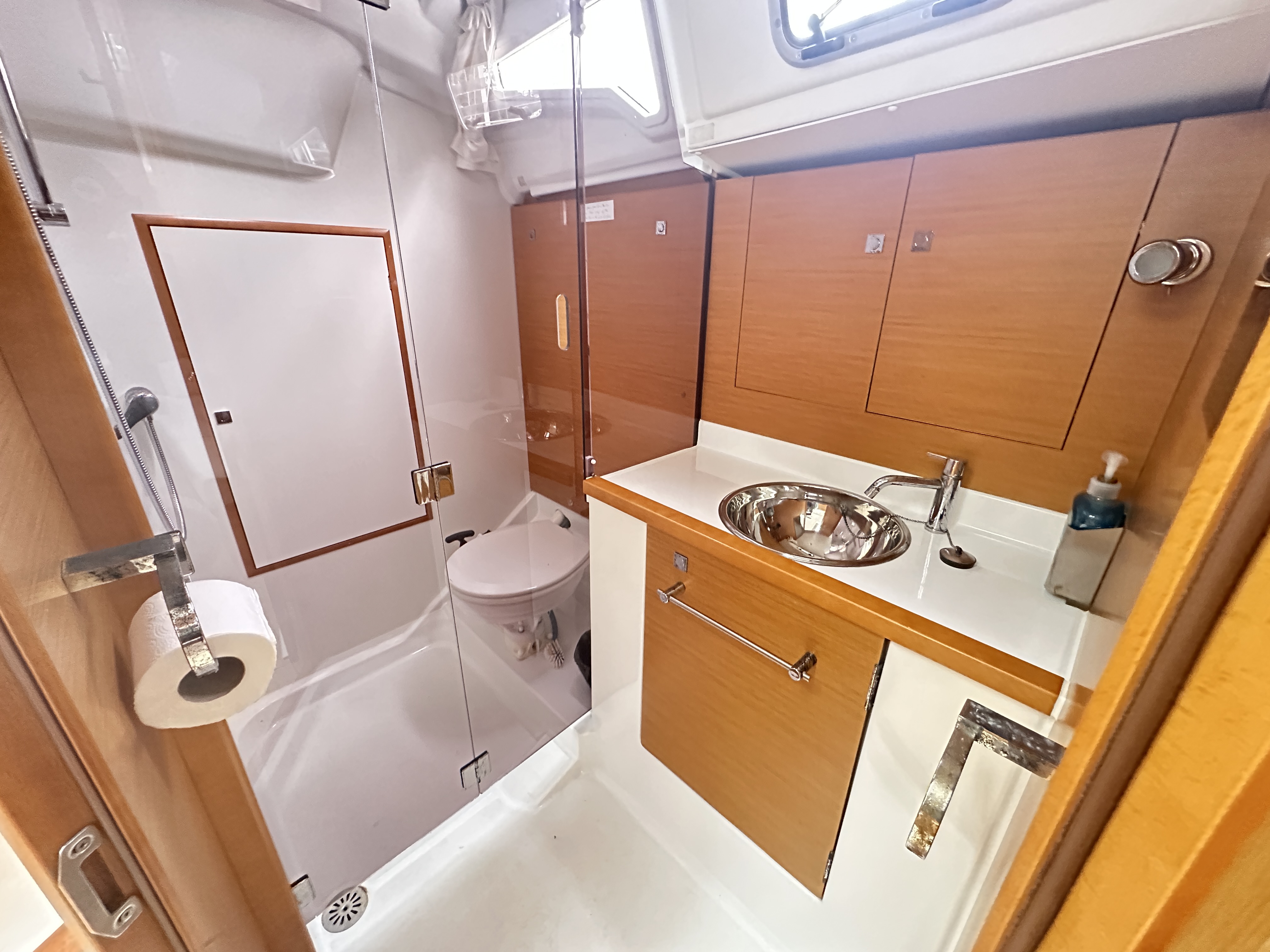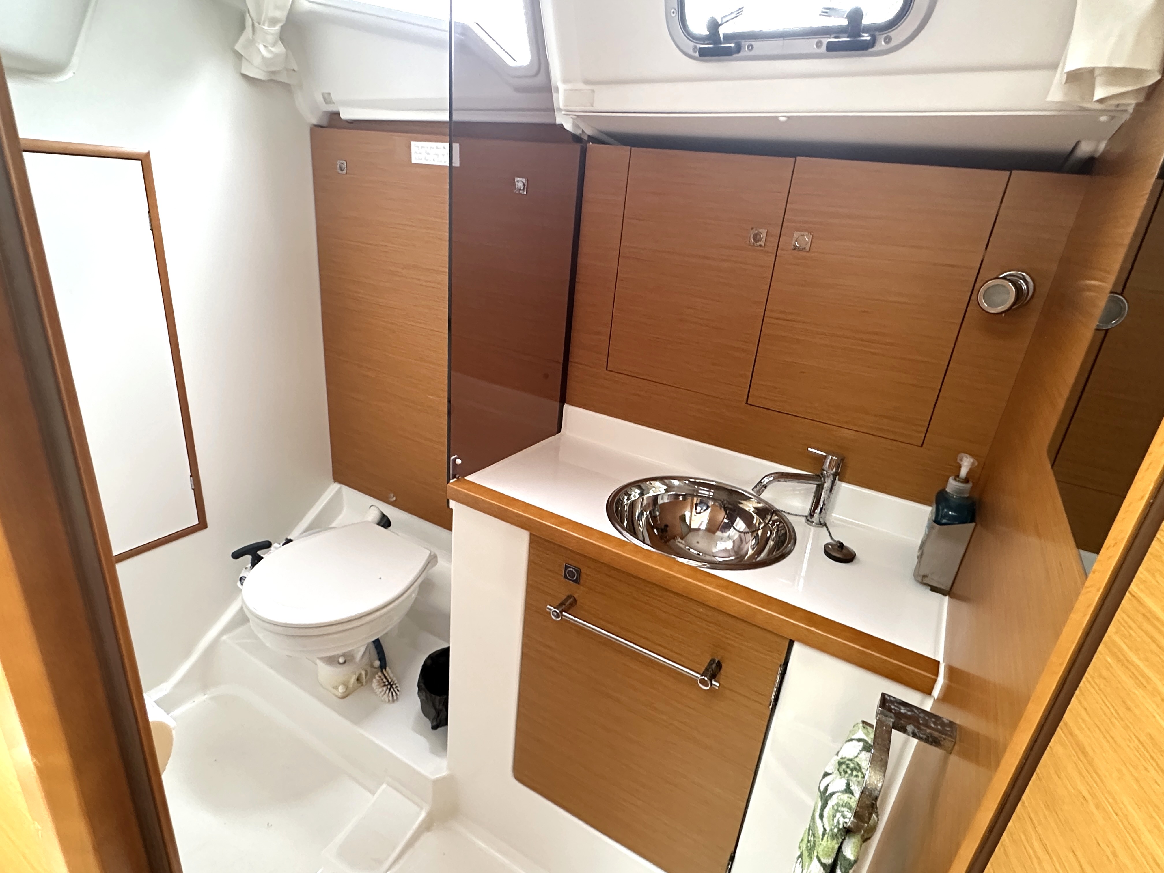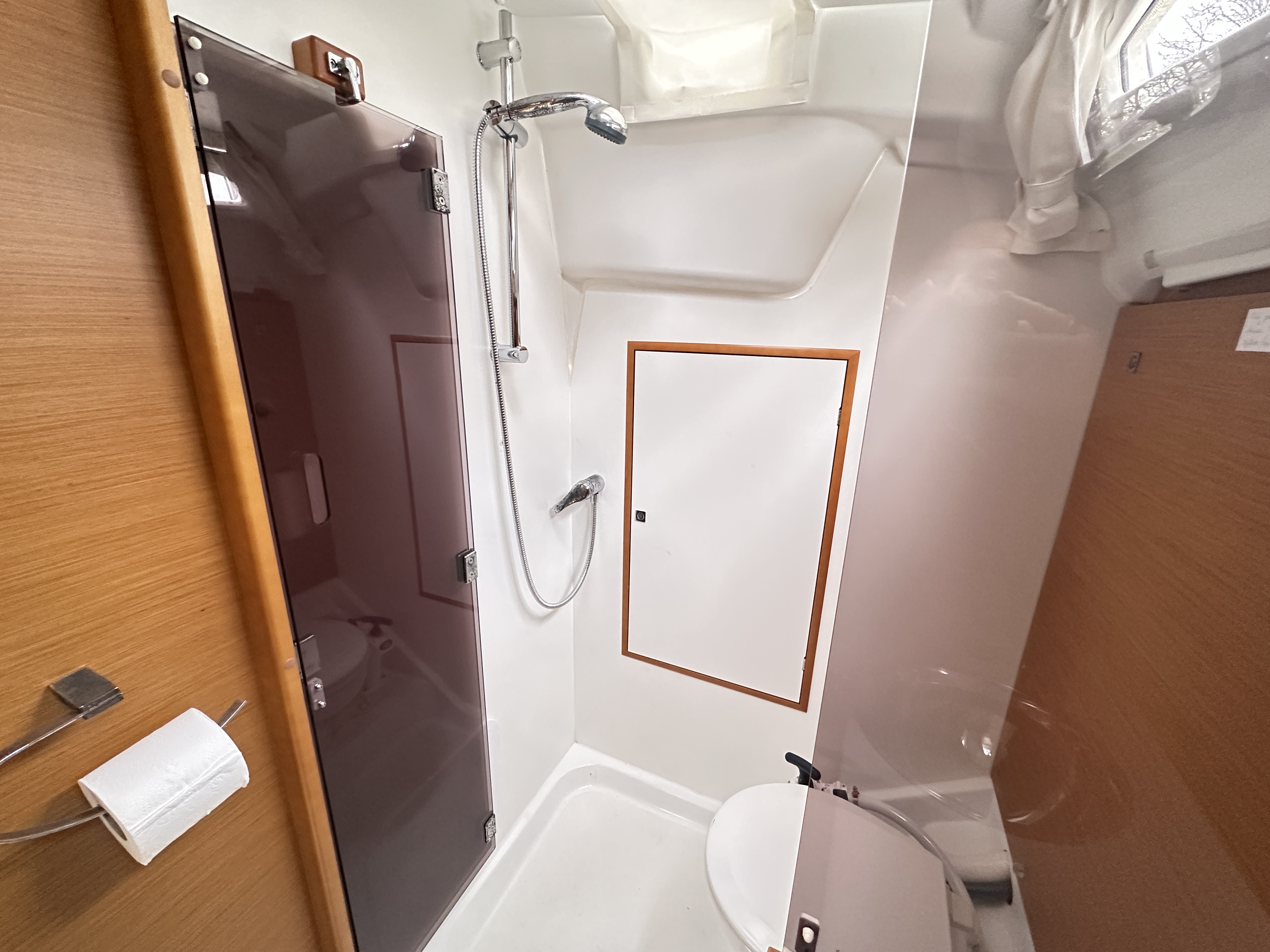 Heads compartment (port side) with marine toilet, wash basin (storage under), holding tank and shower