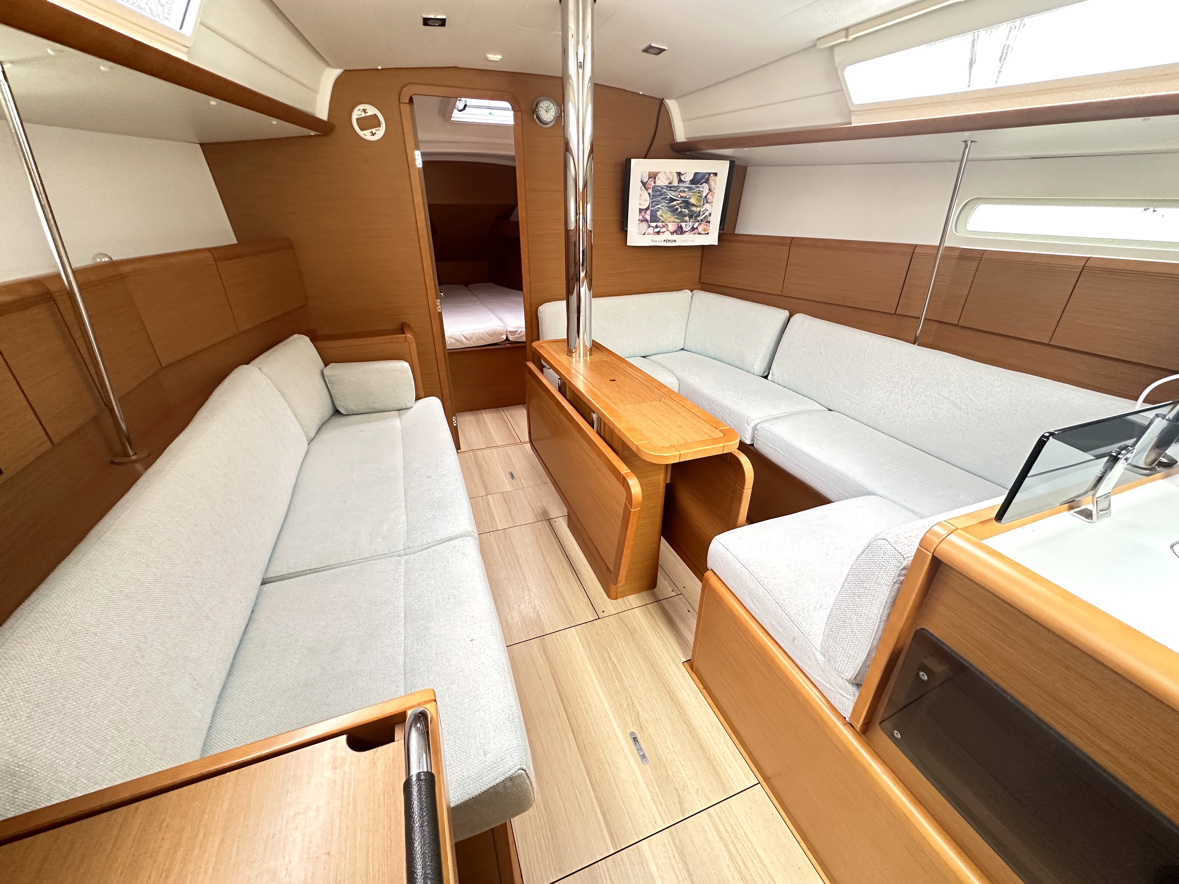 Saloon with U-shaped seating area to starboard, table with extension, upper storage cabinets, seating to port with storage locker forward and ceiling handrail