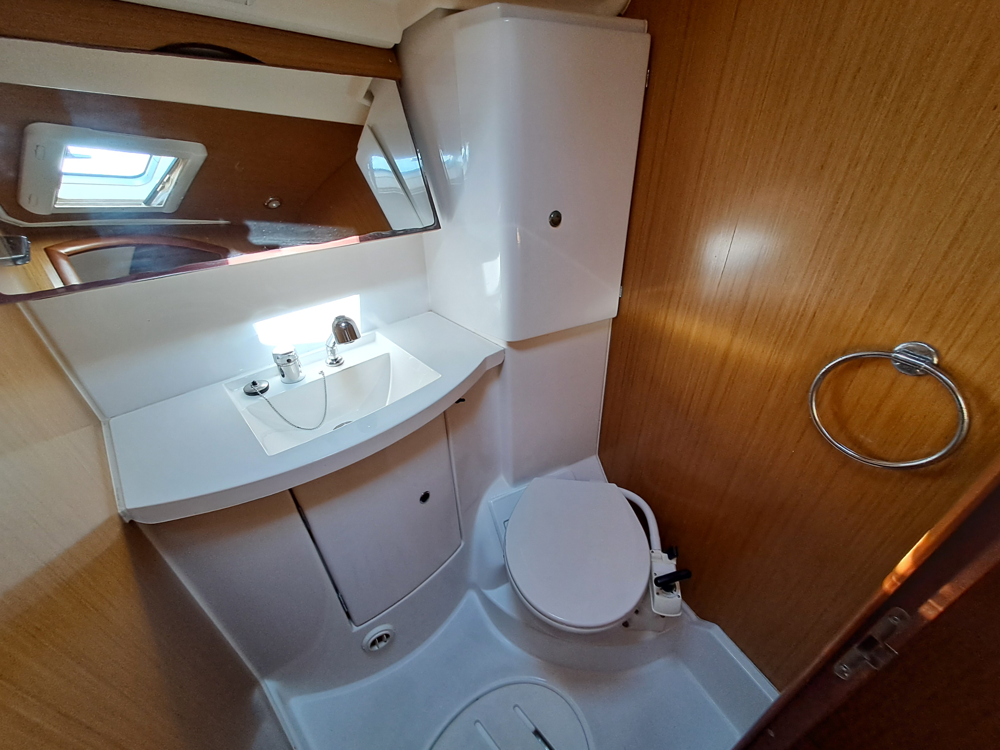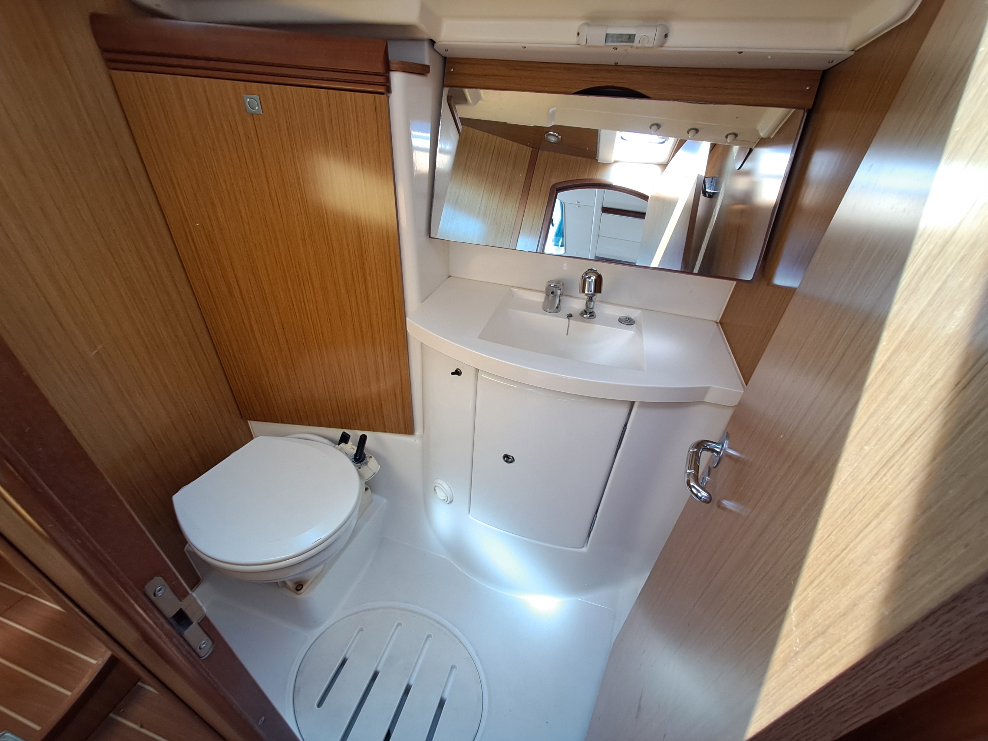 Spacious forward Owners Cabin with double berth (upgraded V berth mattresses), seat to side, hanging locker, opening hatch and ensuite with shower, Jabsco toilet, hand basin, mirror fronted vanity unit with storage and opening hatch.