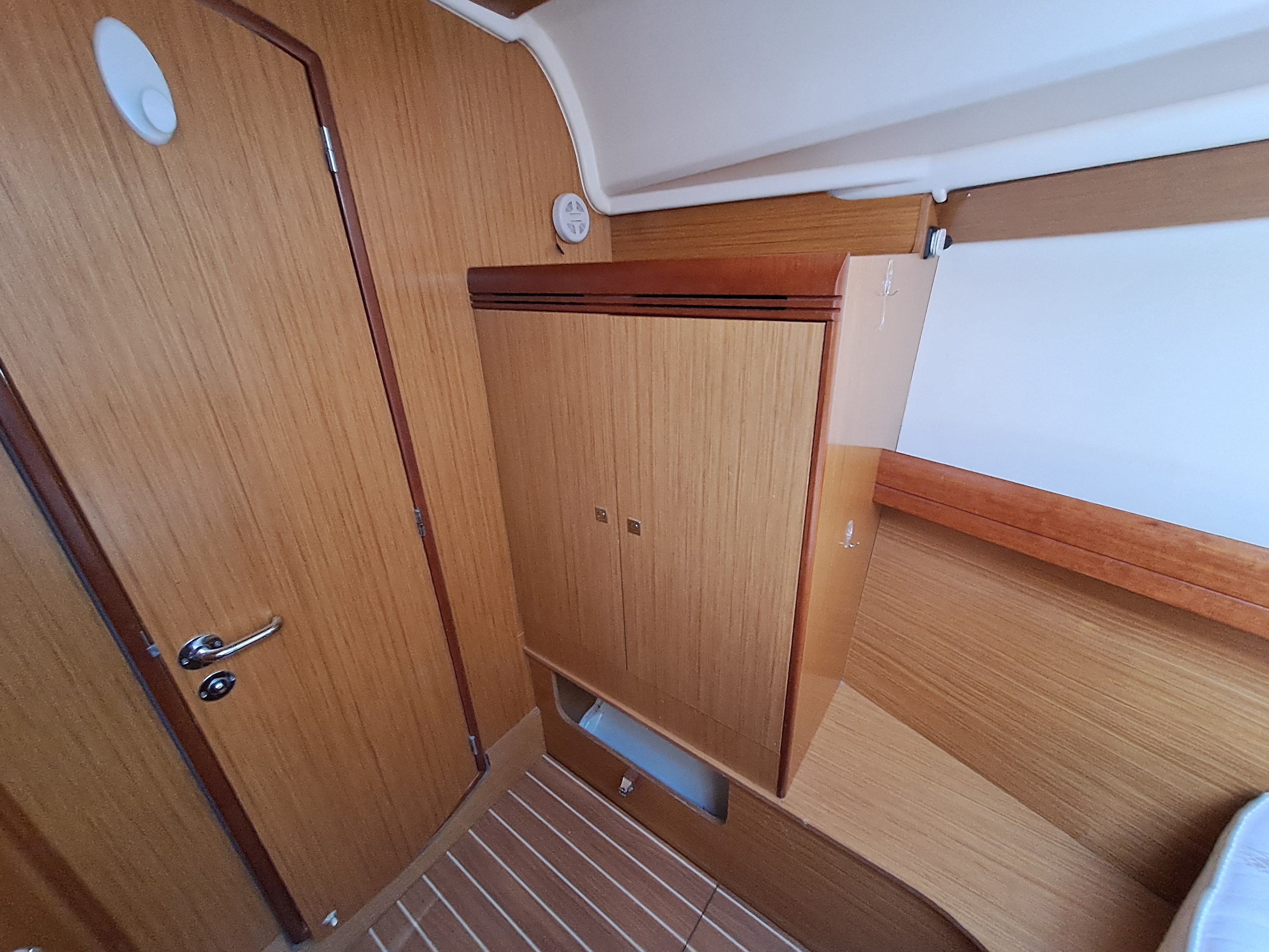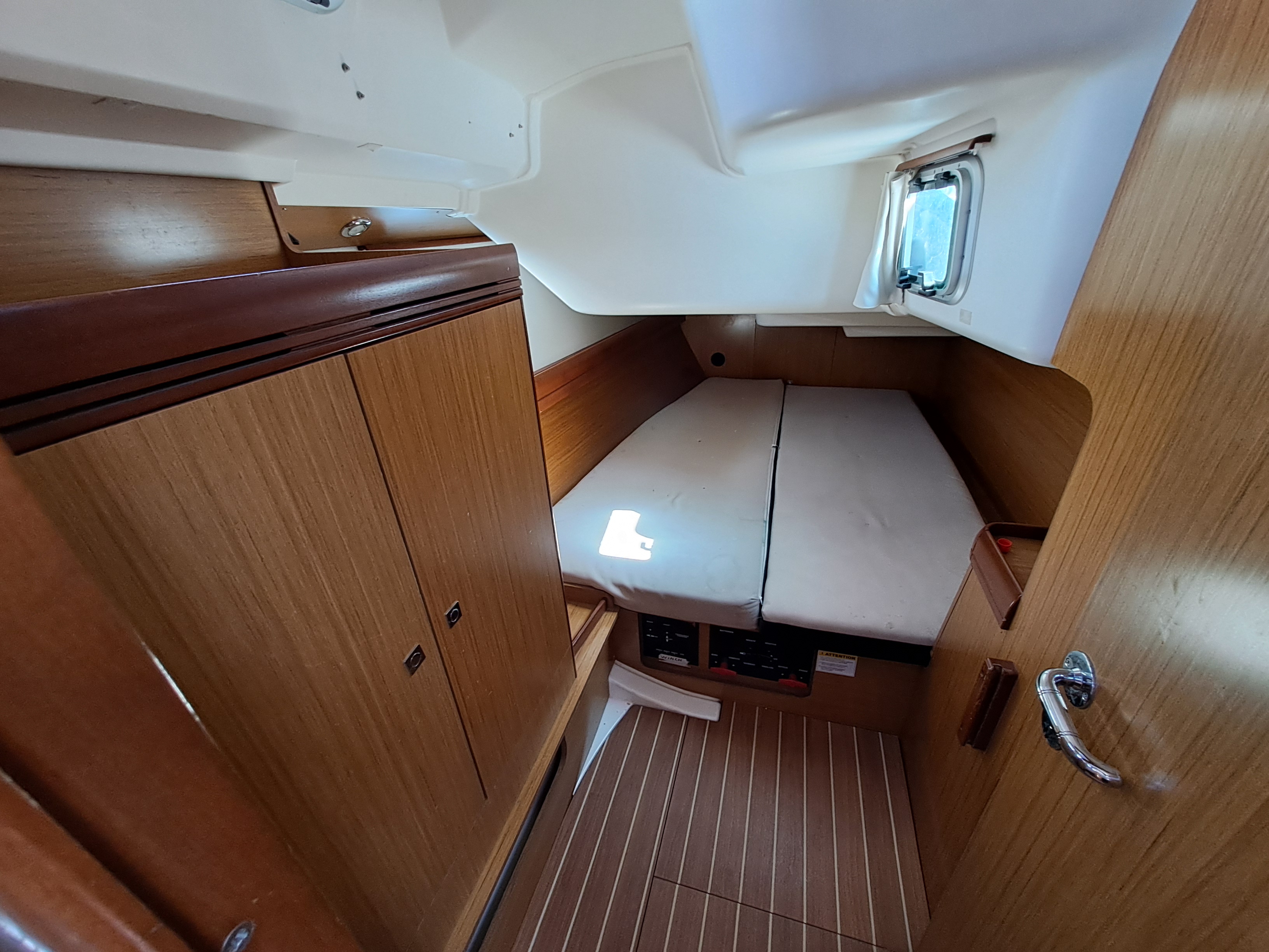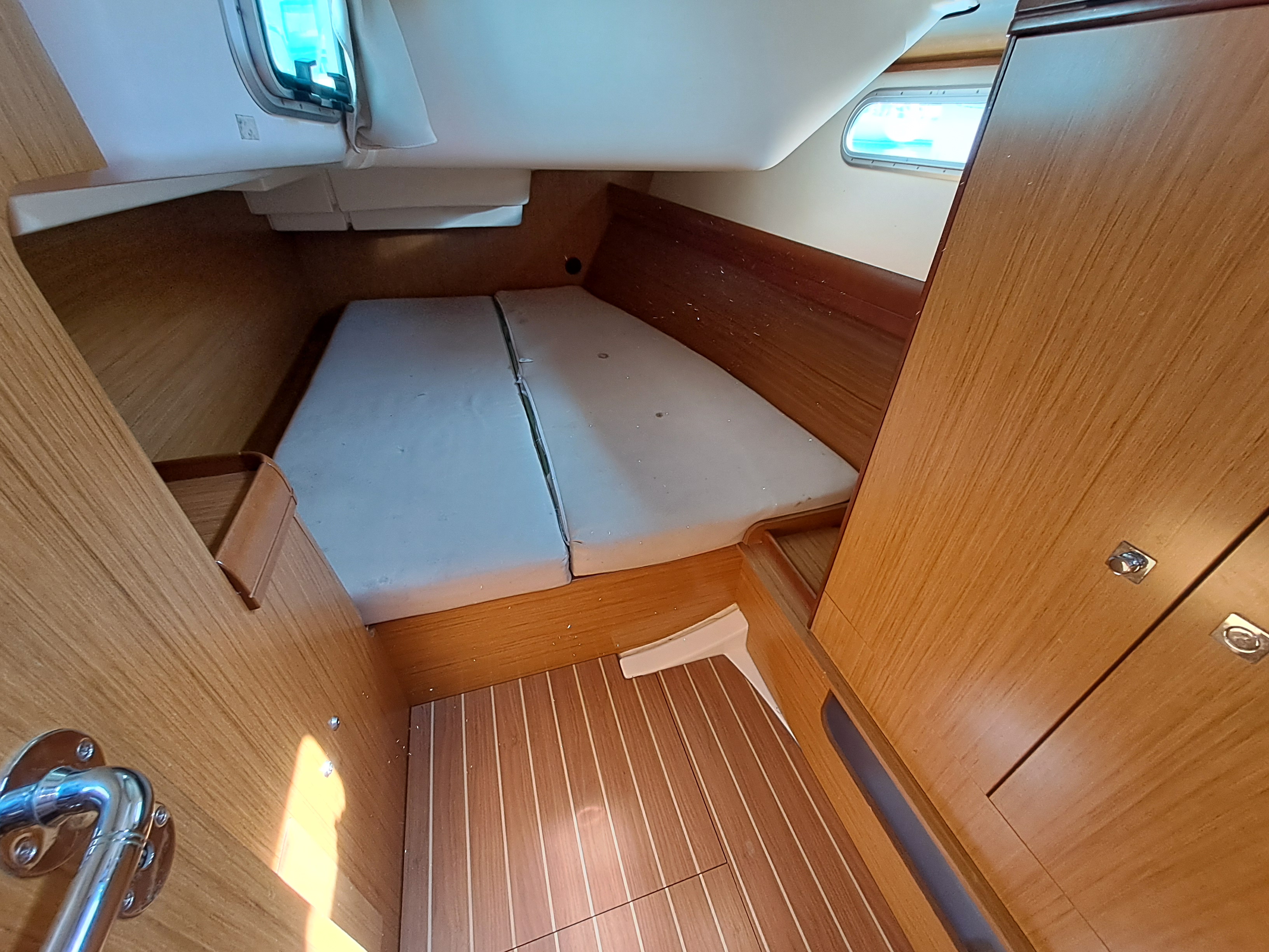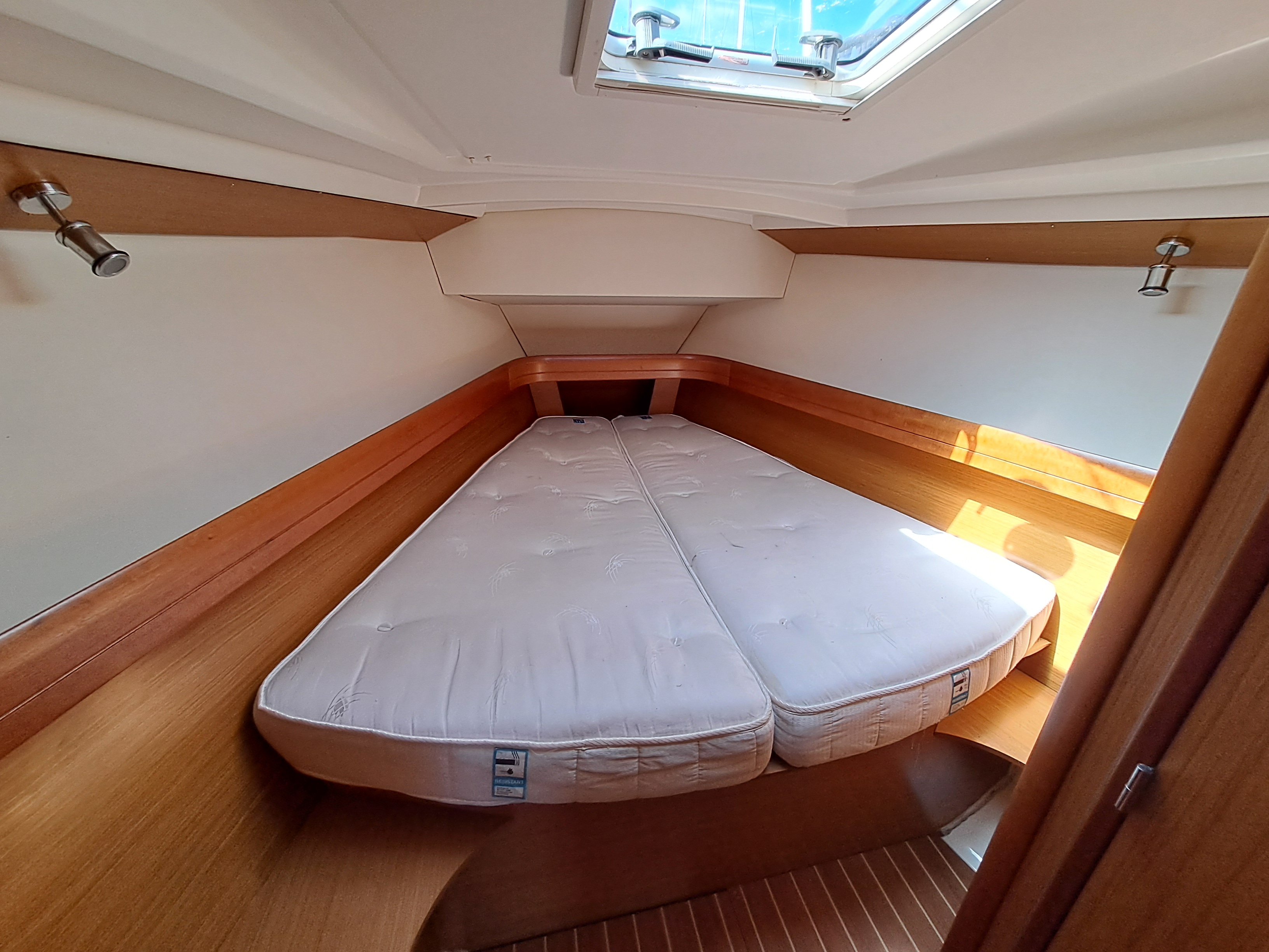 Light and airy twin double Aft Cabins with hanging wardrobes, ample storage space, two opening portlights, one opening hatch and hull portlight.