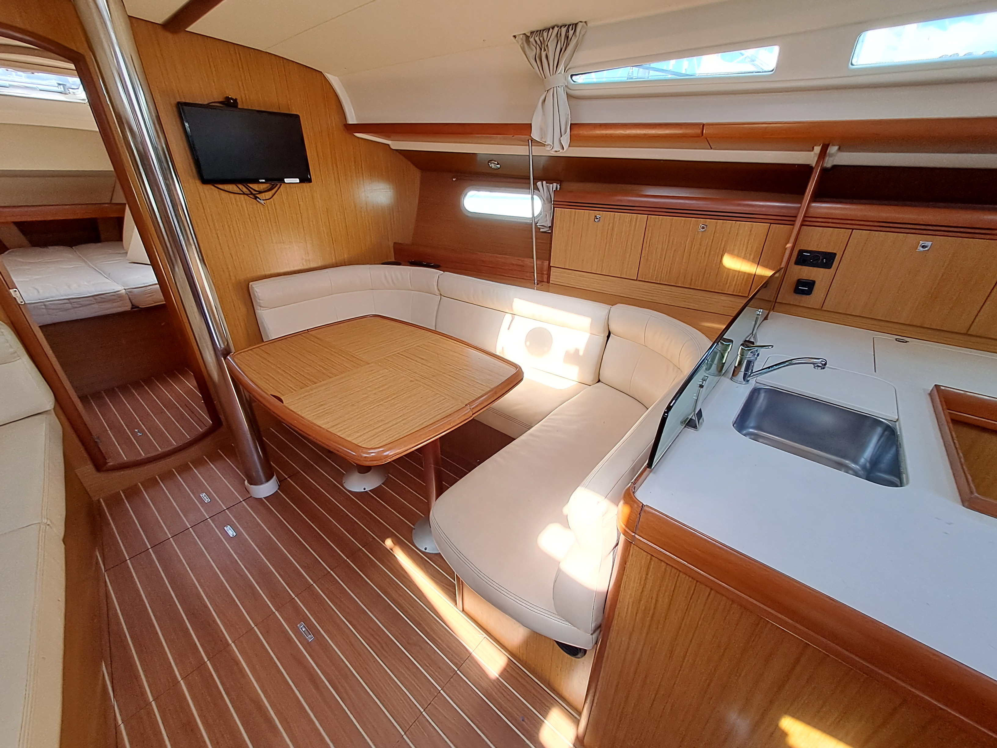 U-shaped seating area to starboard, wrap around cushions & storage under seating area.