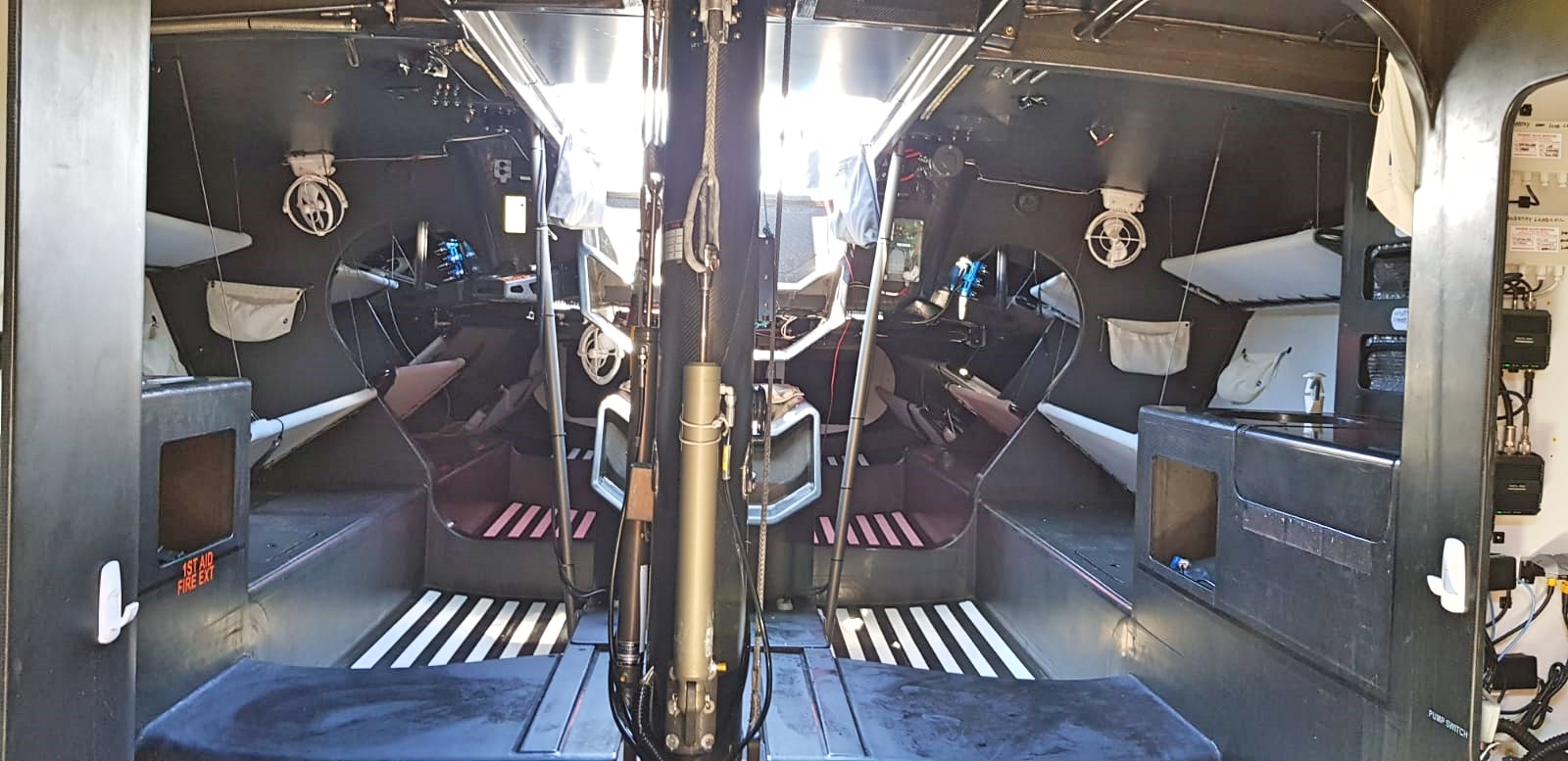 o Water Ballast Installation: 730L per side, Fwd and Aft Tank. Manual below deck fill/dump w/ 2x Rule 3800 pumps. Pump operation buttons below deck. Automatic transfer gate valves on each tank operated with Firgelli actuators. Transfer button on deck, on main sheet pod.