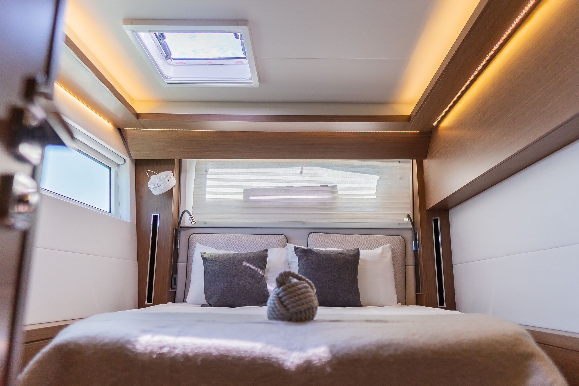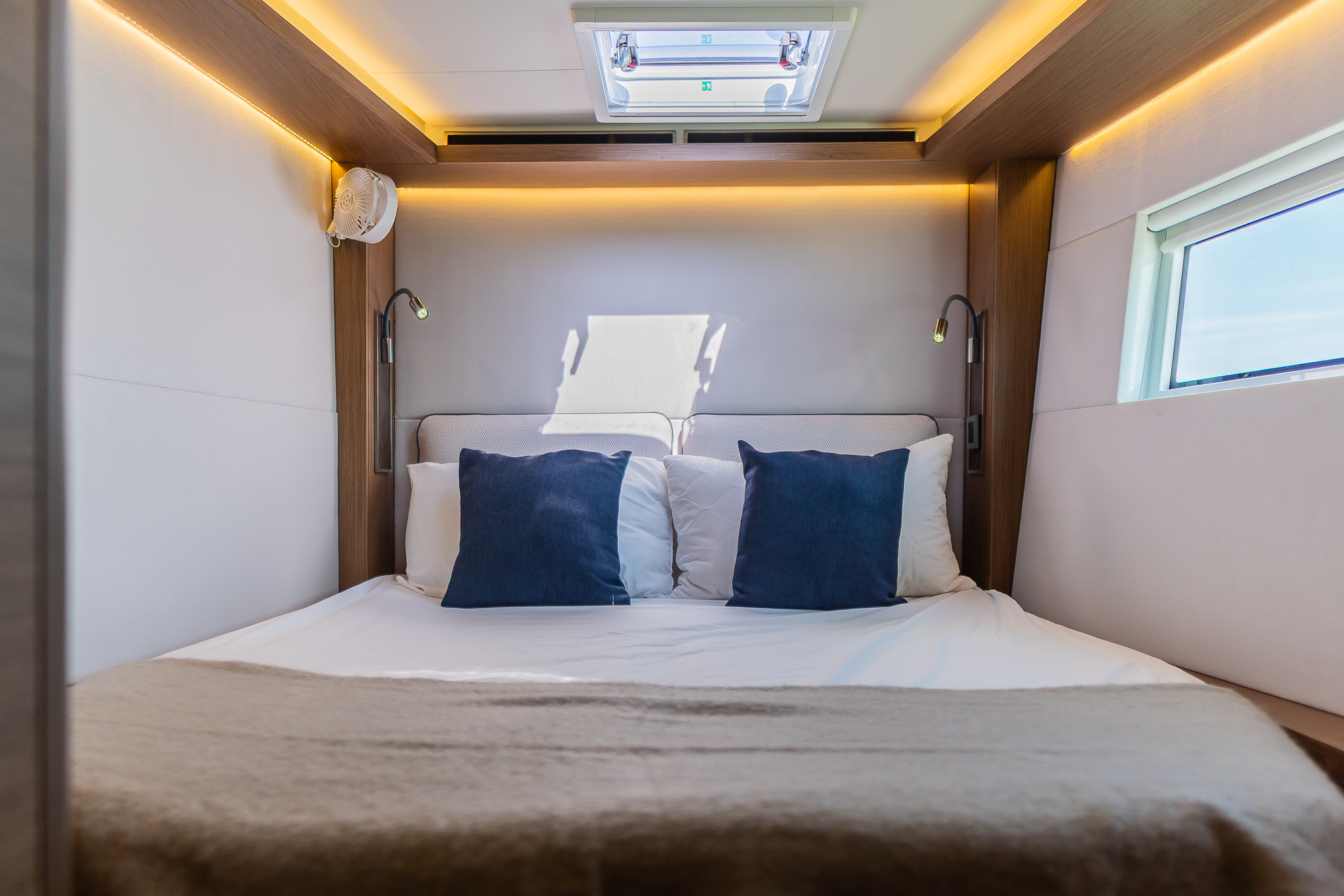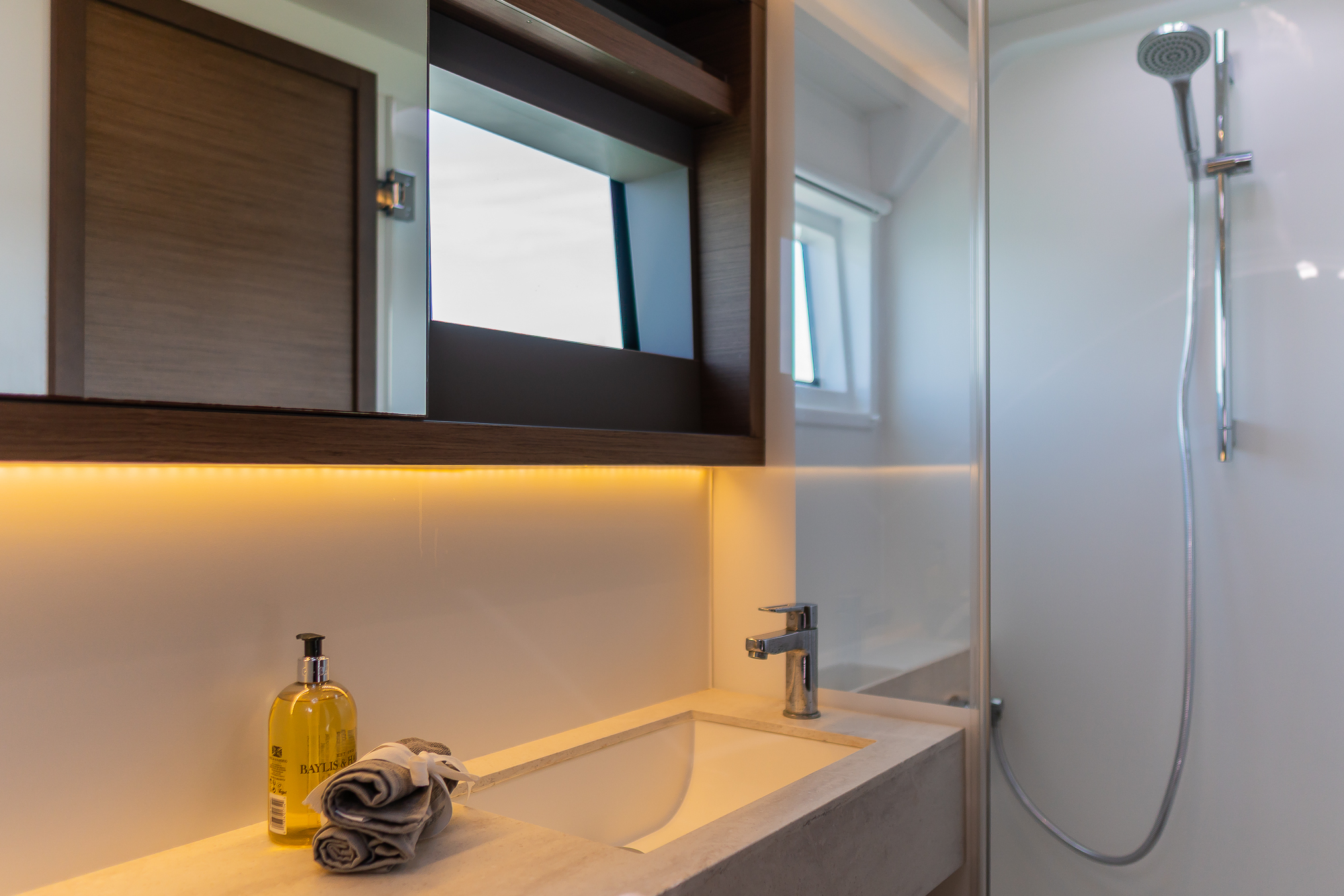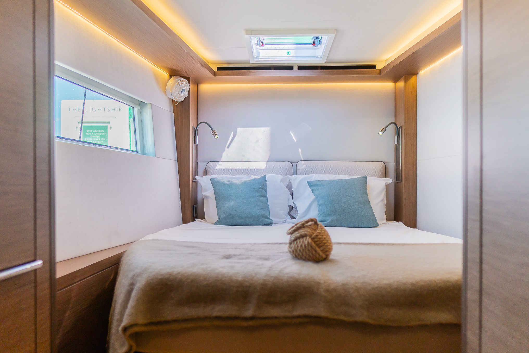 In each hull are two double cabins with ensuite bathrooms with another cabin midships. Port hole and window in aft cabin with blind.