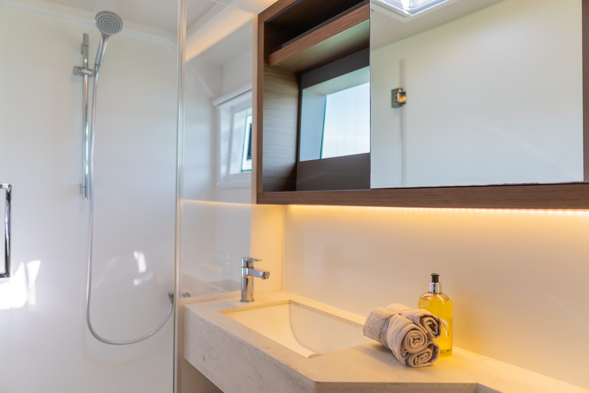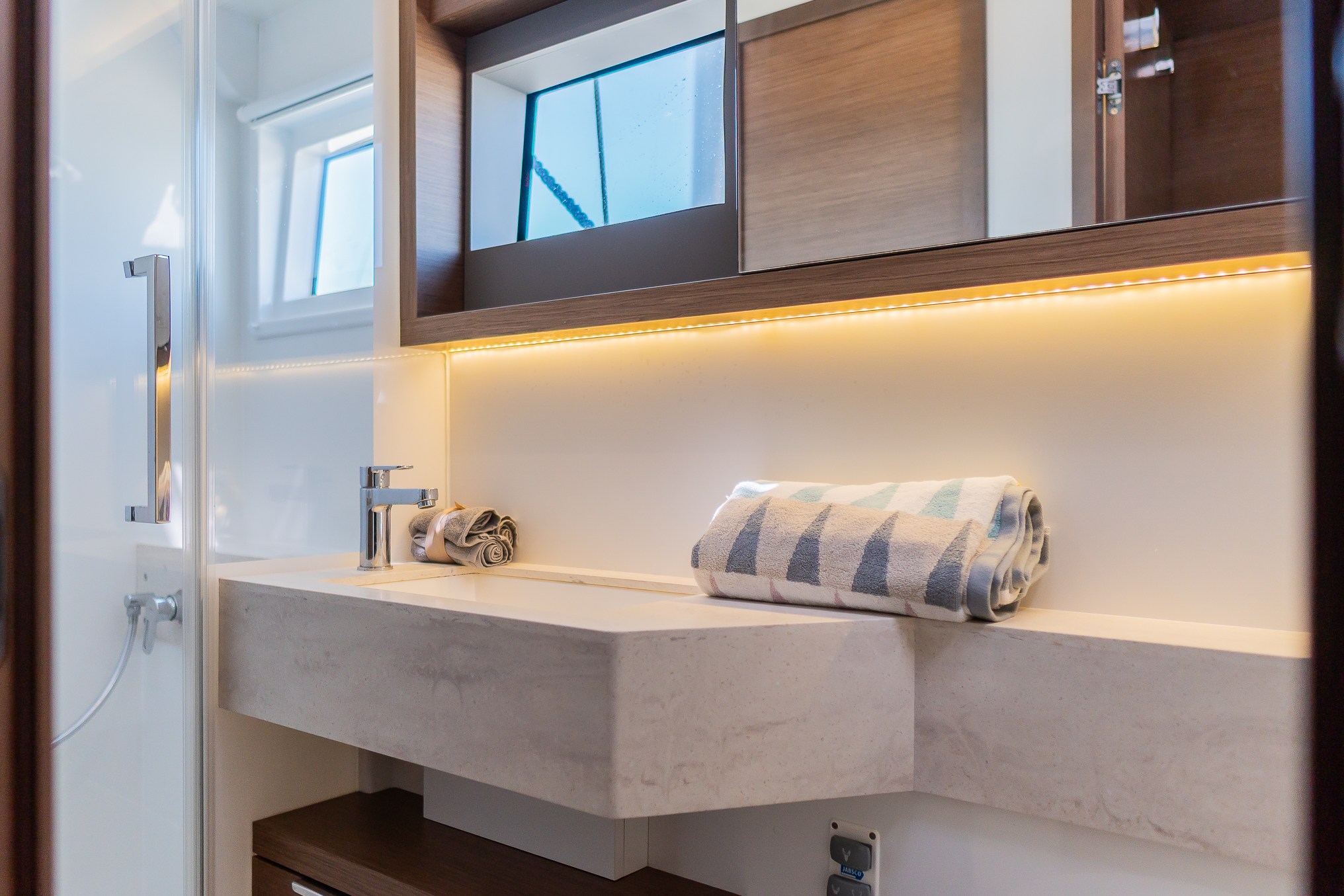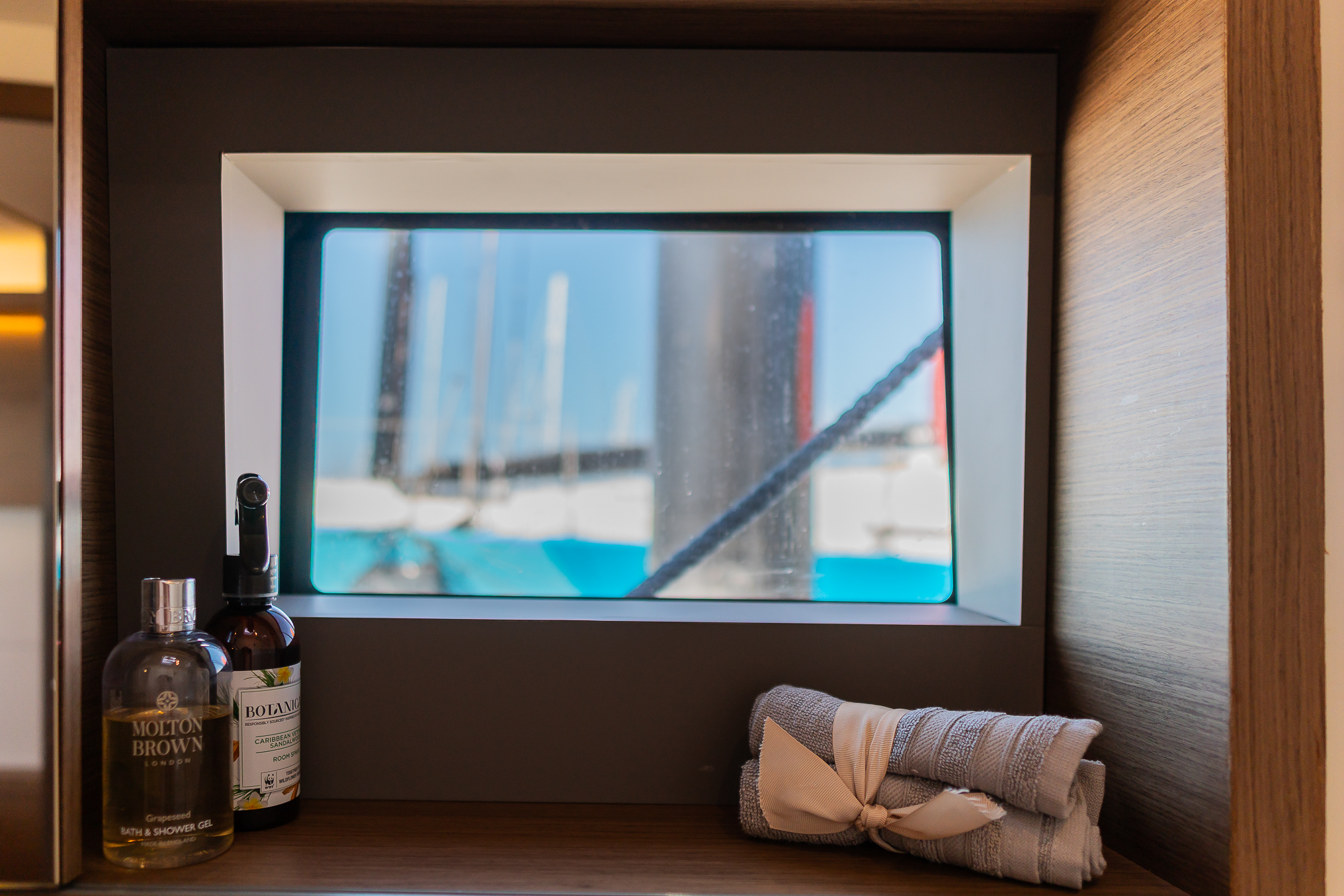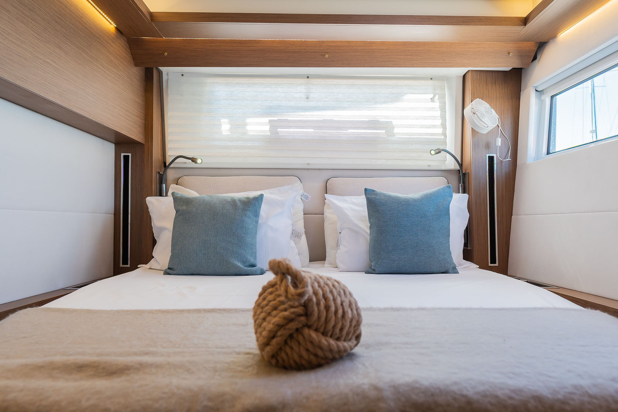 In each hull are two double cabins with ensuite bathrooms with another cabin midships. Port hole and window in aft cabin with blind.