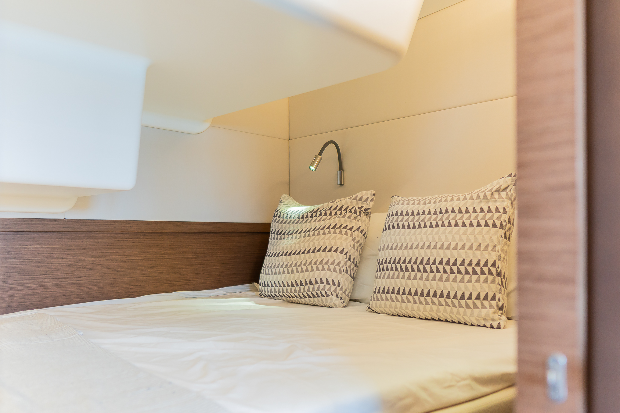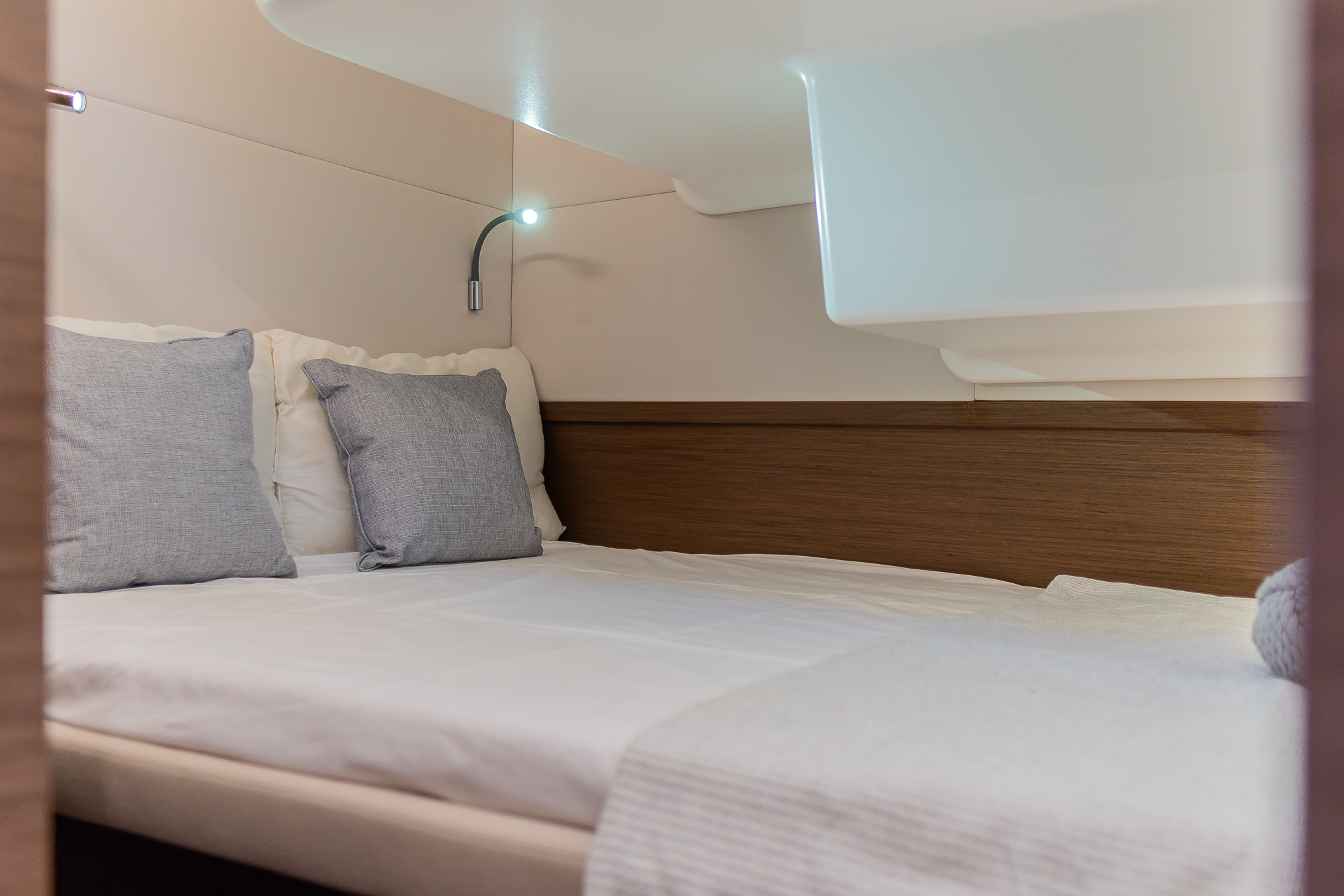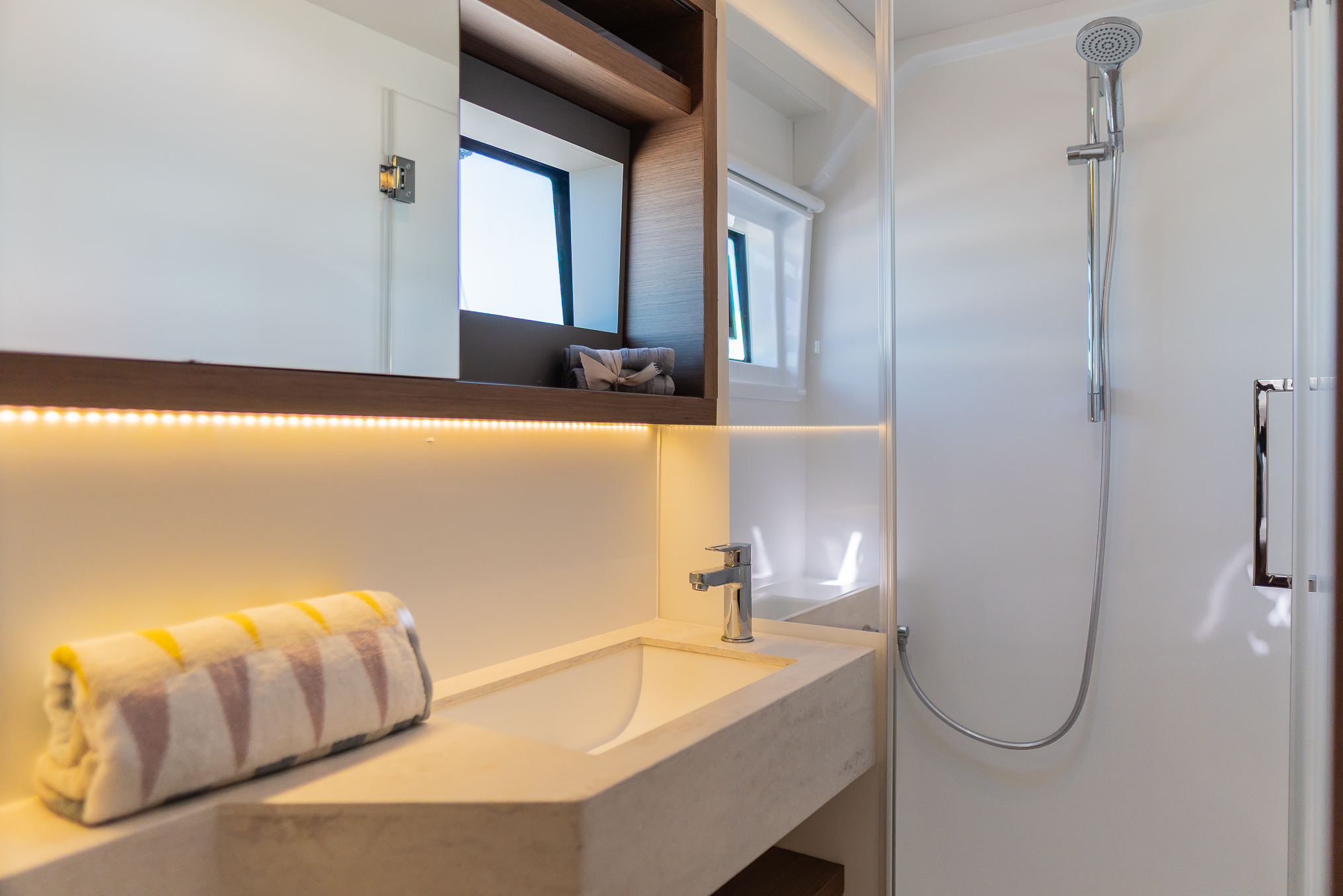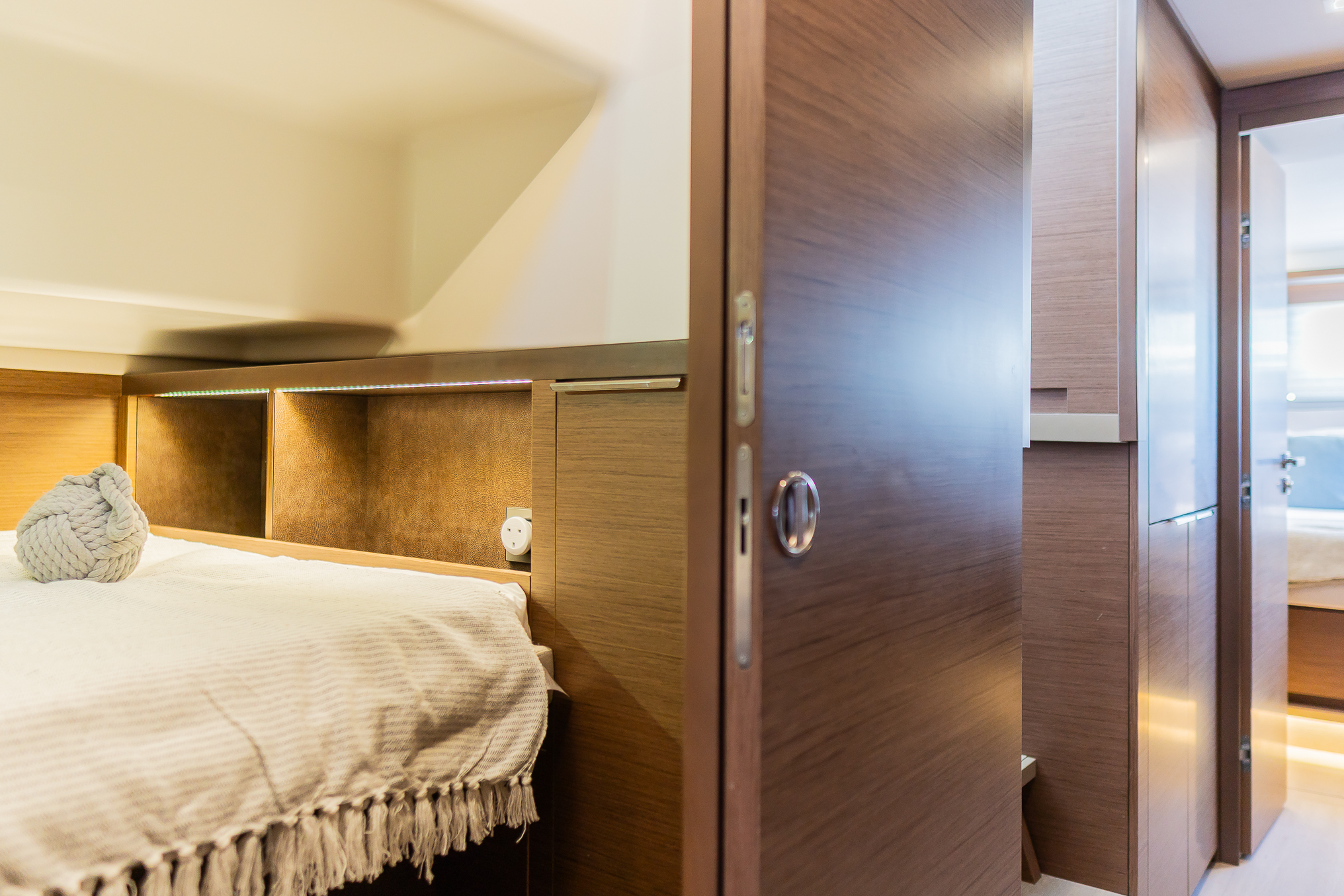 In each hull are two double cabins with ensuite bathrooms with another cabin midships. Port hole and window in aft cabin with blind.