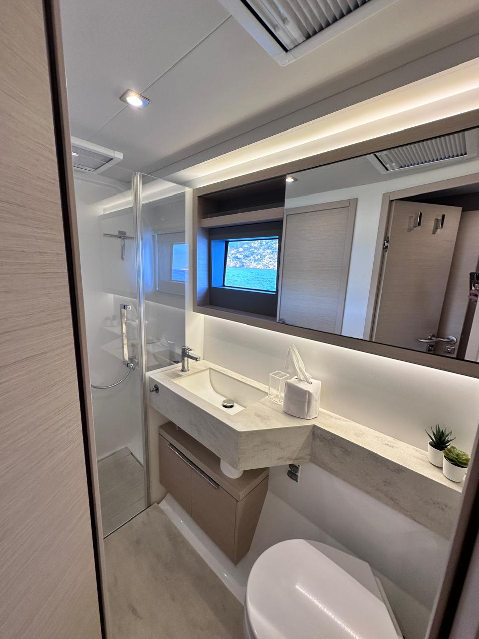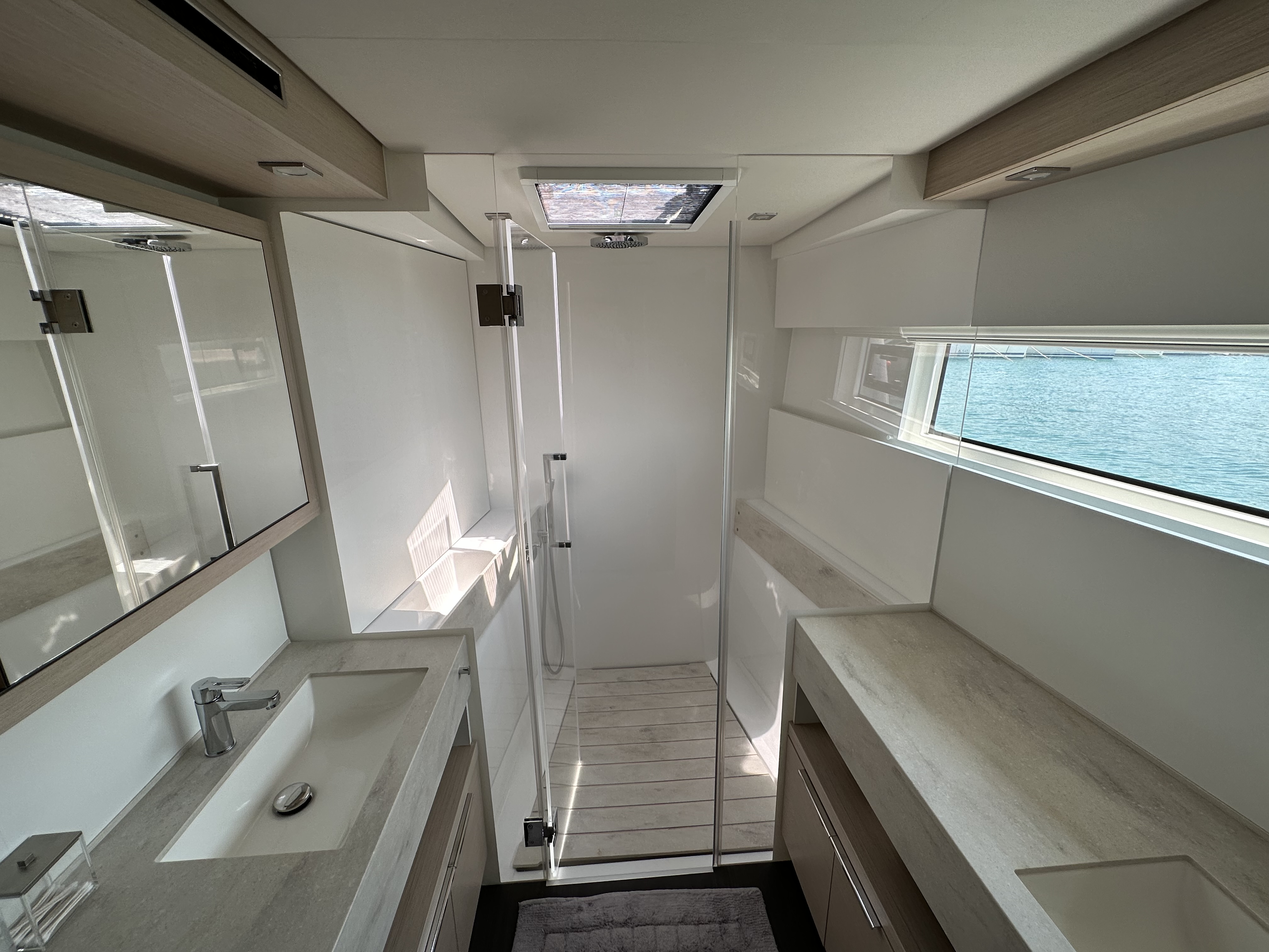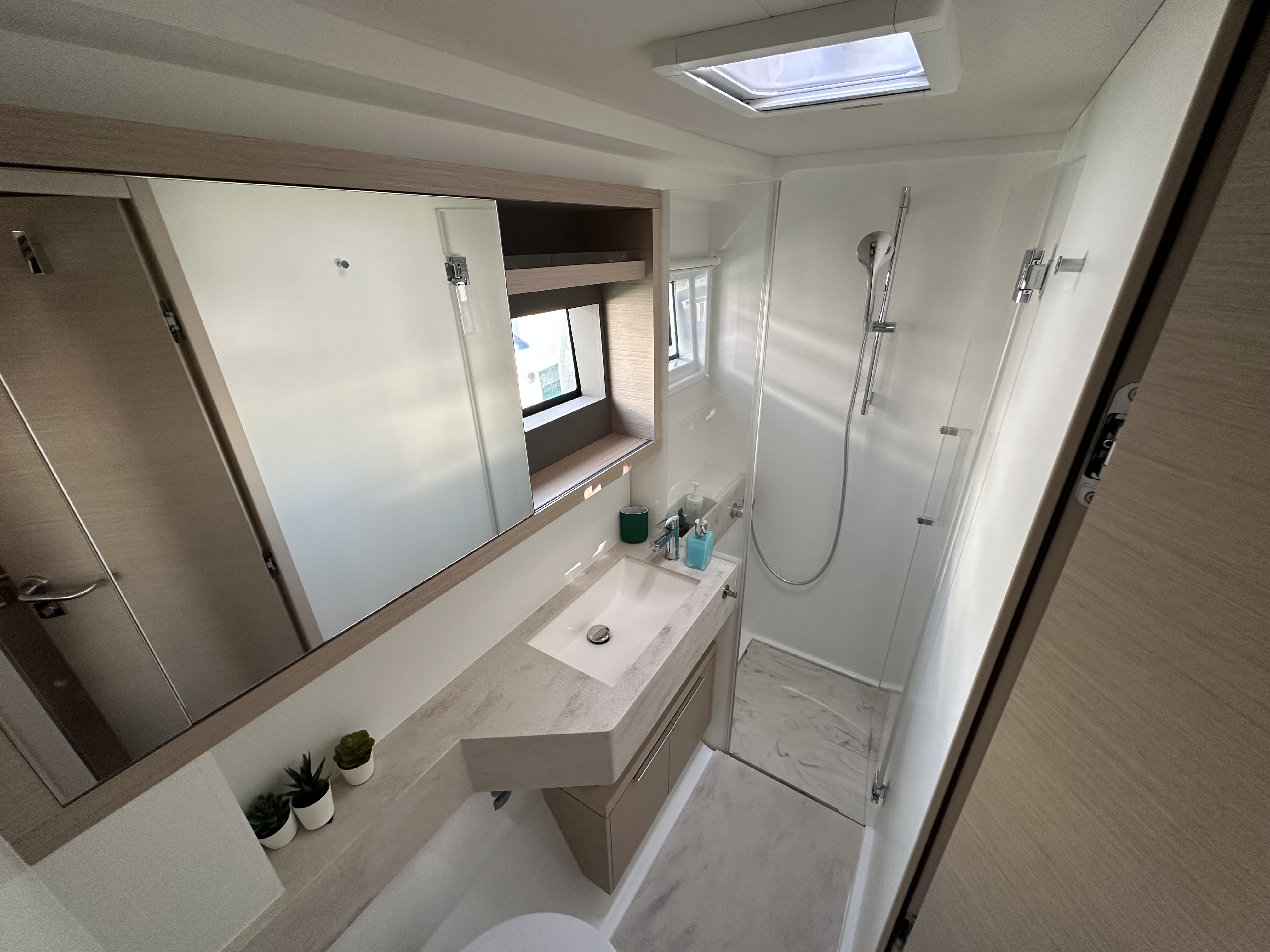 In the port hull are two double cabins with ensuite bathrooms with another cabin midships.