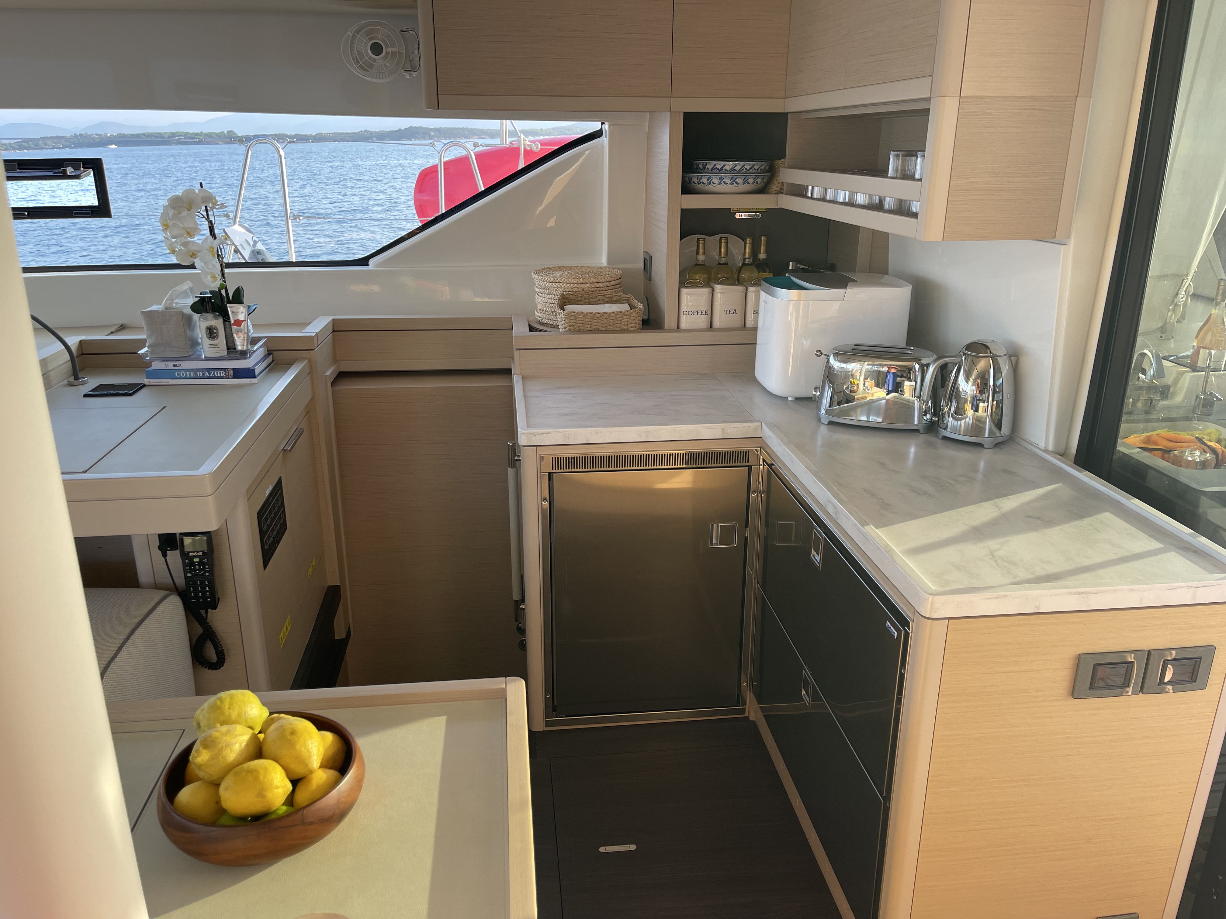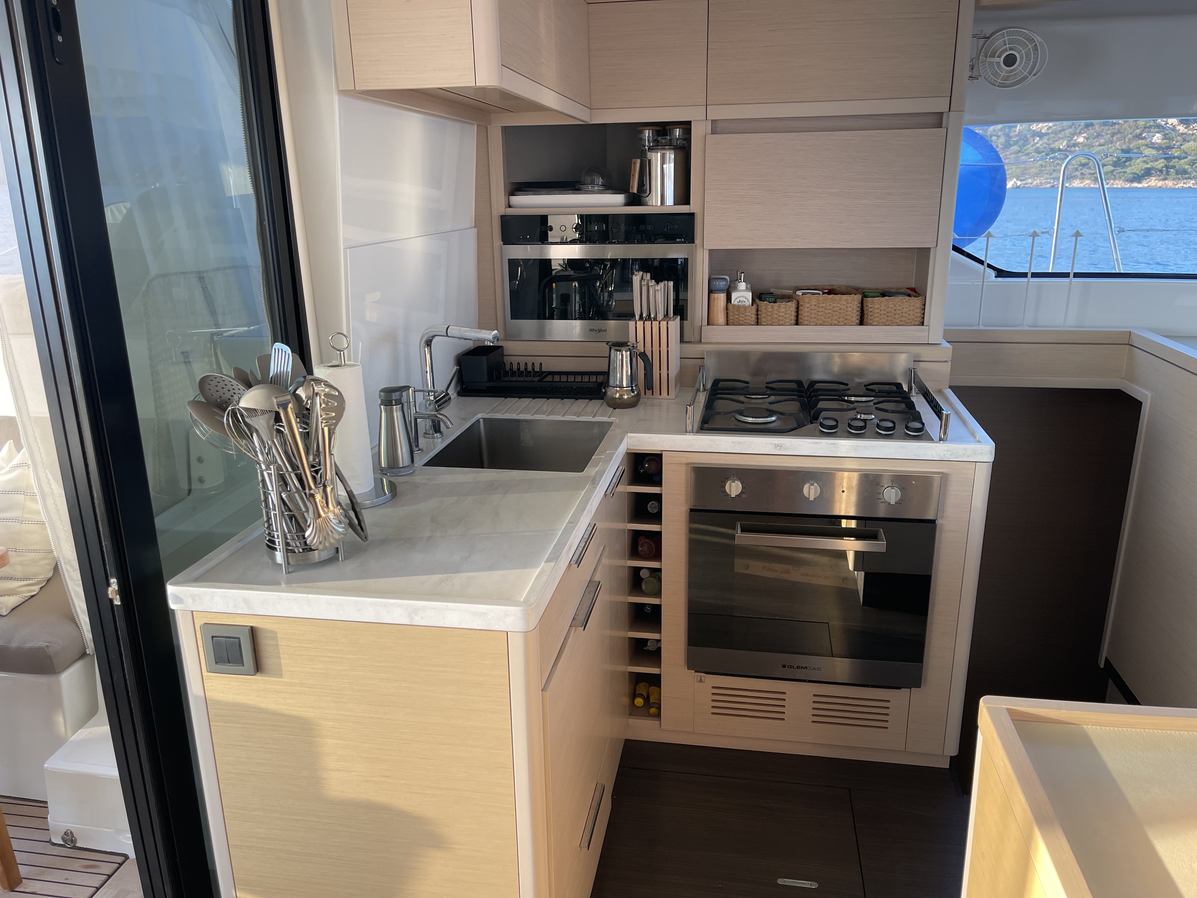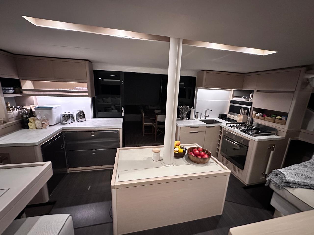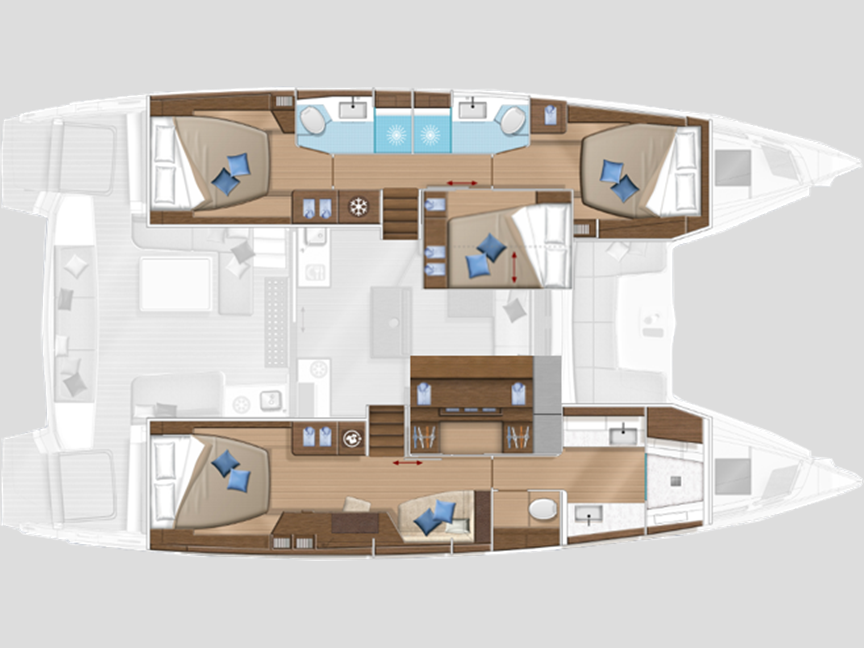 In the port hull are two double cabins with ensuite bathrooms with another cabin midships.