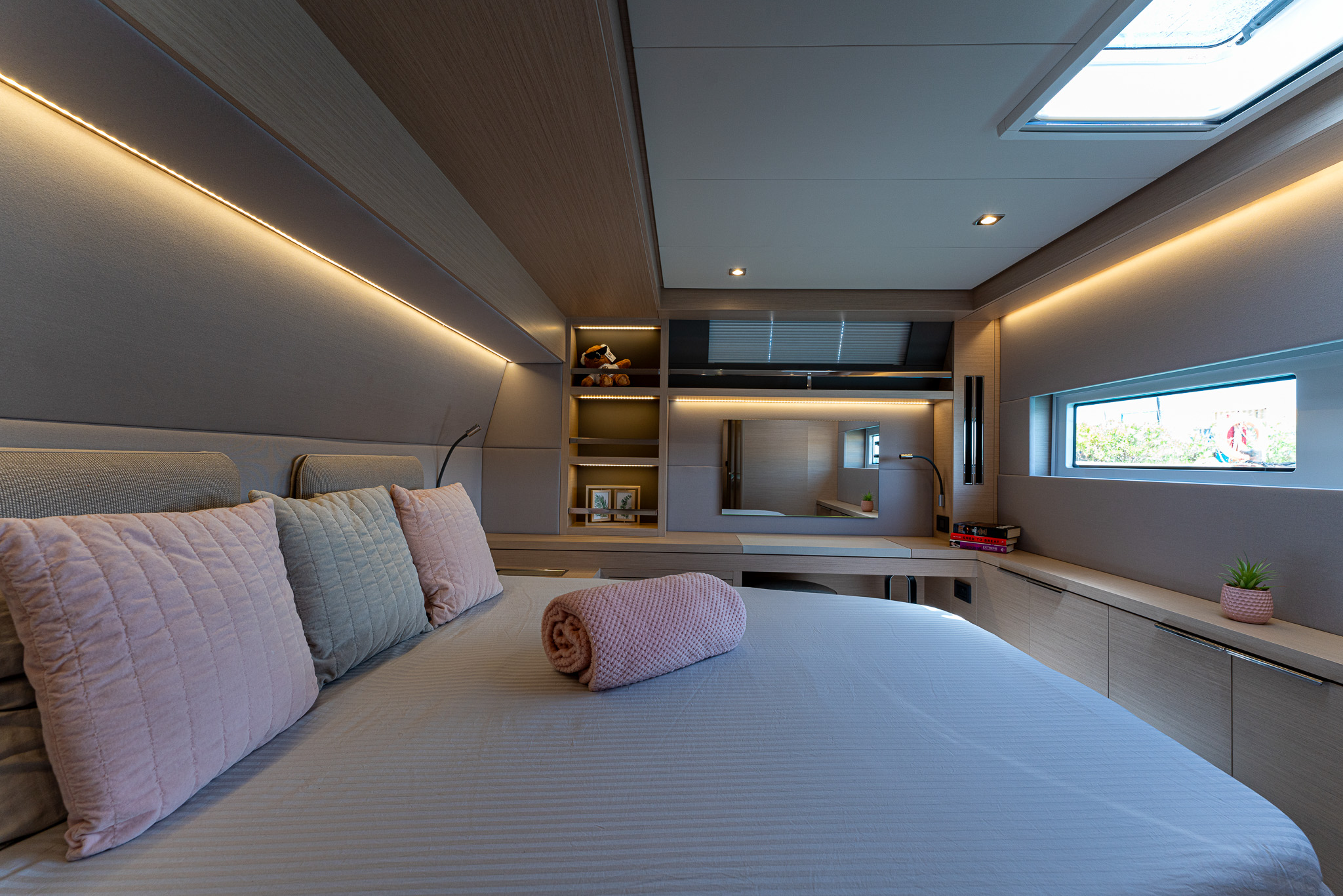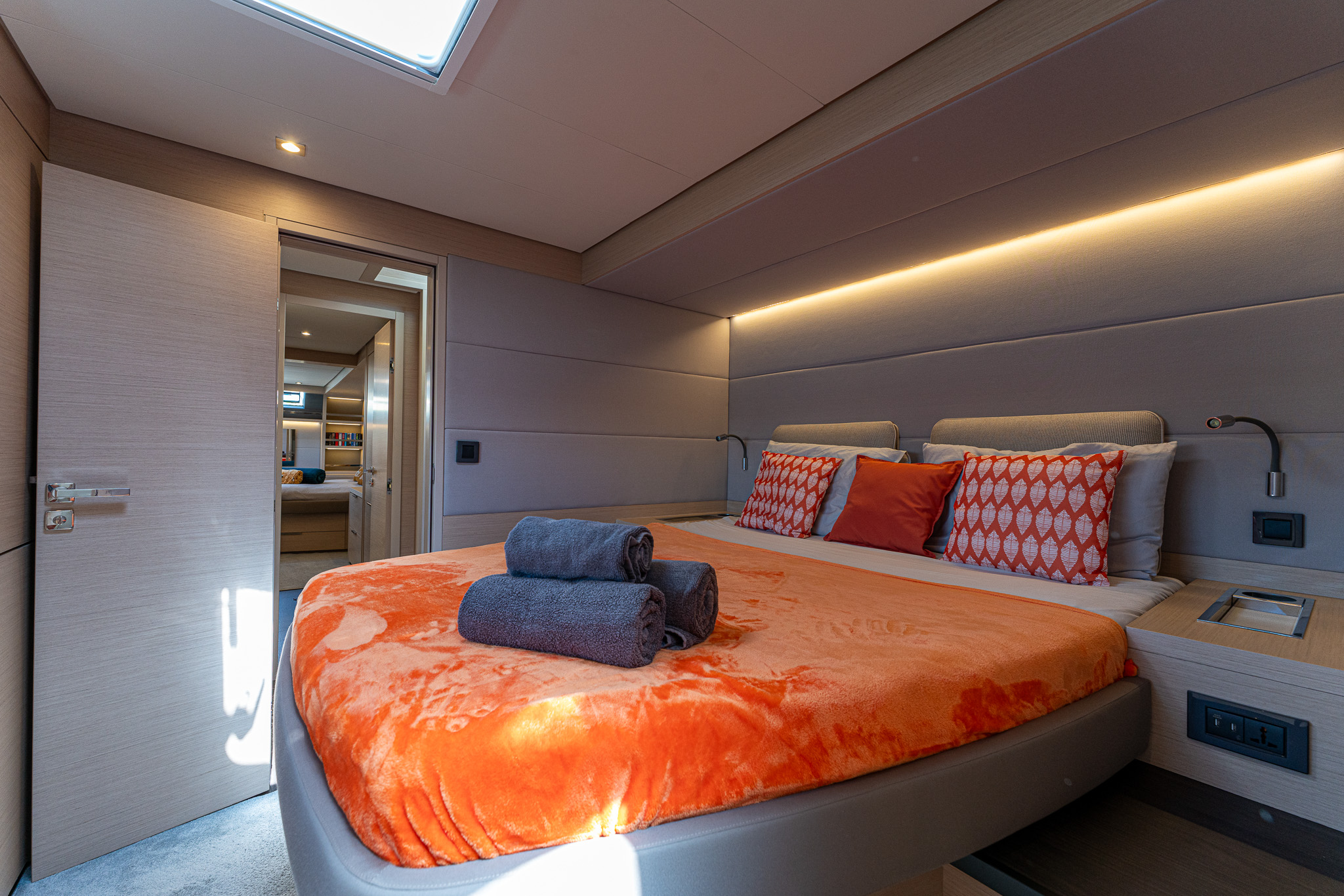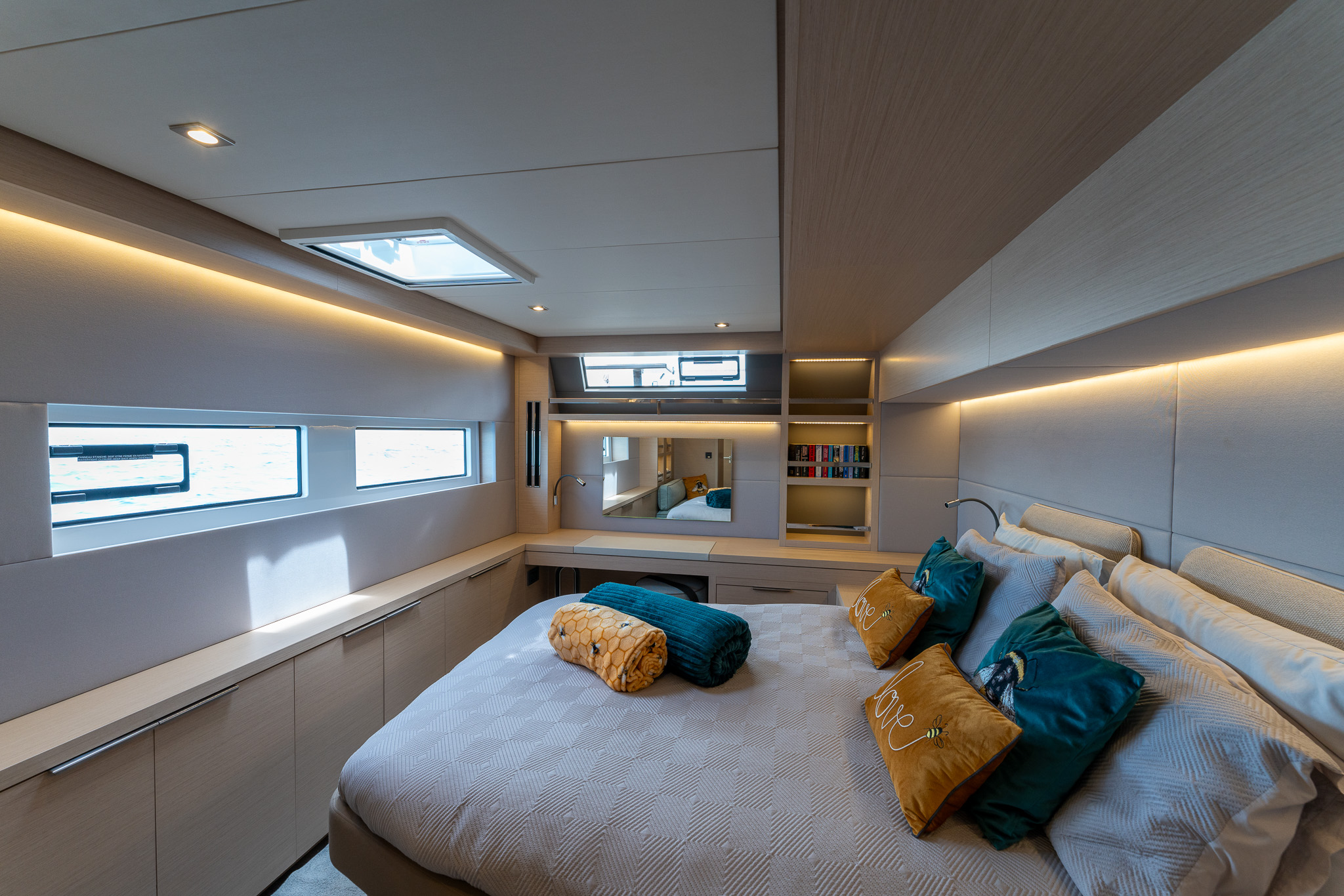 Spacious owners cabin (to starboard) with lateral access double bed, storage units, desk and sofa.