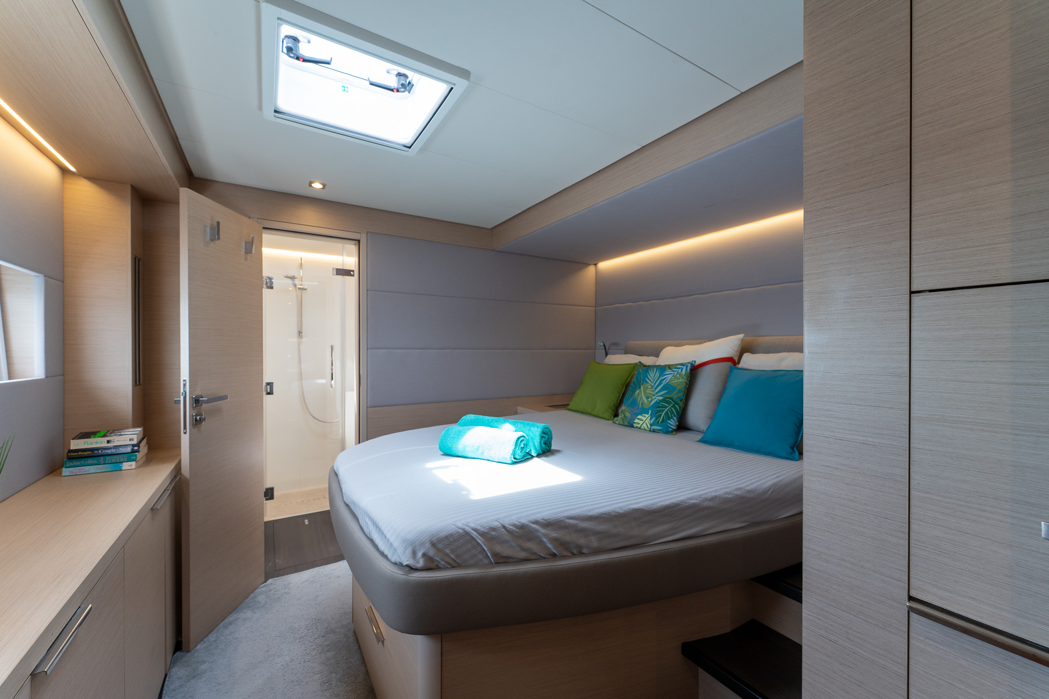 One guest cabin forward in each hull (Port and Starboard) each with double bed, storage and ensuite heads with Corian countertops, integrated sink, contained shower and toilet.