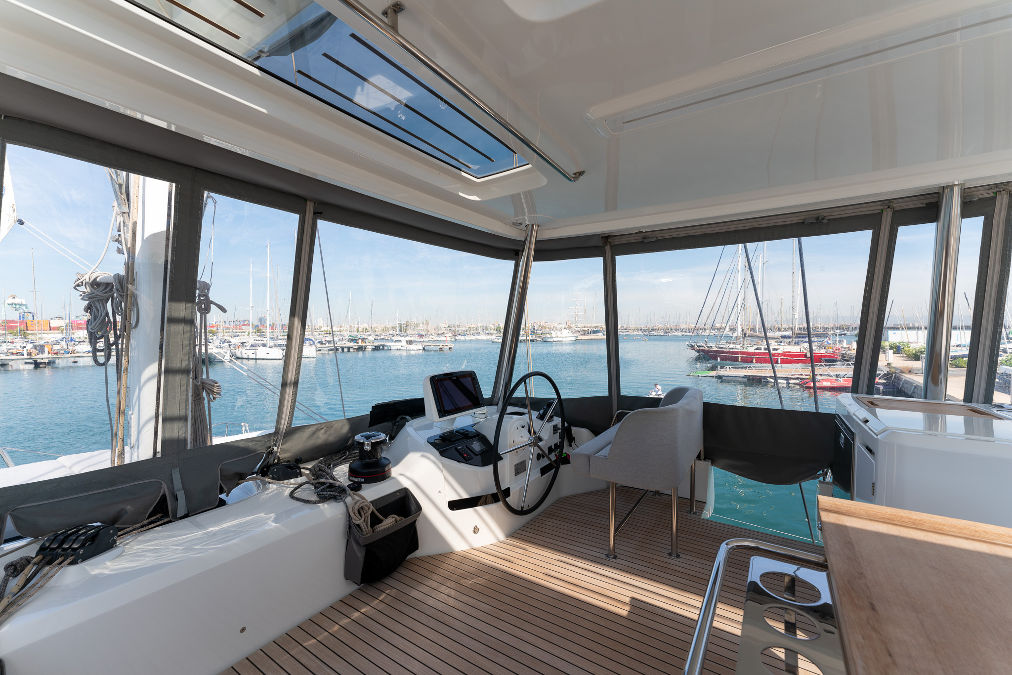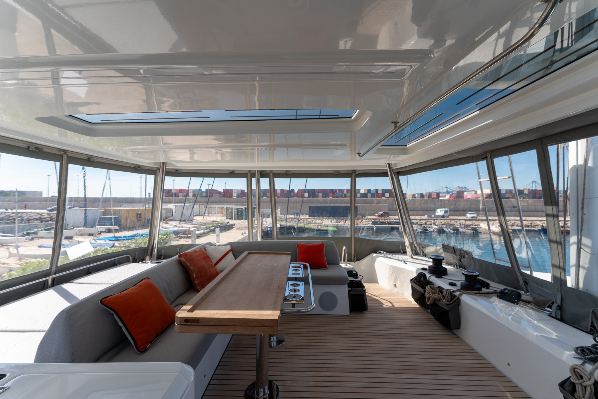 Additional port and starboard seats in forward cockpit with wooden table