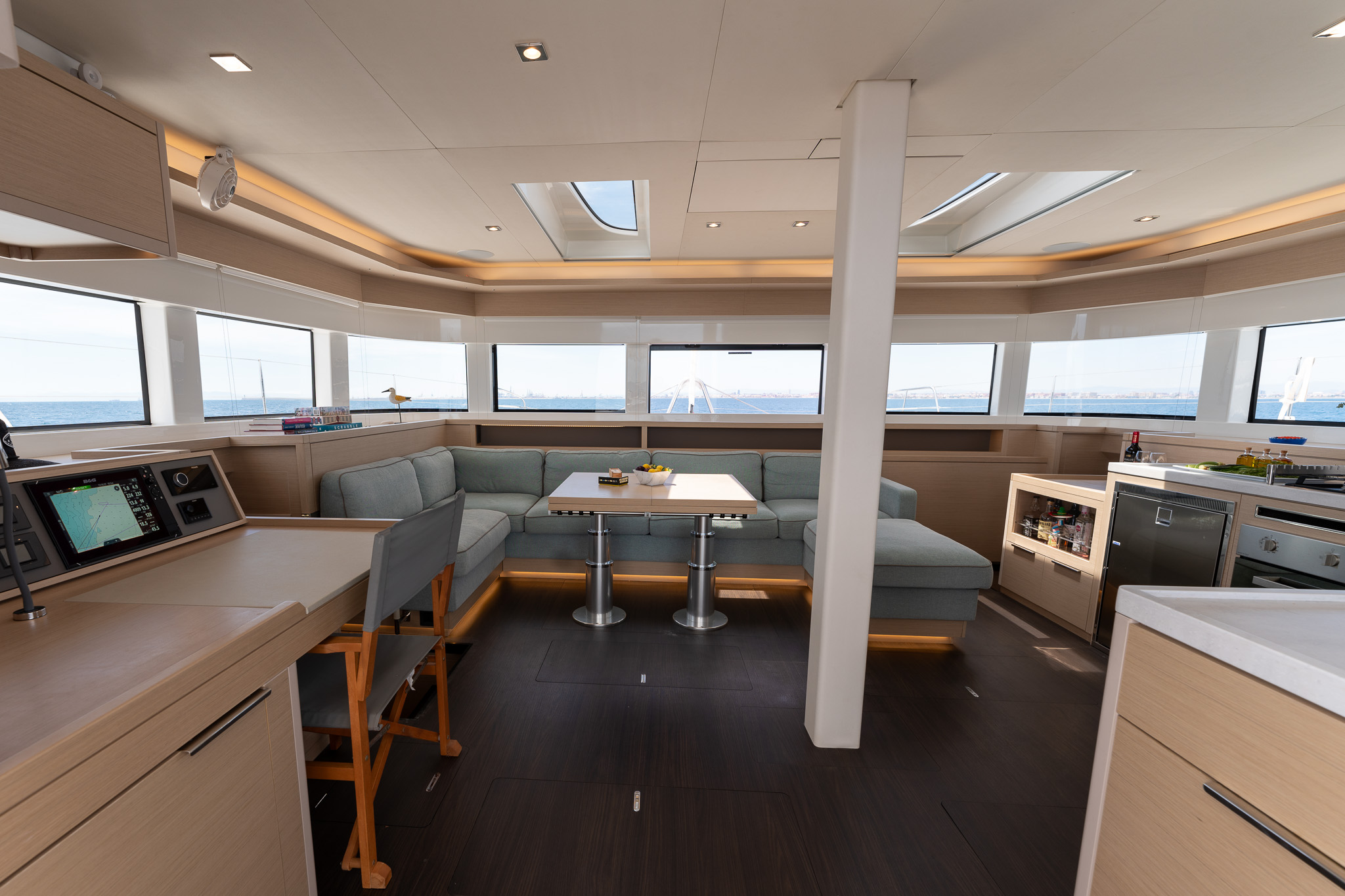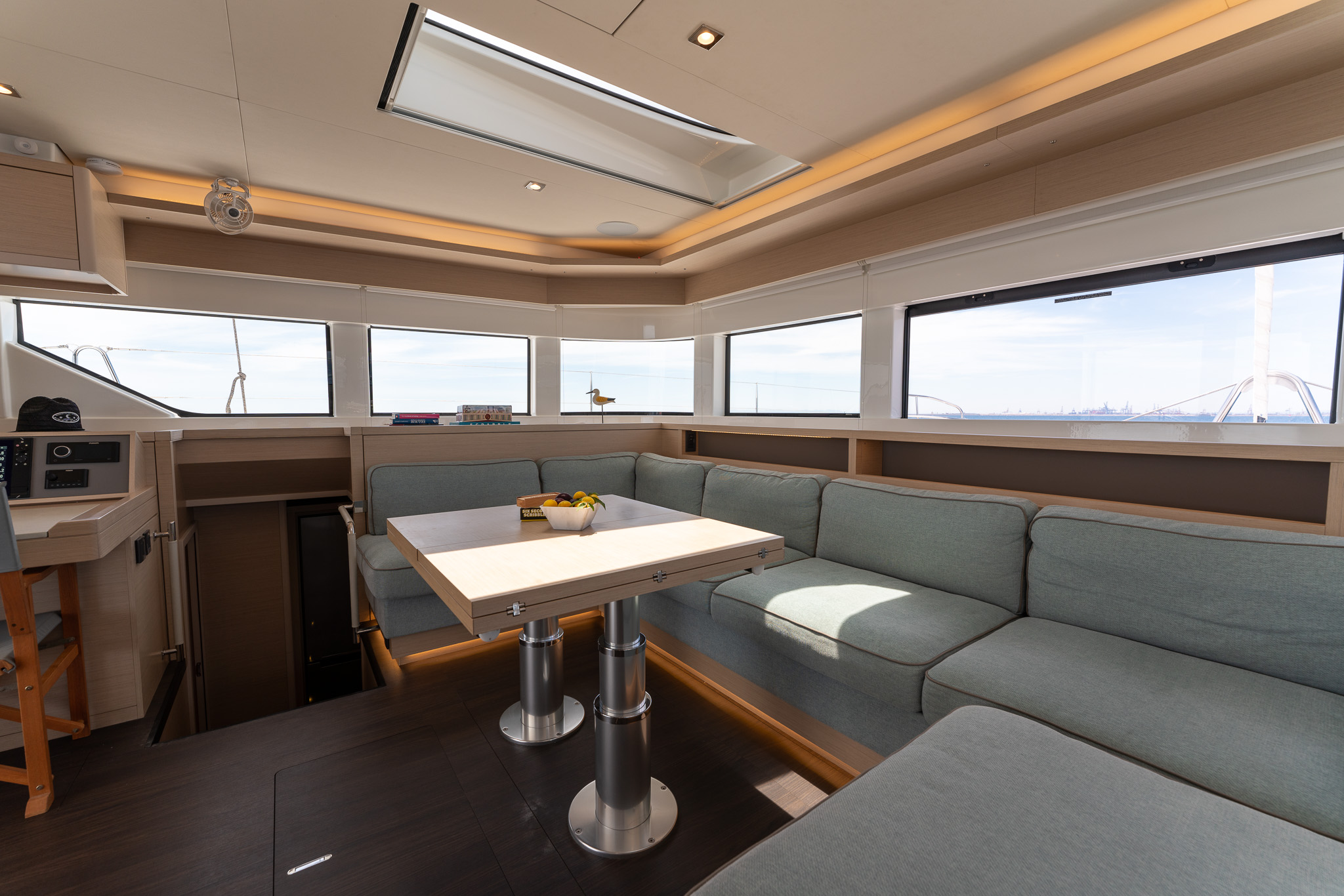 Spacious and light filled saloon with U-shaped sofa, wooden dining table, chart table