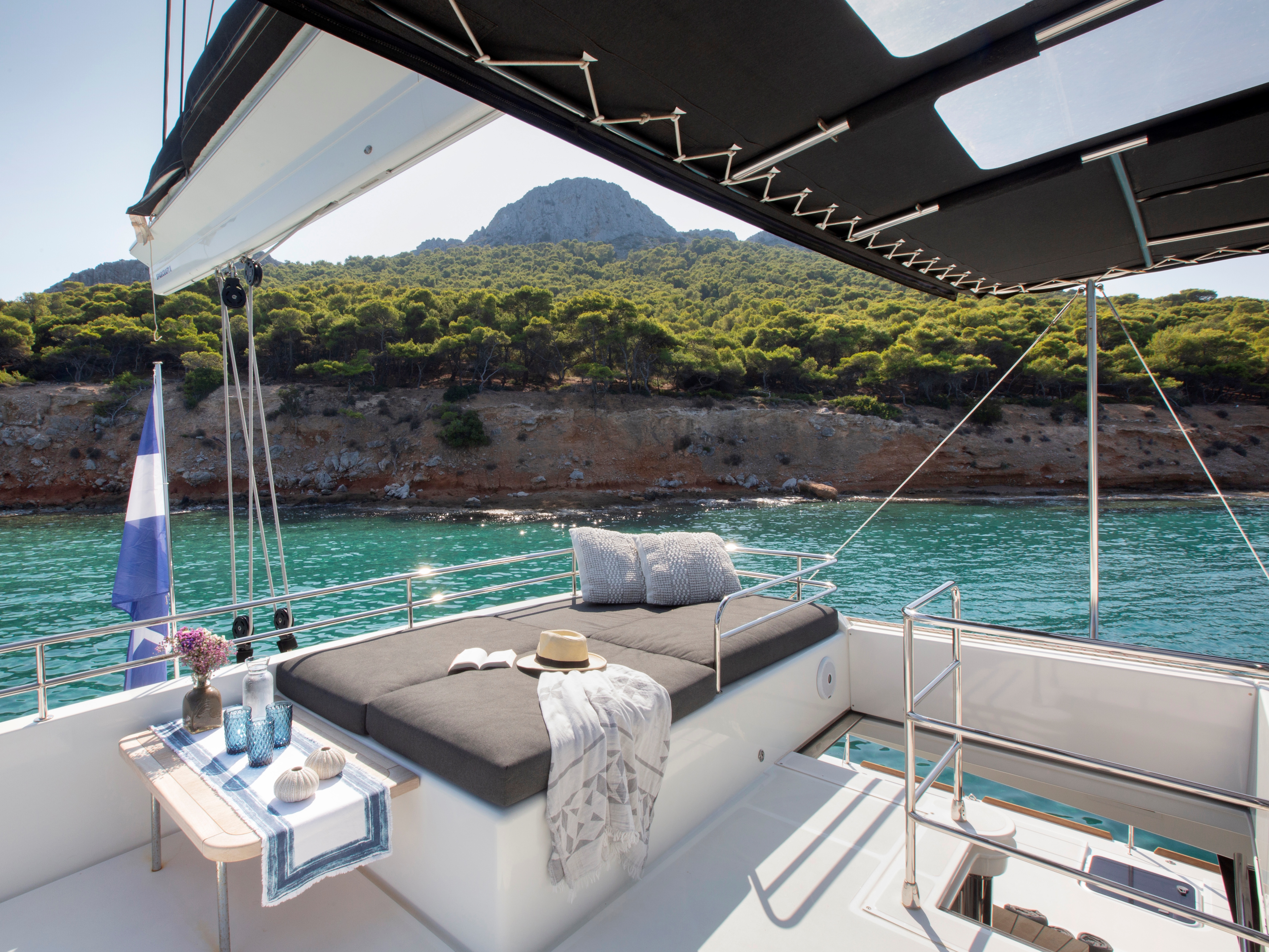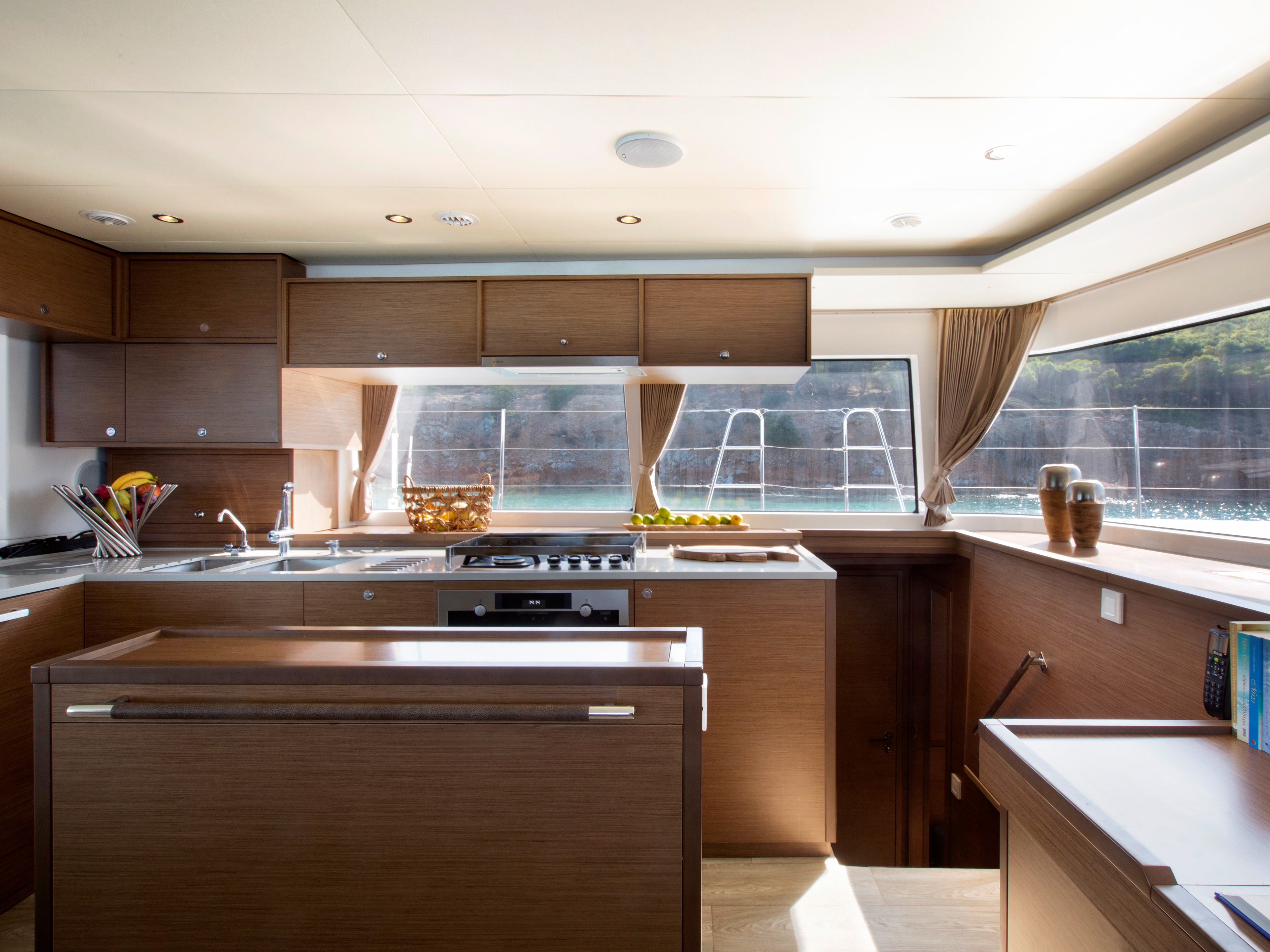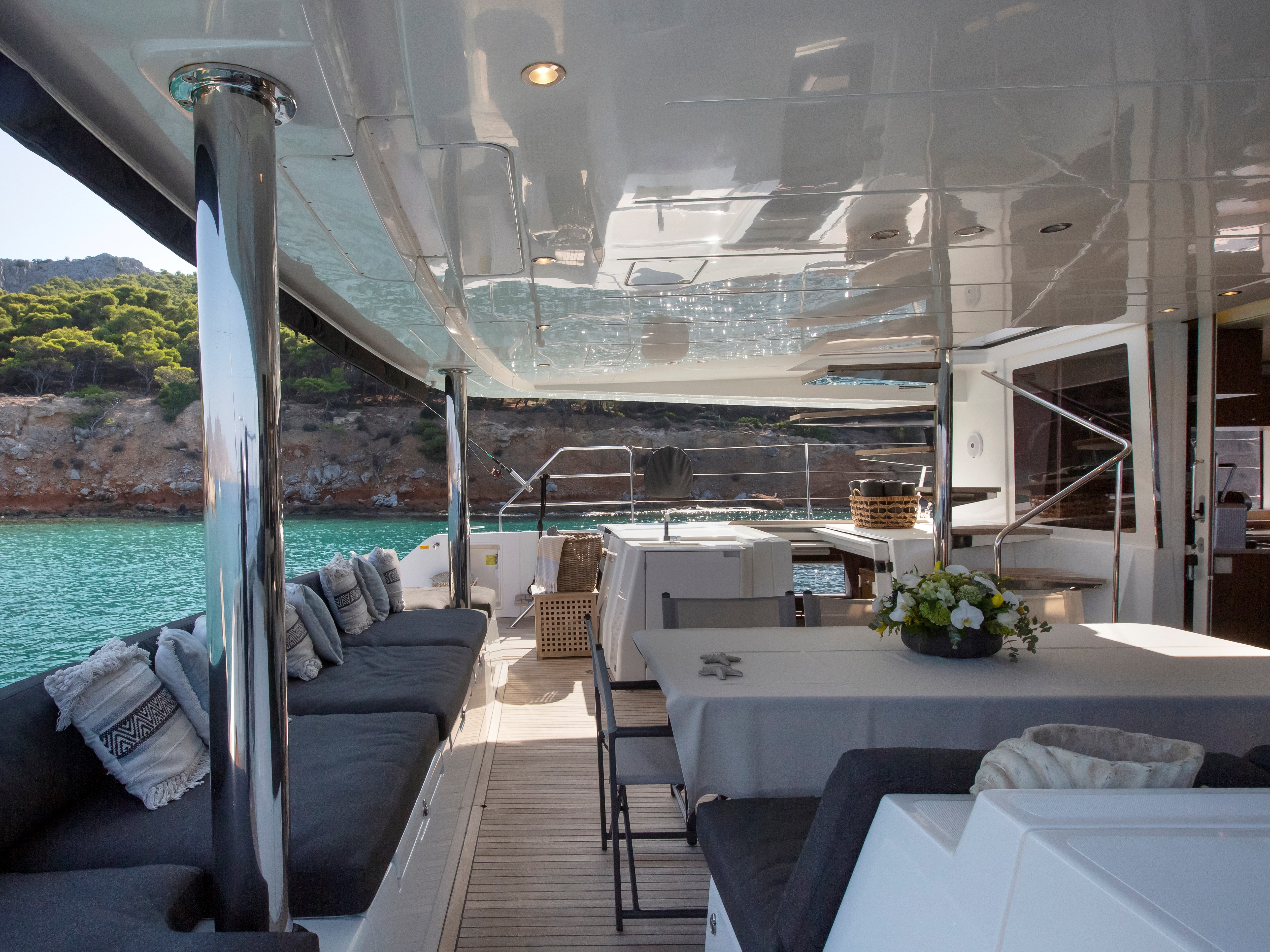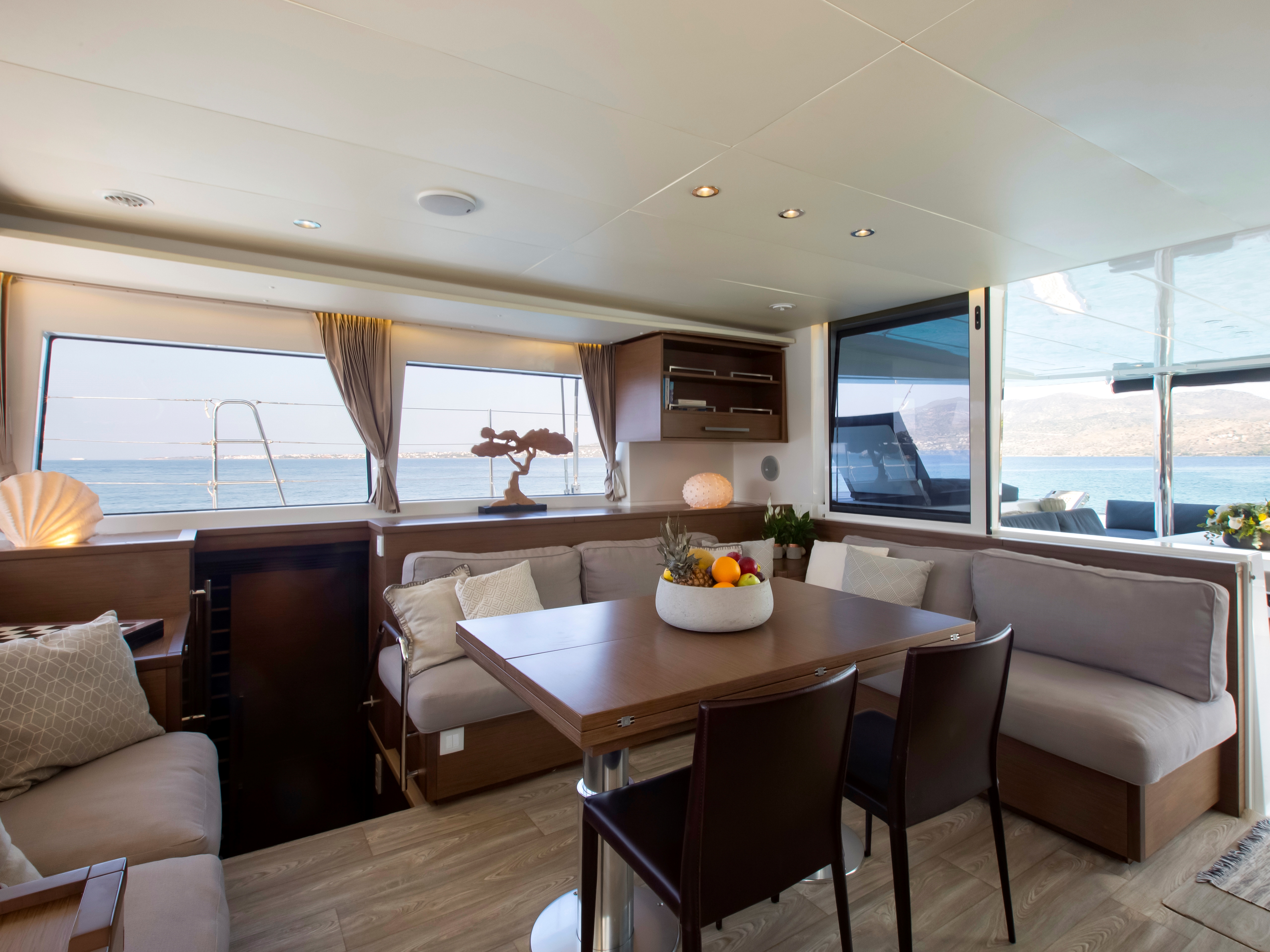 Cockpit and salon on one level. U-shaped settee with 3 storage lockers. Polished teak cockpit table. Resin countertop with sink and tap. 16 spotlights recessed in hard top ceiling. Aft crossbeam with 3 storage lockers and room for 2 x 10-person life rafts, stainless steel railing, storage for gas bottle (13kg / 28lbs). 3 storage lockers with access from the cockpit.