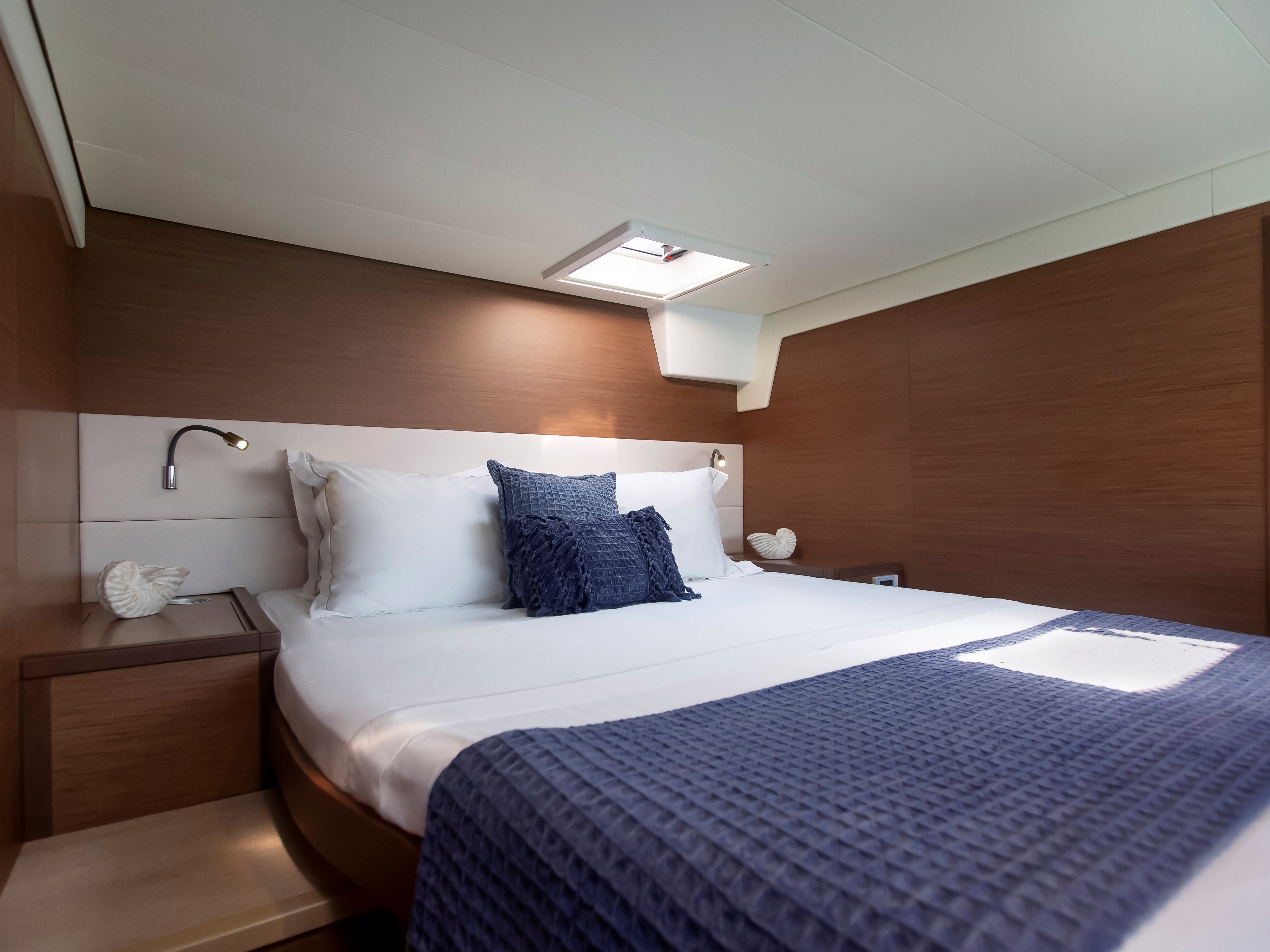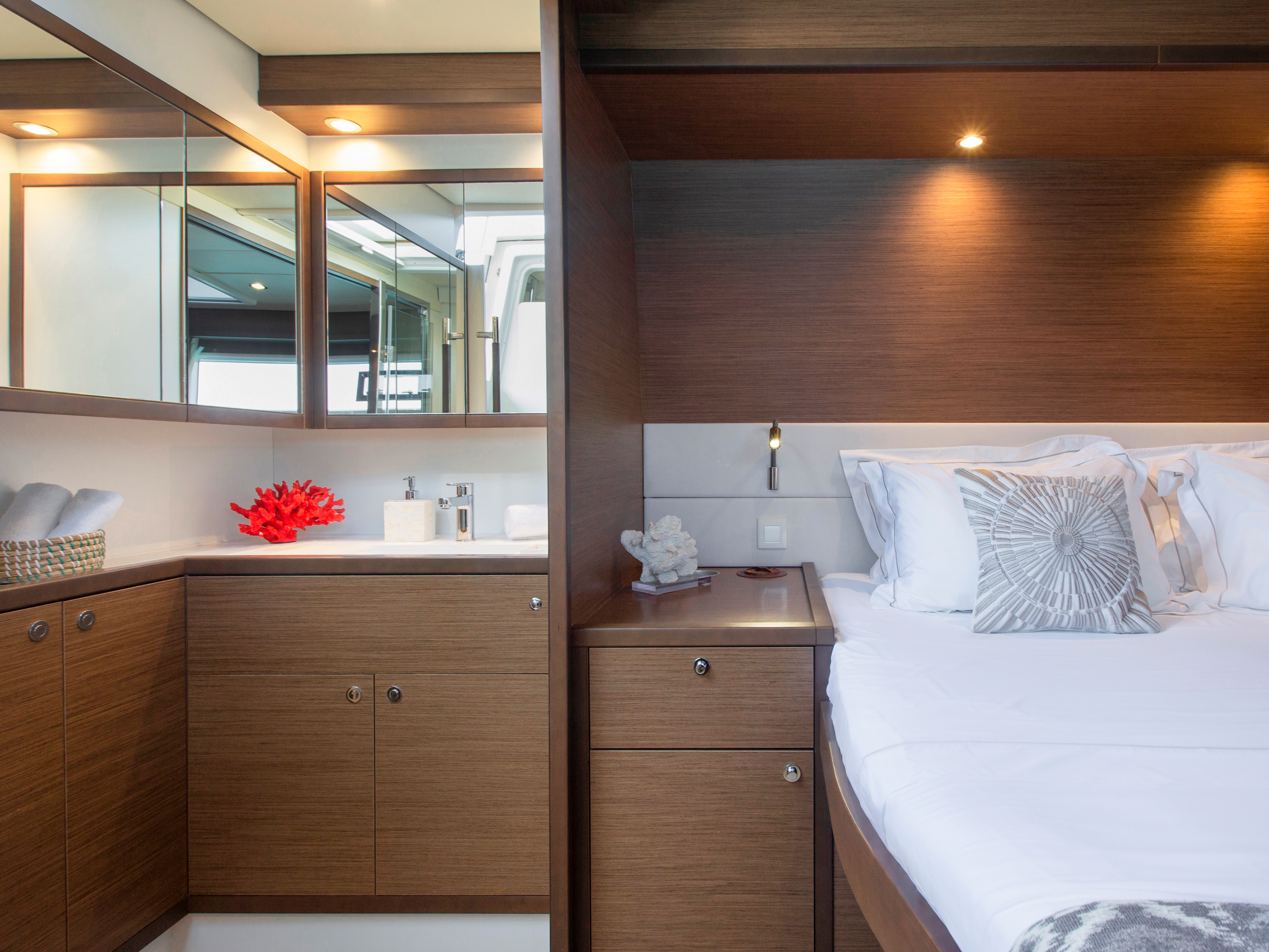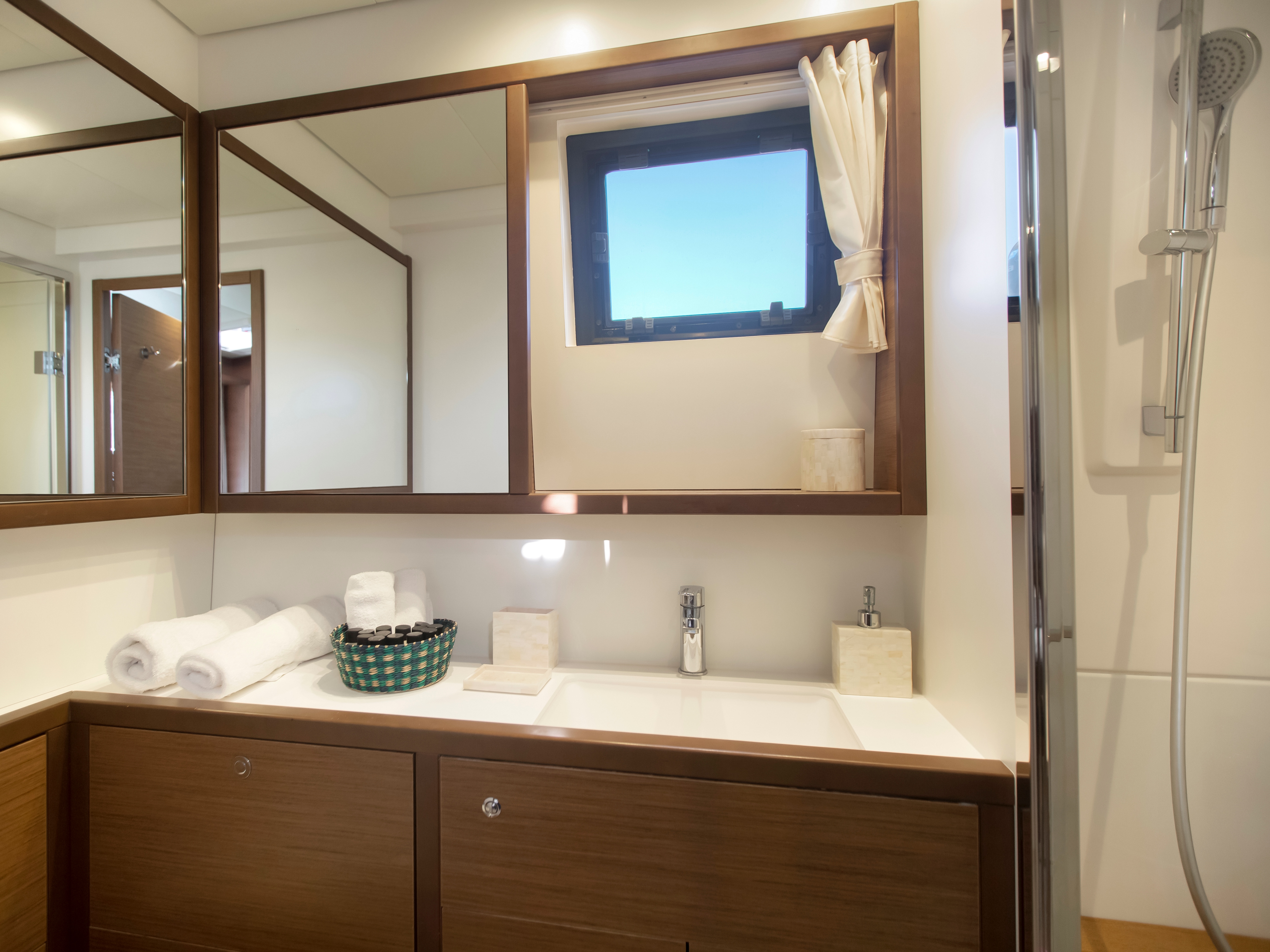 Cockpit and salon on one level. U-shaped settee with 3 storage lockers. Polished teak cockpit table. Resin countertop with sink and tap. 16 spotlights recessed in hard top ceiling. Aft crossbeam with 3 storage lockers and room for 2 x 10-person life rafts, stainless steel railing, storage for gas bottle (13kg / 28lbs). 3 storage lockers with access from the cockpit.