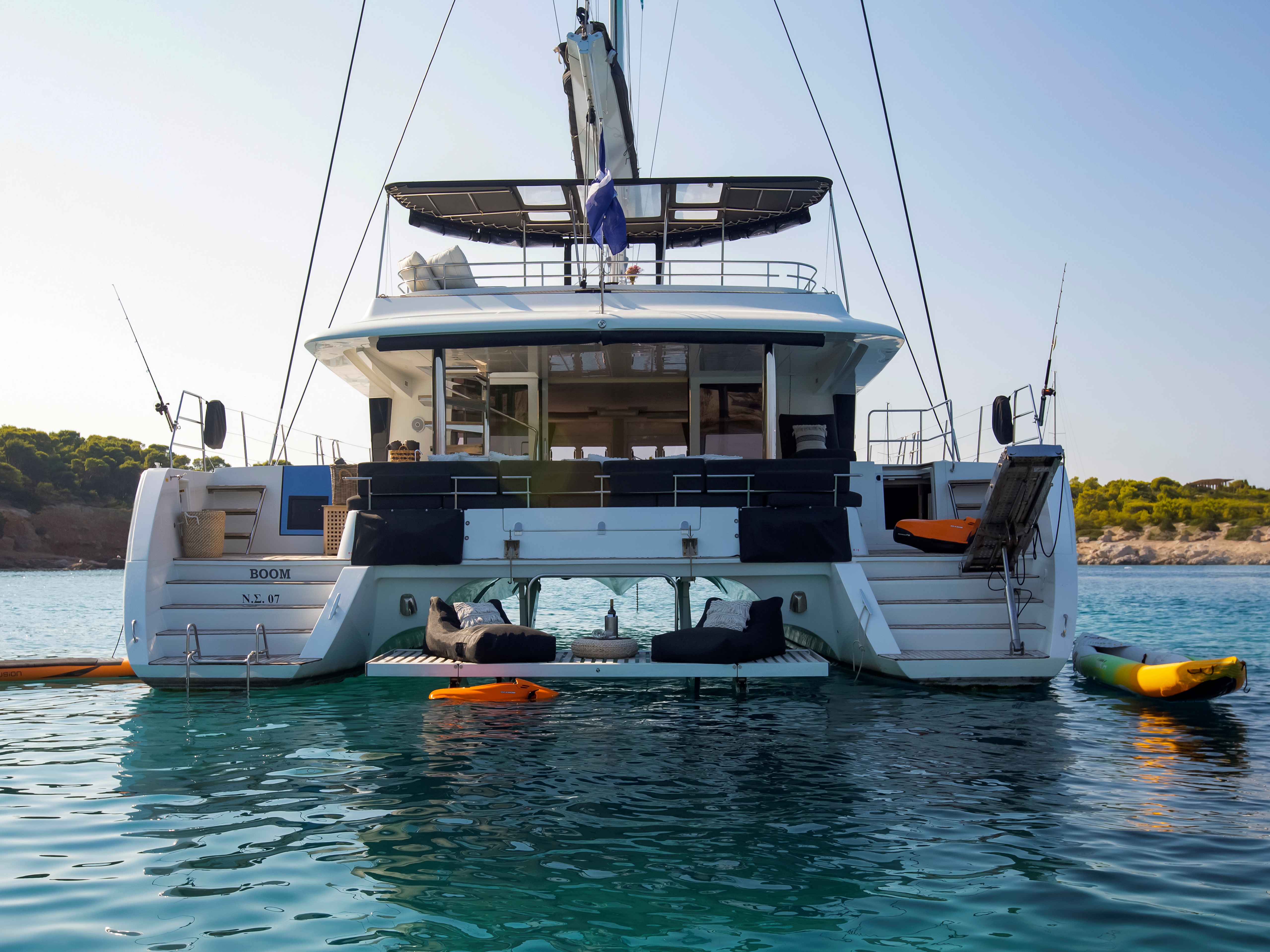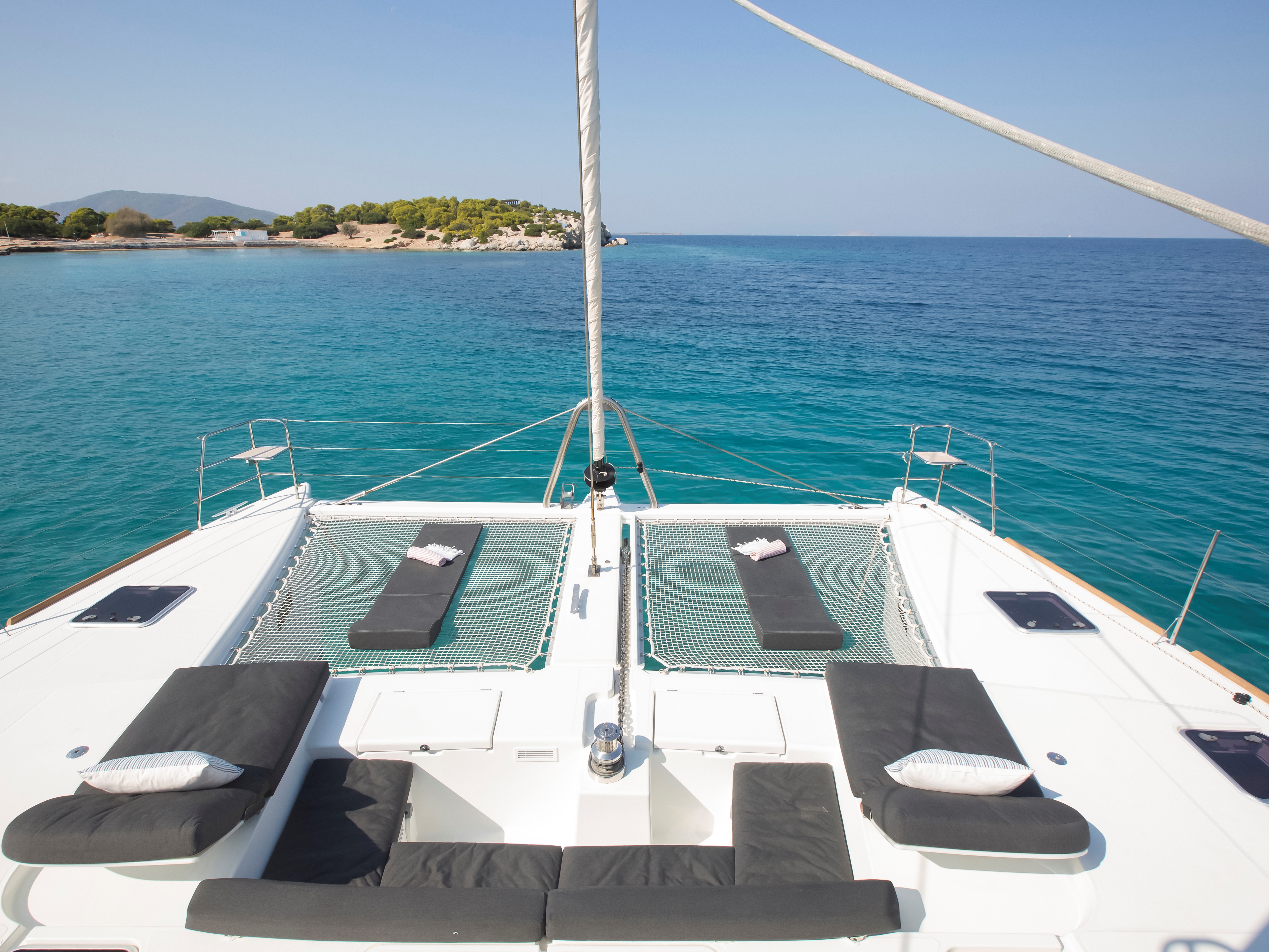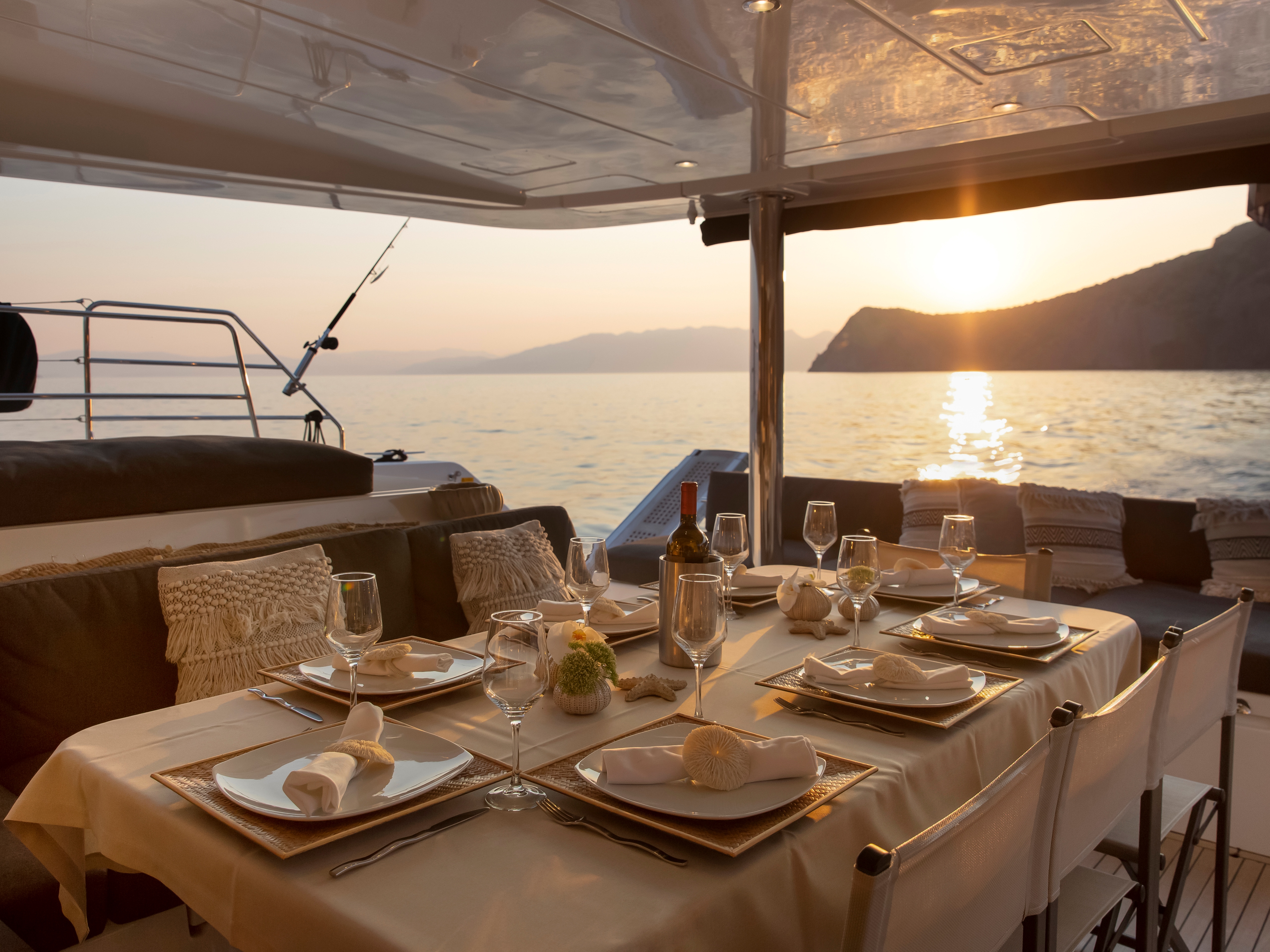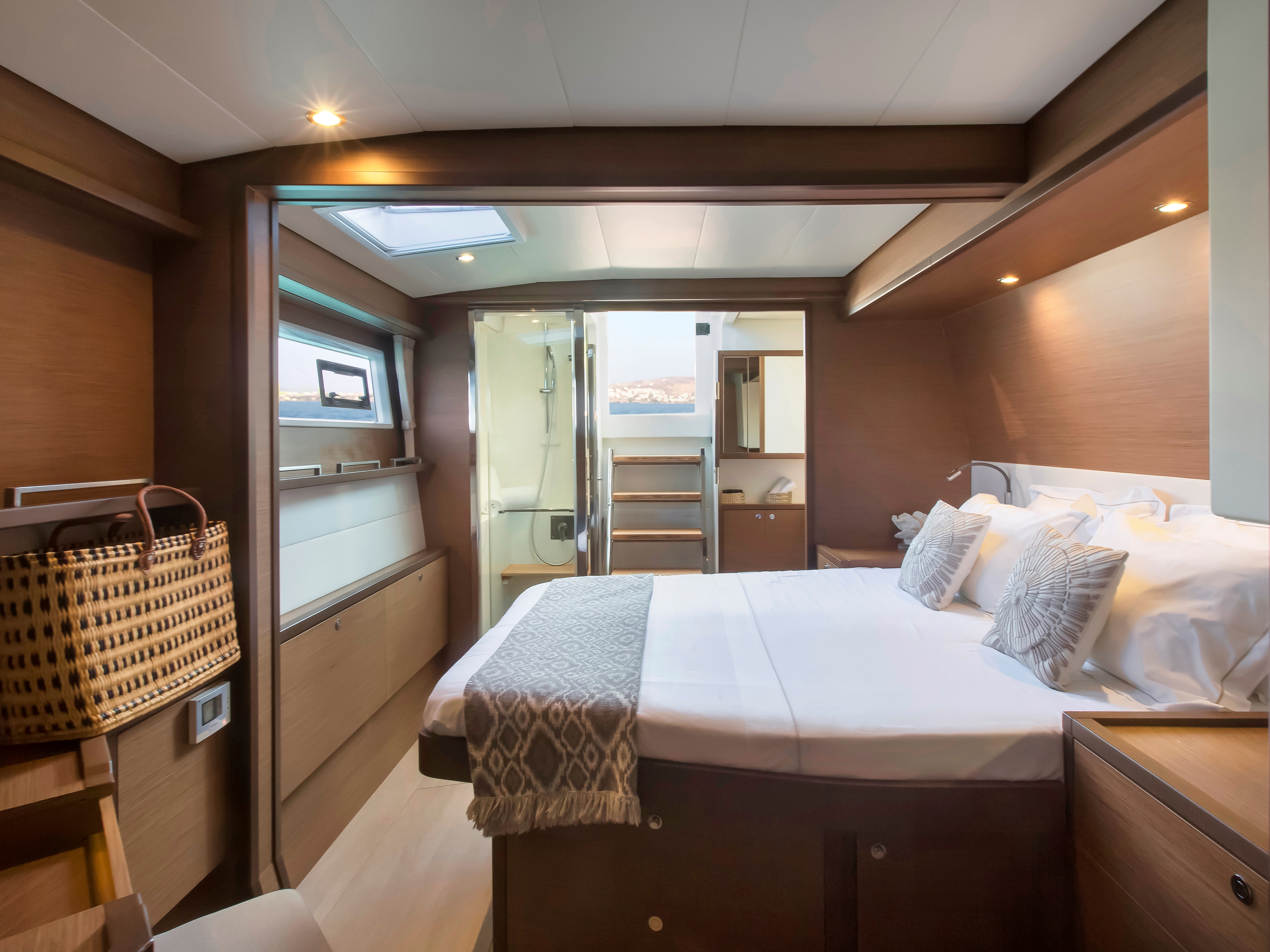 Cockpit and salon on one level. U-shaped settee with 3 storage lockers. Polished teak cockpit table. Resin countertop with sink and tap. 16 spotlights recessed in hard top ceiling. Aft crossbeam with 3 storage lockers and room for 2 x 10-person life rafts, stainless steel railing, storage for gas bottle (13kg / 28lbs). 3 storage lockers with access from the cockpit.