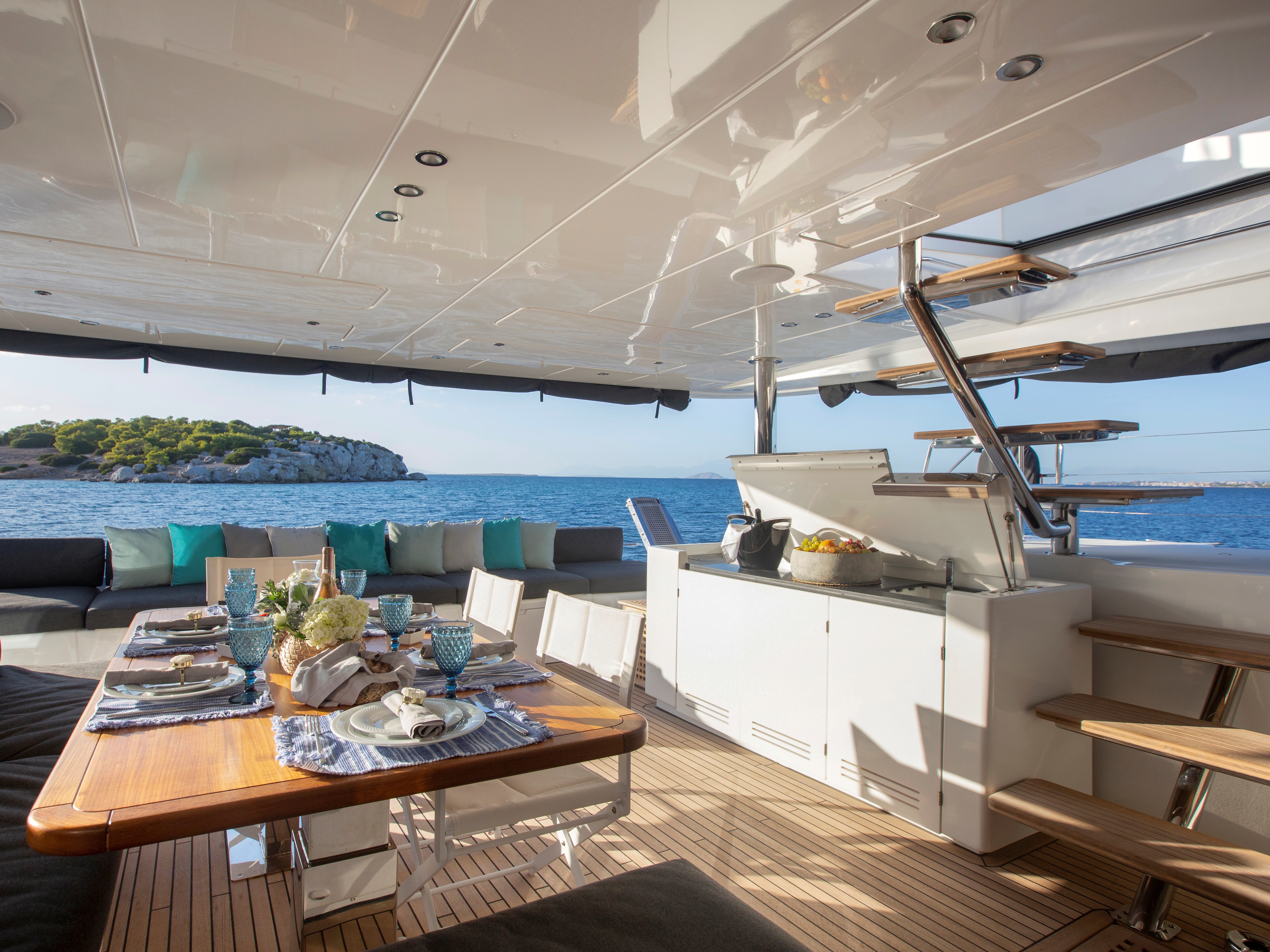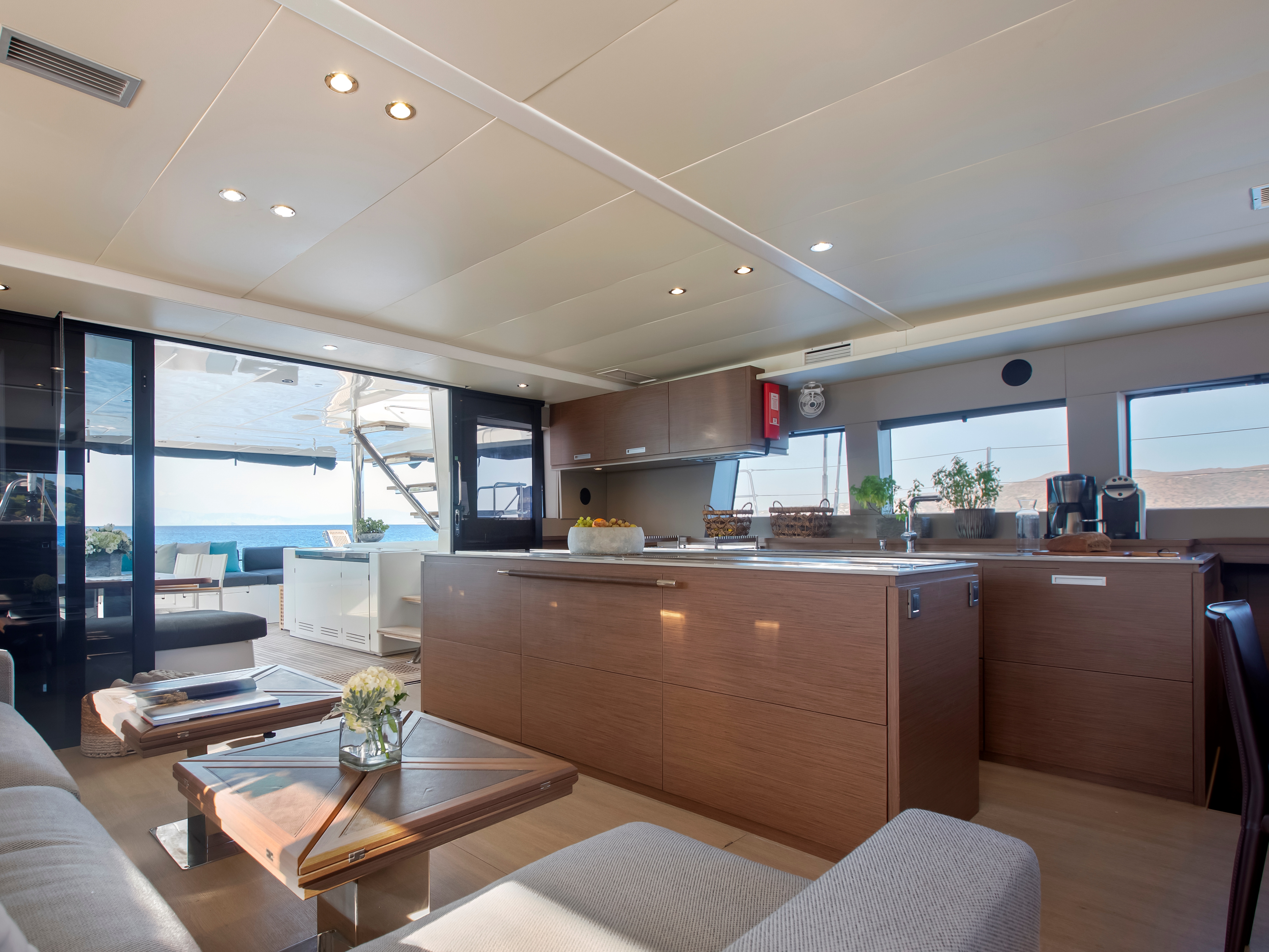 The central galley with panoramic views, fully equipped with double stainless sink, 5 burner hob, oven, microwave, full height fridge/ freezer, washer/dryer, dishwasher, extractor fan & ample storage