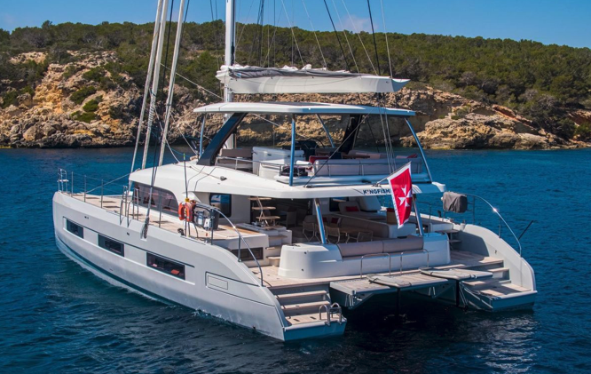 As you step on board the Lagoon SIXTY 5 you will appreciate her massive space. Comfortable, luxurious, a volumous home-away-from-home for eight guests. The flybridge is a beautifully appointed deck with two helm stations and unobstructed views. Kingfisher V has a galley-down layout with four double cabins, each with bathroom ensuite. The impressive main saloon is given over entirely for guests to enjoy, with the galley in the aft port hull. The aft cockpit and foredeck are great areas for entertaining and sunbathing. Technically she is very complete and includes MCA certification.