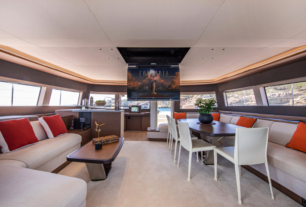 In the main salon, a large dining table is positioned on the starboard side, with a L-shaped sofa and lounge area by a low coffee table on the port side. The salon features a bar area where owner and guests can enjoy breakfast or a snack, or prepare a drink during their stay. With direct access from the salon to the forward terrace, the comfort never ends. This space features sofas and two subeds with a canopy to shade the lounge area. Perfect for diving gear and water toy storage, this area is versatile and can be used for whatever you make of it.