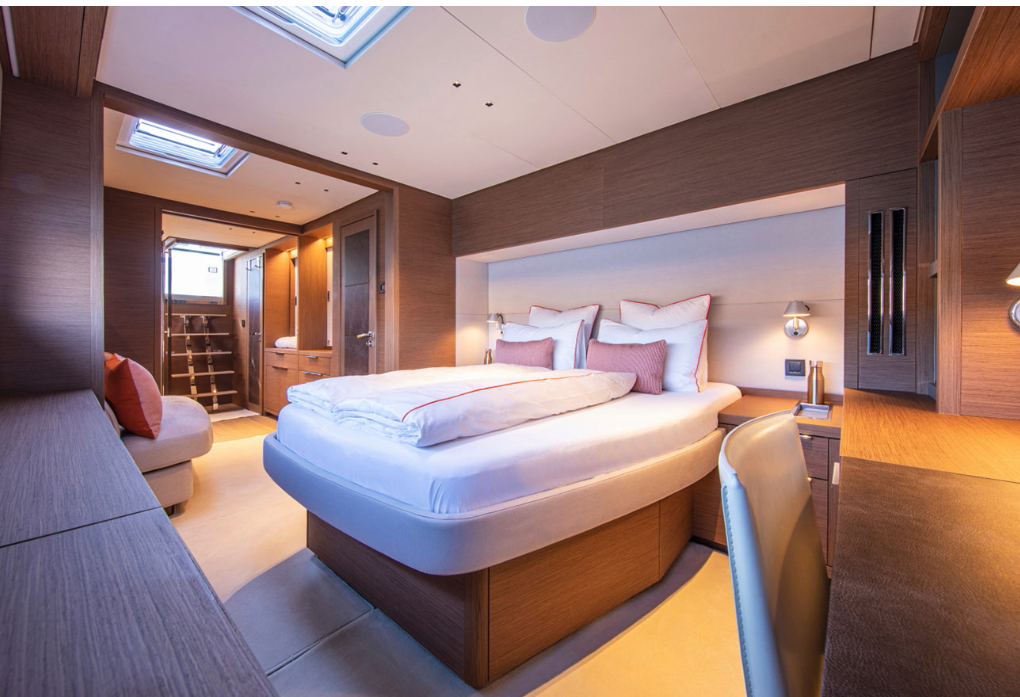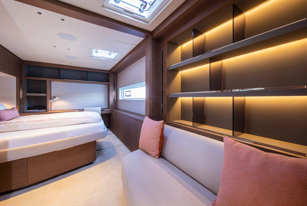 This same design concept has been applied throughout the entirety of the SIXTY 5, especially in the guest cabins. With skylights overhead, an exceptional amount of natural light pours in from all angles of the cabin. As you move from space to space you feel the interior’s harmony, with the interior finish in Alpi walnut with open-grain varnish throughout the catamaran.