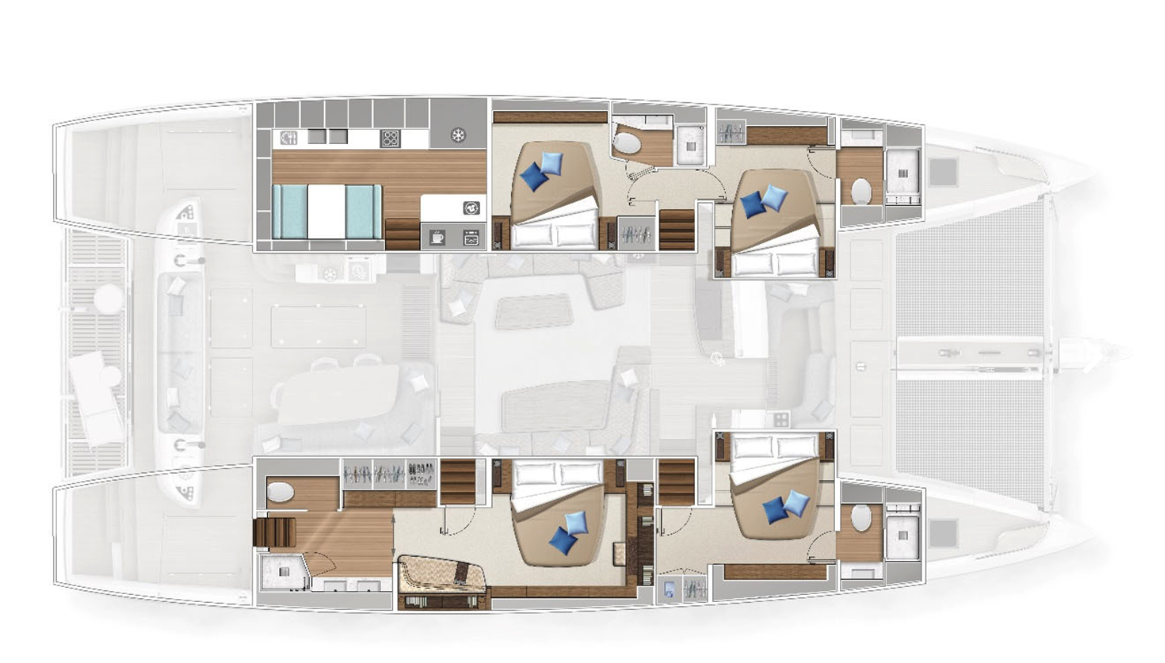 The starboard aft side of the catamaran is all about the owner’s suite. Combining signature Lagoon luxury, comfort, and style, the owner’s cabin is a particular highlight aboard the SIXTY 5. Utilizing and improving upon past designs, Lagoon has included the best features including a private terrace which gives the owner direct access to the sea and sun. Forward of this side of the hull lies a double VIP cabin which offers its guests a private dressing area, a full length mirror, and an impressively spacious shower.