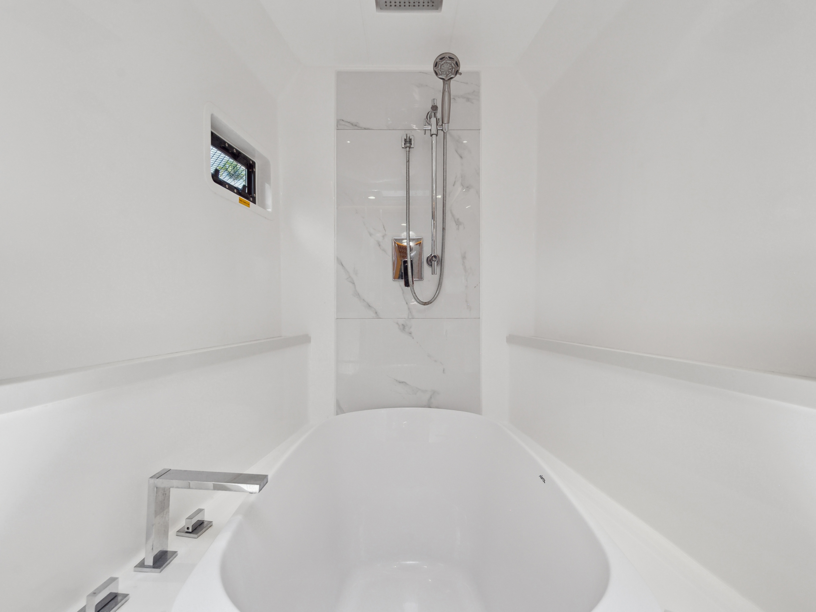 Port hull has two guest cabins. Twin berth cabin with ensuite bathroom, aft. Seaview berth and spacious ensuite bathroom amidships and forward.