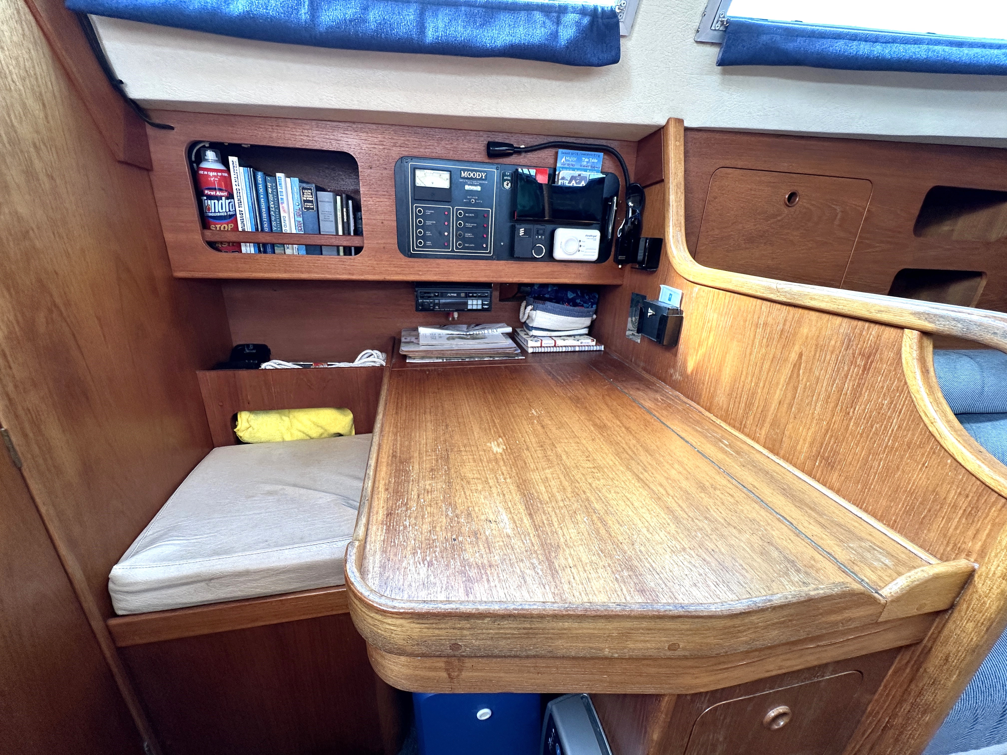 Generous sized chart table and navigation area with navigation equipment and chart storage