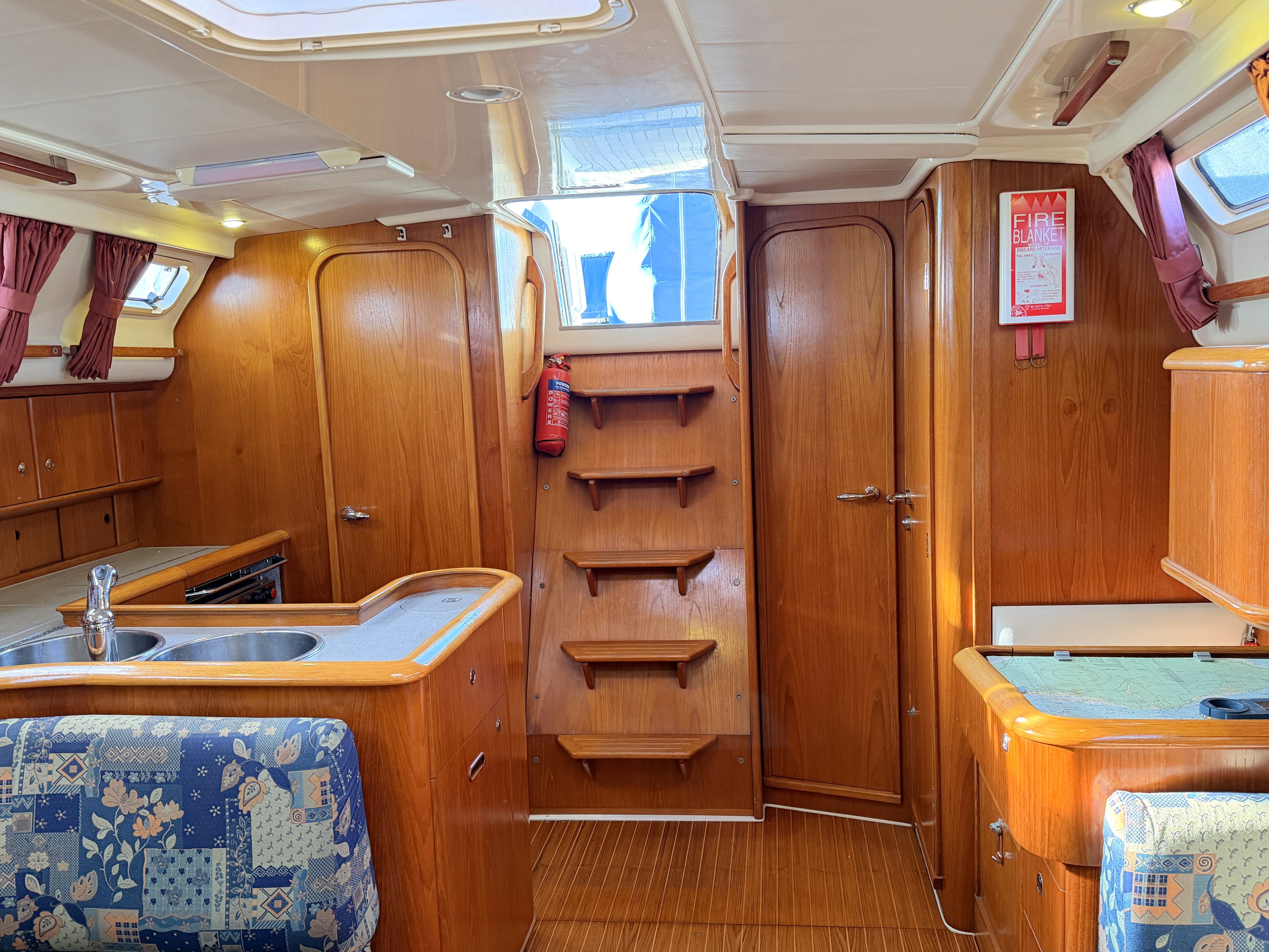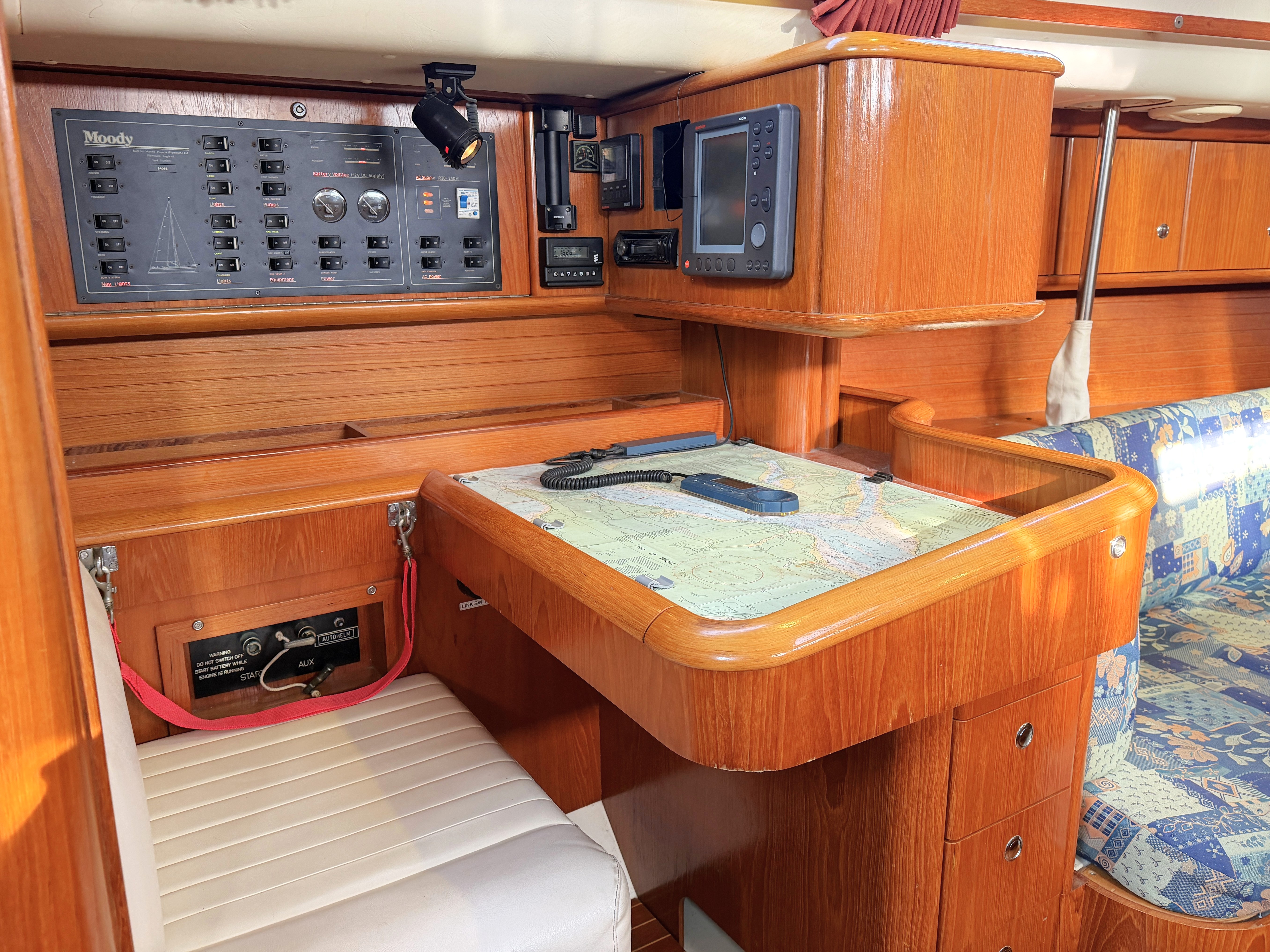 Forward facing chart table to port with seat. 3 x draws, Electrical 12v/240v distribution panel, Battery volt meters, Fresh water gauge & Fuel gauge. Autohem Multi, VHF and Yeoman plotter. Sony stereo radio / CD.