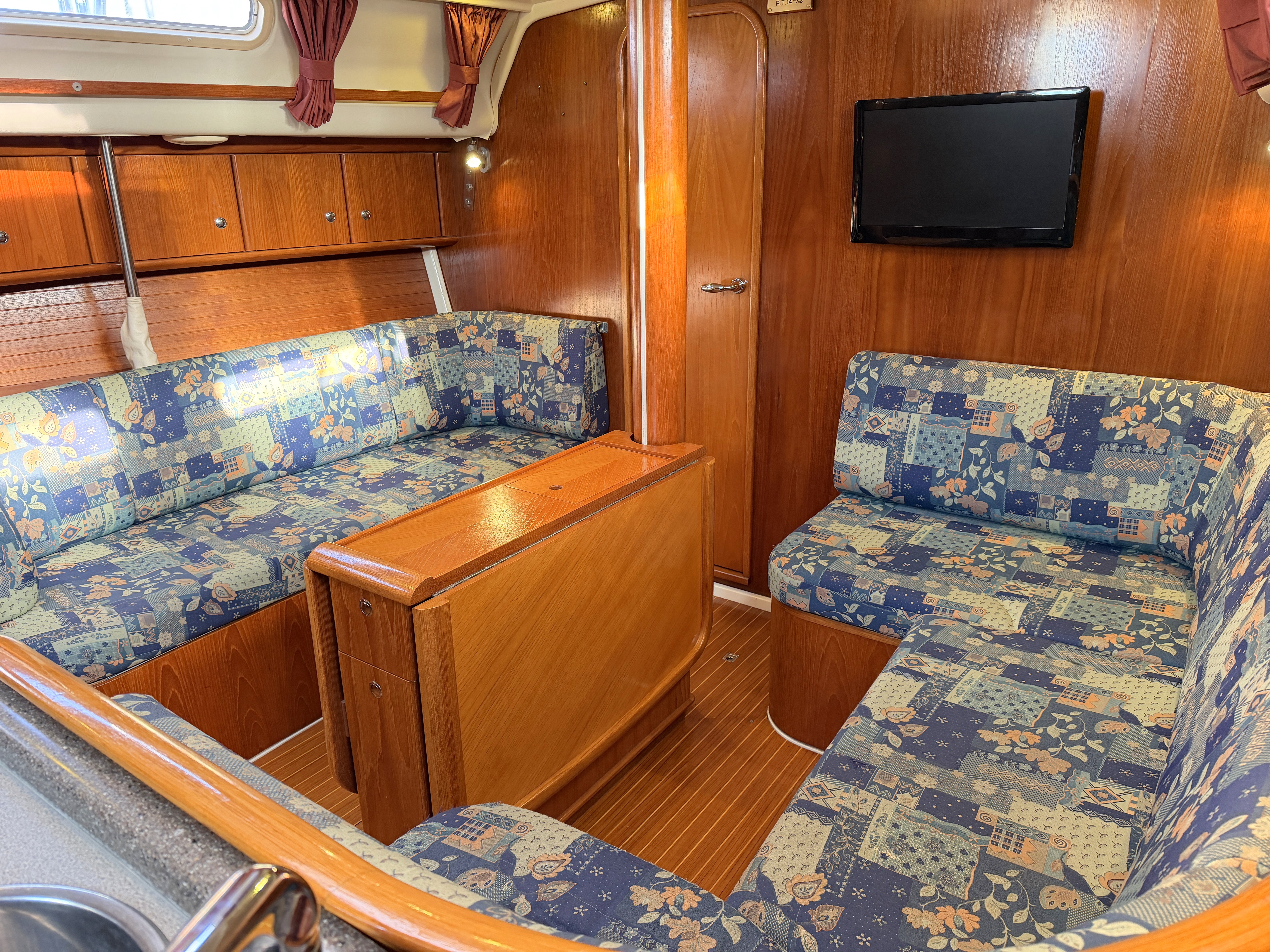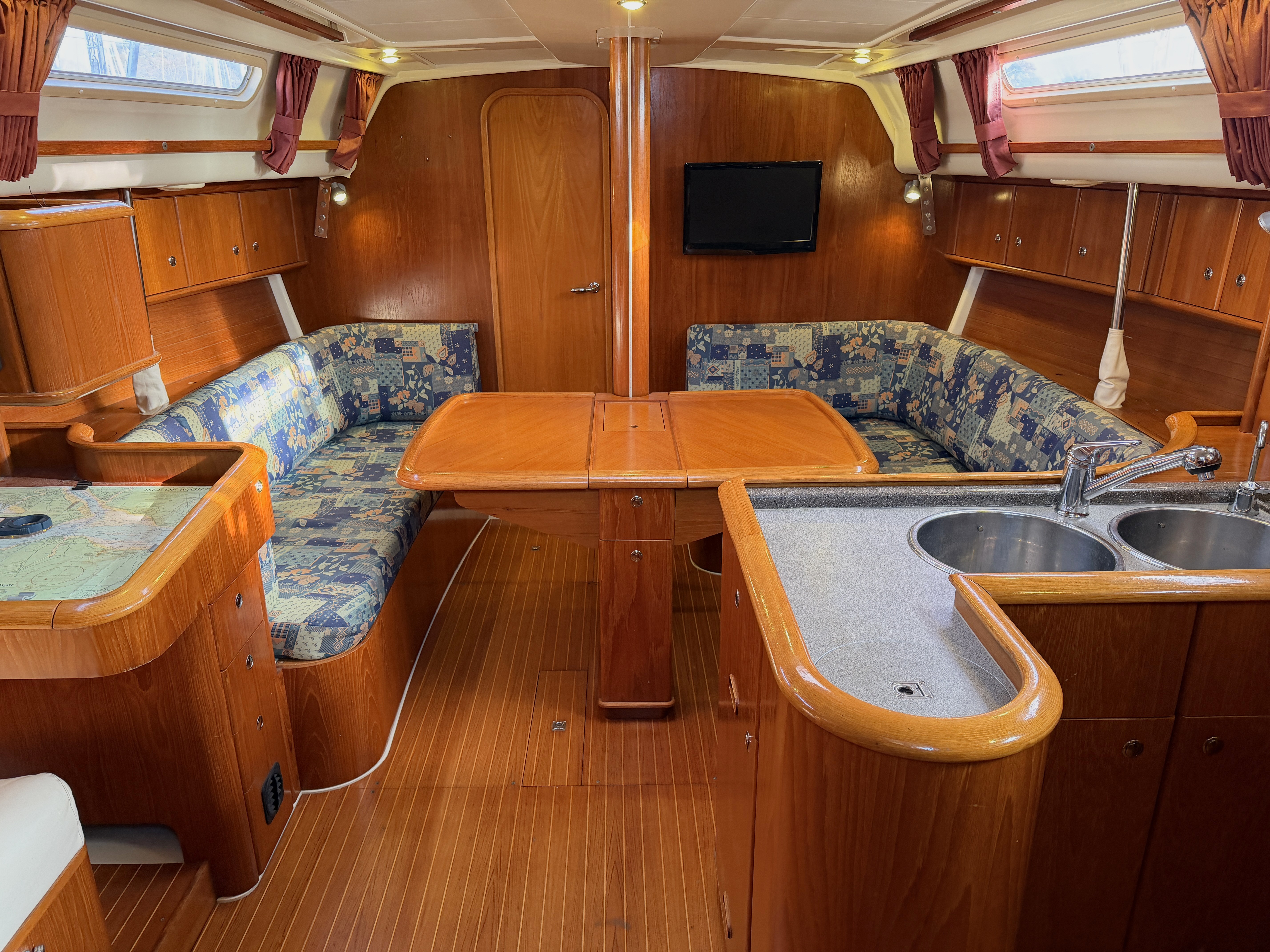 U shaped settee to starboard with drop leaf table with bottle storage & drawers. Settee/berth with a trotter box to port forward, lee cloth. Cupboards either side. TV.