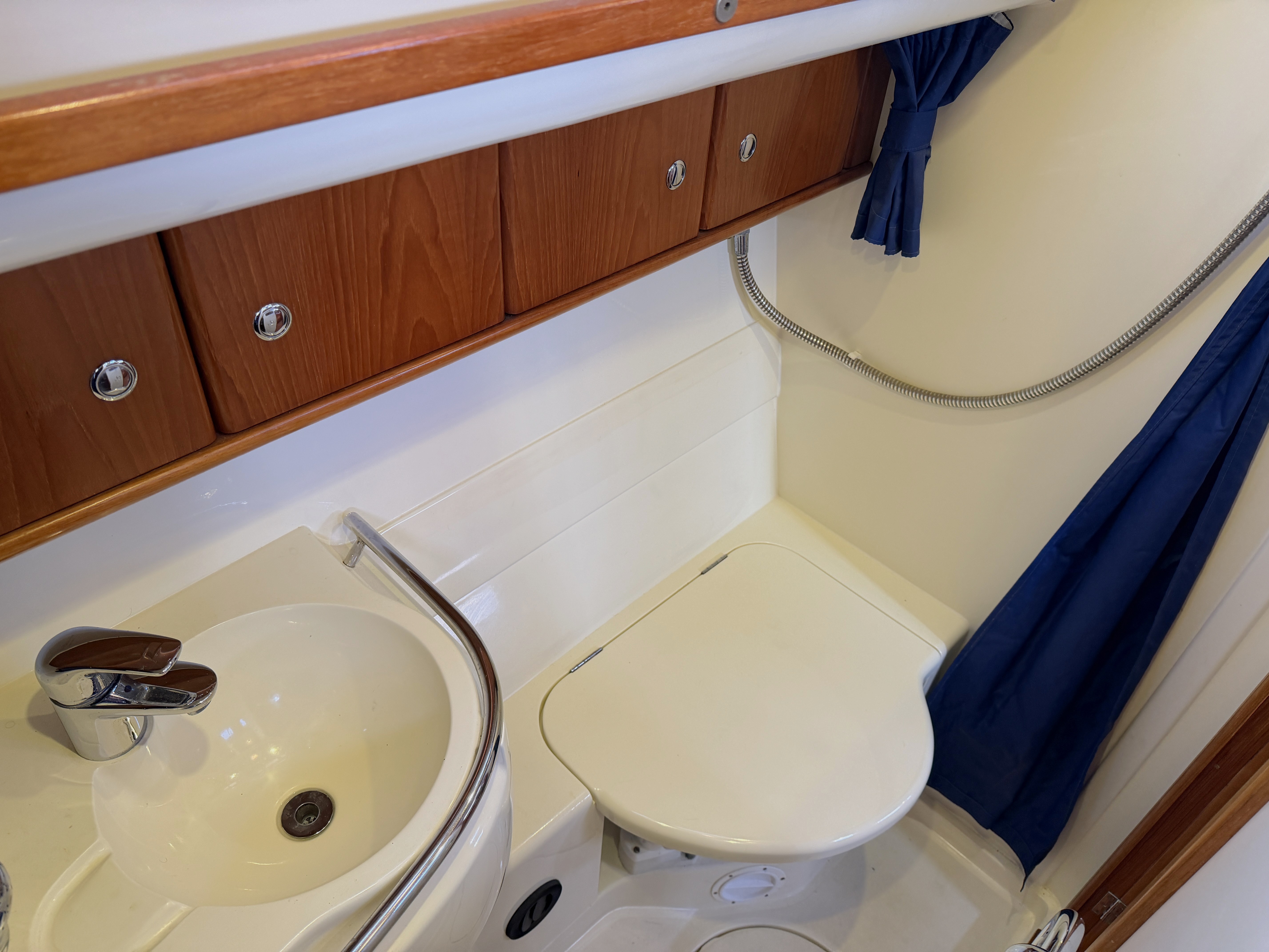 On the port side, aft of navigation station and doubles as a day heads with access from the saloon and the port aft cabin. Marine w.c, hot & cold water, hand basin and shower. Cupboards.