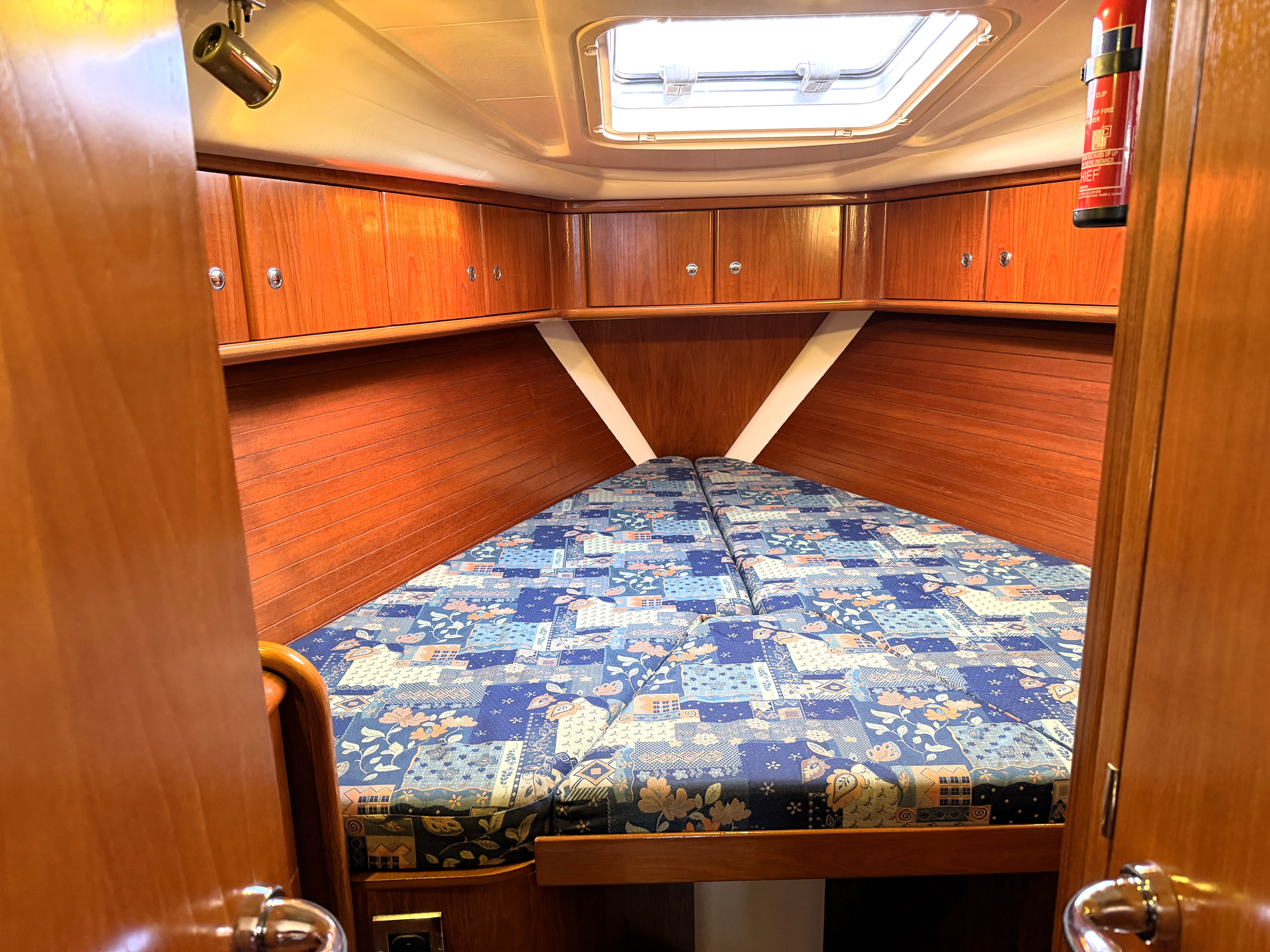 Access aft of galley on starboard side, large double berth, Wet locker, Locker with microwave ocean. Cupboards. Escape hatch to cockpit. Knock through access panel between each aft cabin to allow access to escape hatch from either cabin